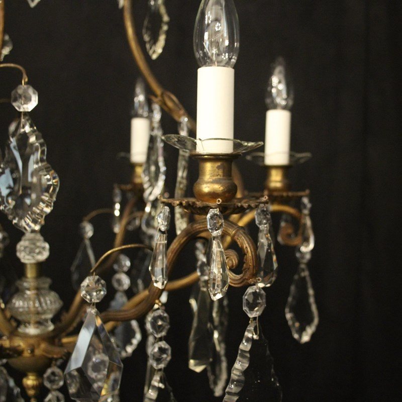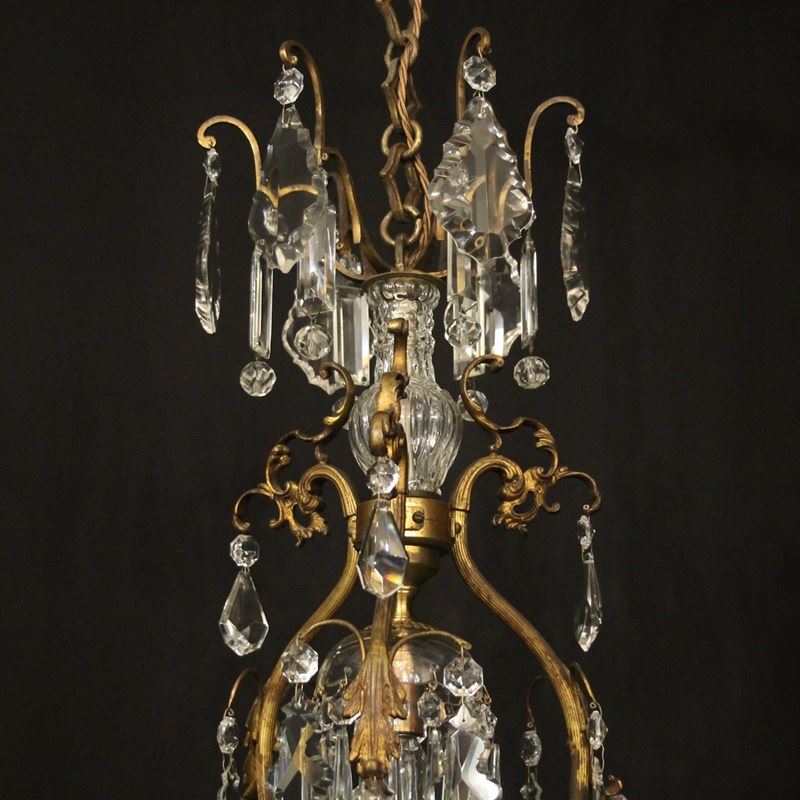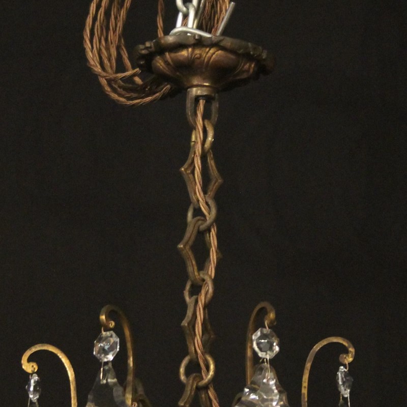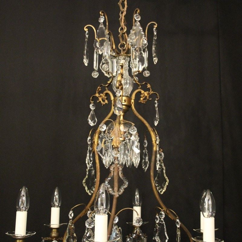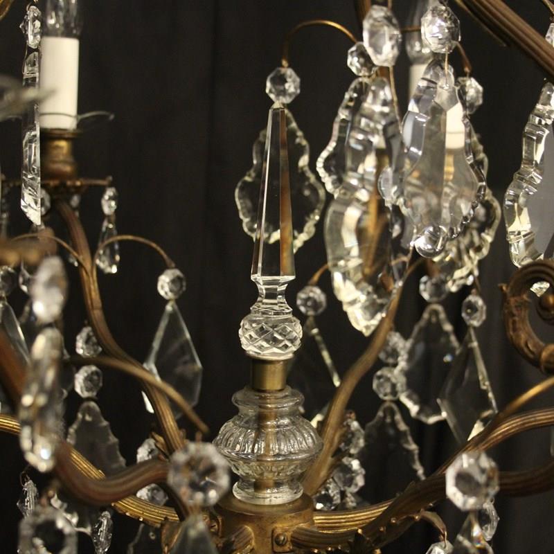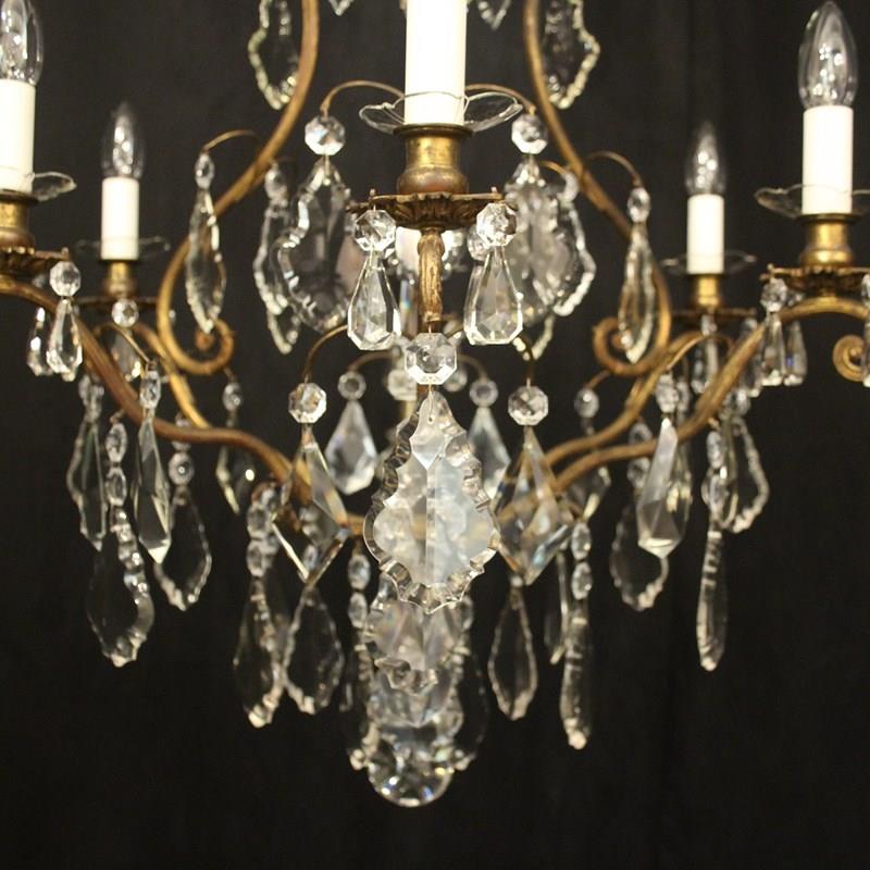 A French gilded brass and crystal 7 light birdcage form antique chandelier, the reeded scrolling arms with glass bobeche drip pans and bulbous candle sconces, issuing from a cage form interior with a single inverted light fitting with prismatic spike and glass baluster scrolling canopy, decorated overall with crystal faceted pendants and having the original chain and ceiling rose. Fully rewired and PAT tested. All our chandeliers come with bulbs and ceiling fixings.