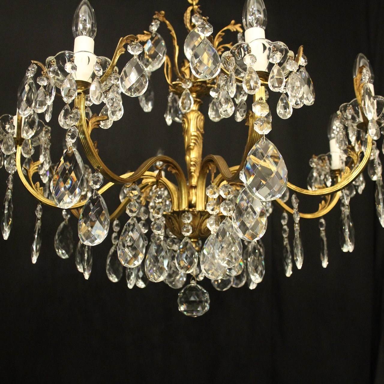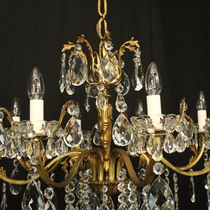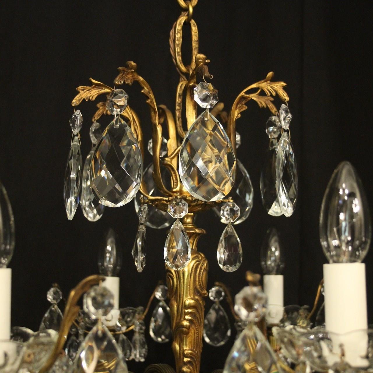 A quality French gilded bronze and crystal 8 light antique chandelier, the reeded leaf clad scrolling arms with crystal glass bobeche drip pans, issuing from an ornate foliated central column with scrolling leaf canopy, decorated overall in double pear faceted crystal pendants and having the original chain and ceiling rose. Great colour and nice wide proportions. Fully rewired and PAT tested. All our chandeliers come with ceiling fixings and spare bulbs.