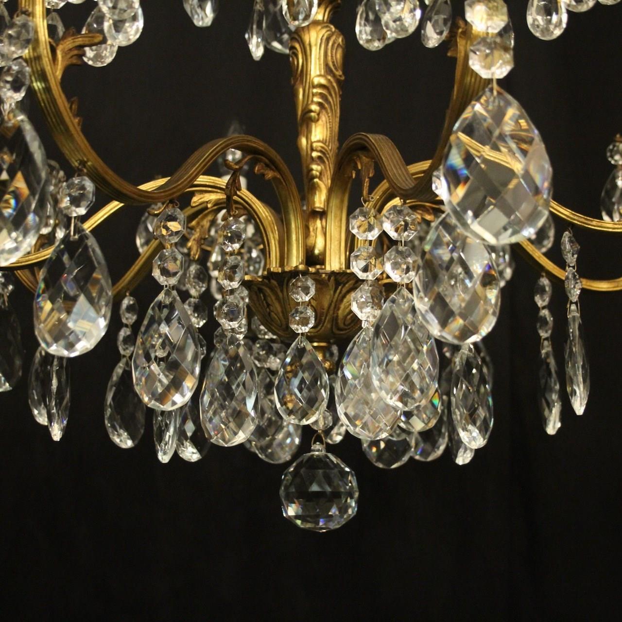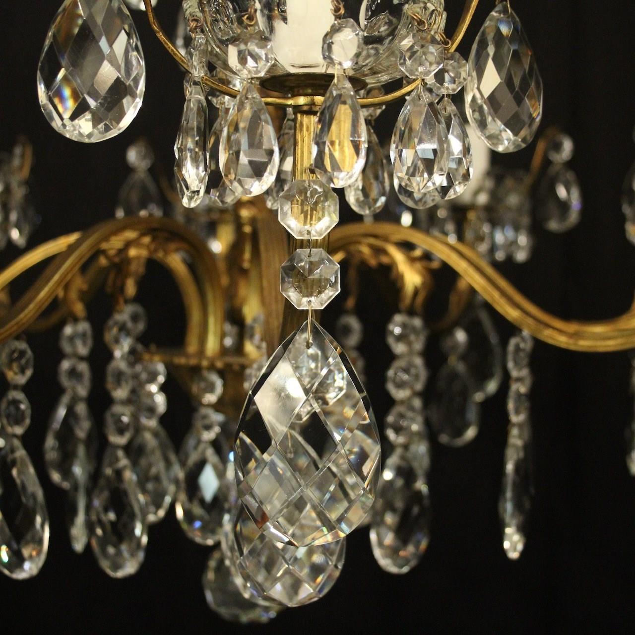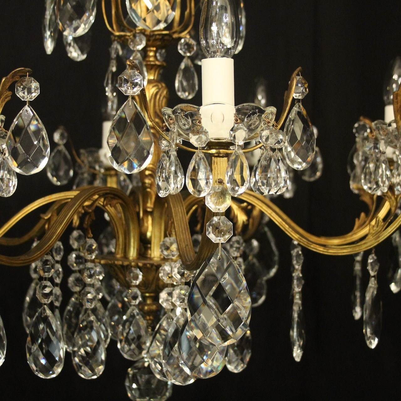 A quality French gilded bronze and crystal 8 light antique chandelier, the reeded leaf clad scrolling arms with crystal glass bobeche drip pans, issuing from an ornate foliated central column with scrolling leaf canopy, decorated overall in double pear faceted crystal pendants and having the original chain and ceiling rose. Great colour and nice wide proportions. Fully rewired and PAT tested. All our chandeliers come with ceiling fixings and spare bulbs.