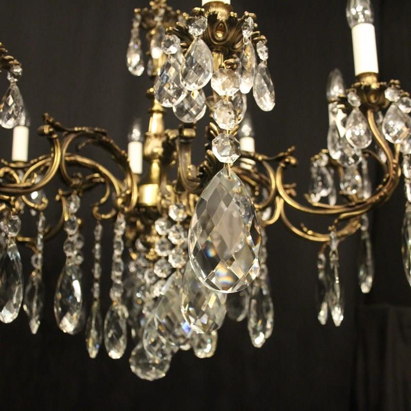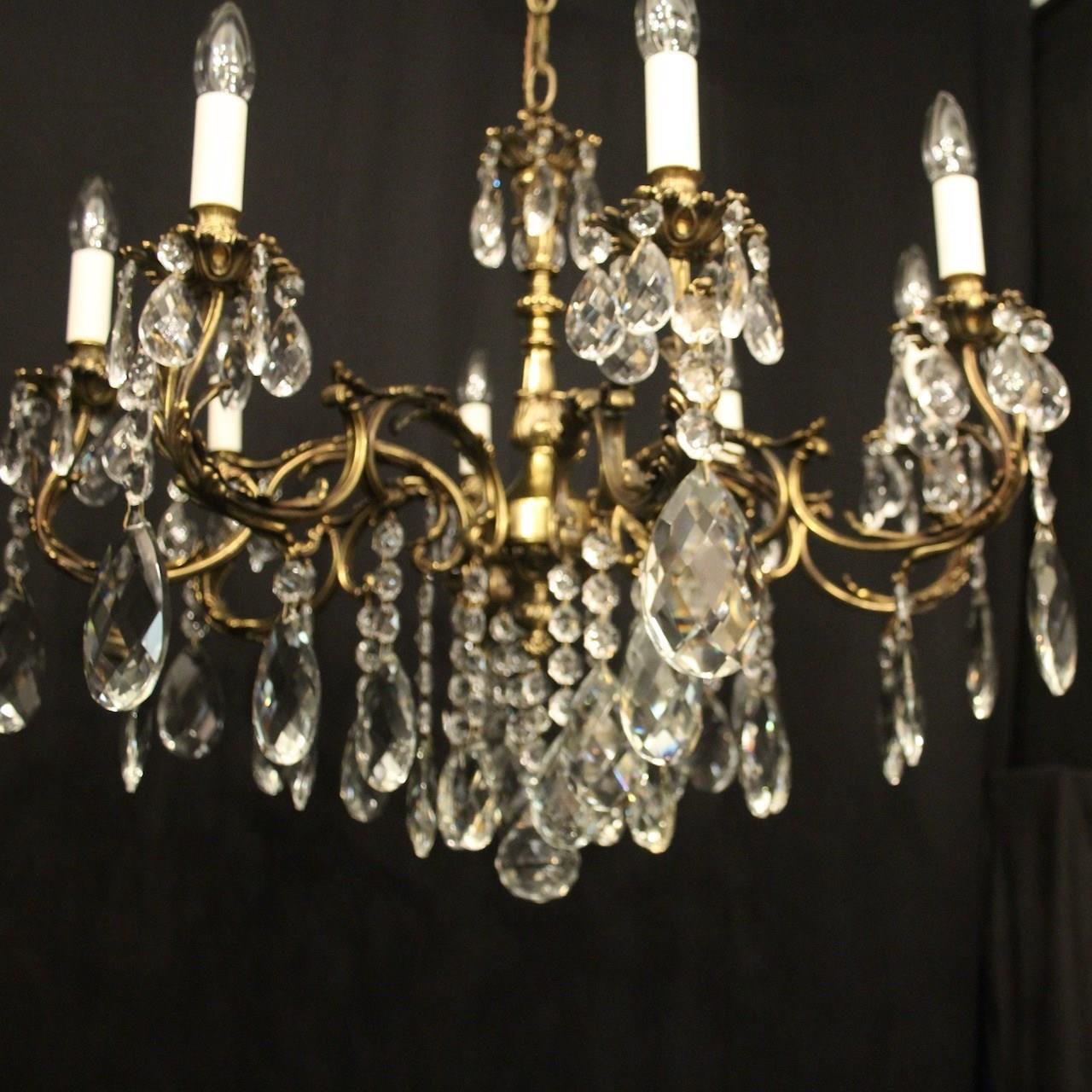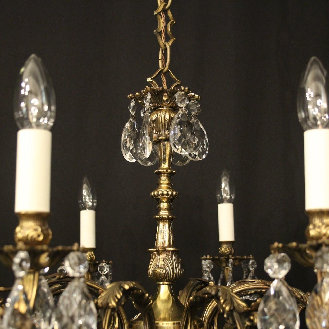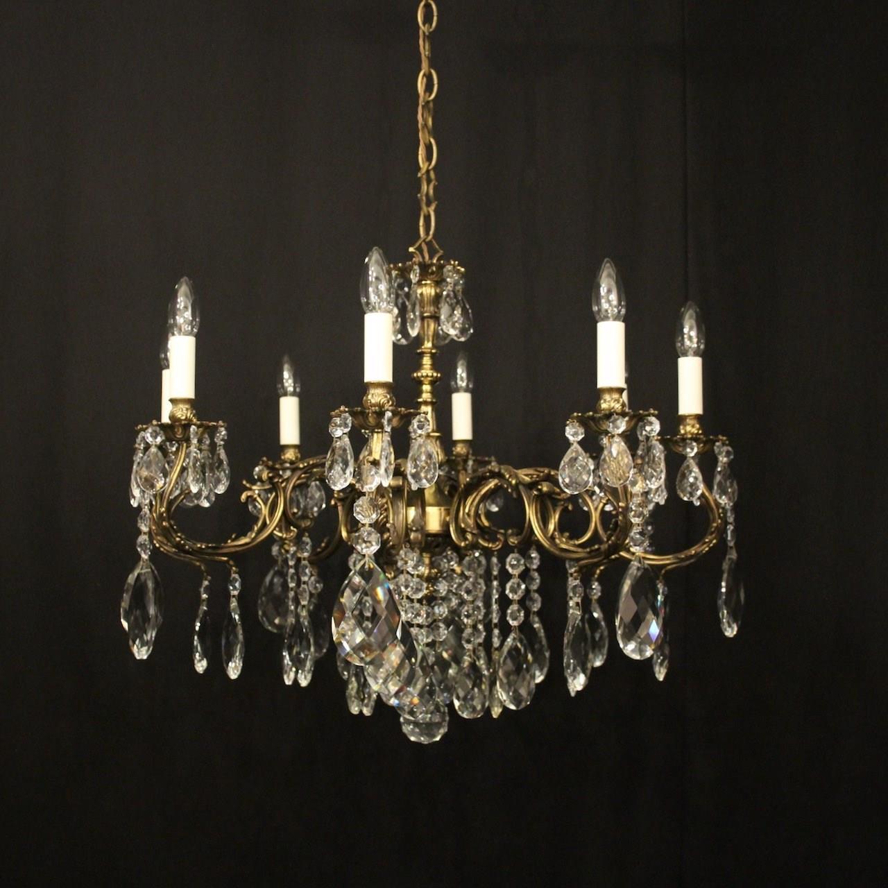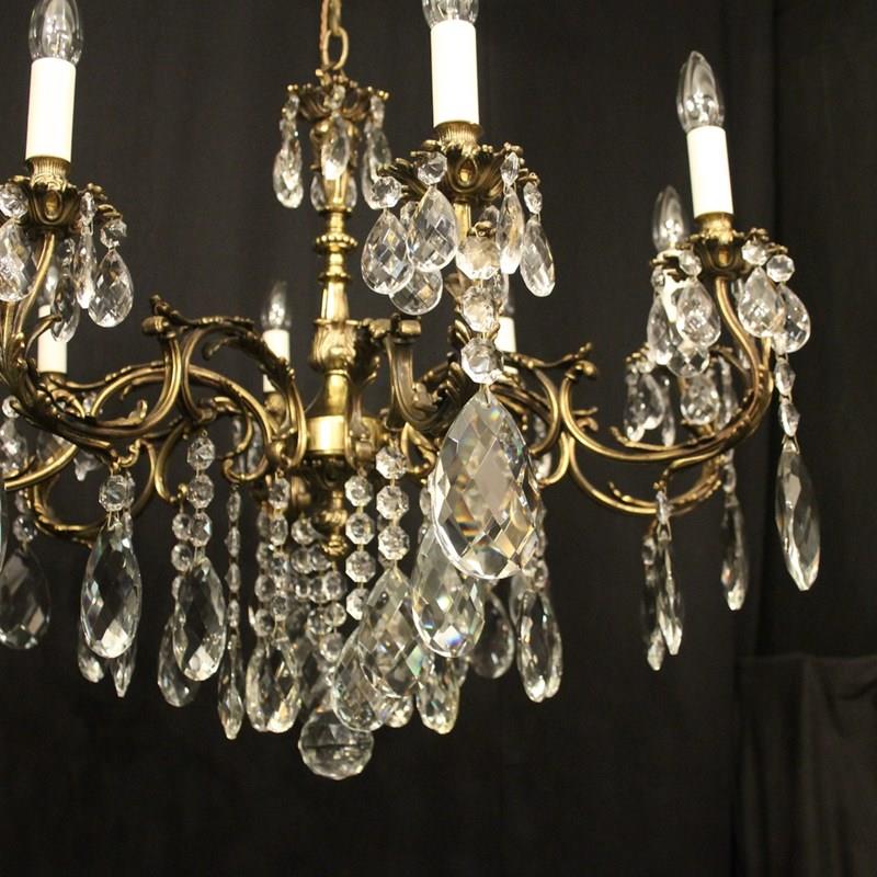 A French gilded brass and crystal 8 light antique chandelier, the leaf clad scrolling arms with leaf bobeche drip pans and bulbous candle sconces, issuing from a foliated central column with pierced leaf canopy, decorated overall in double pear faceted crystal pendants and having the original chain and ceiling rose. Great wide proportions, ideal for large room with low ceiling. Fully rewired and PAT tested. All our chandeliers come with ceiling fixings and spare bulbs.