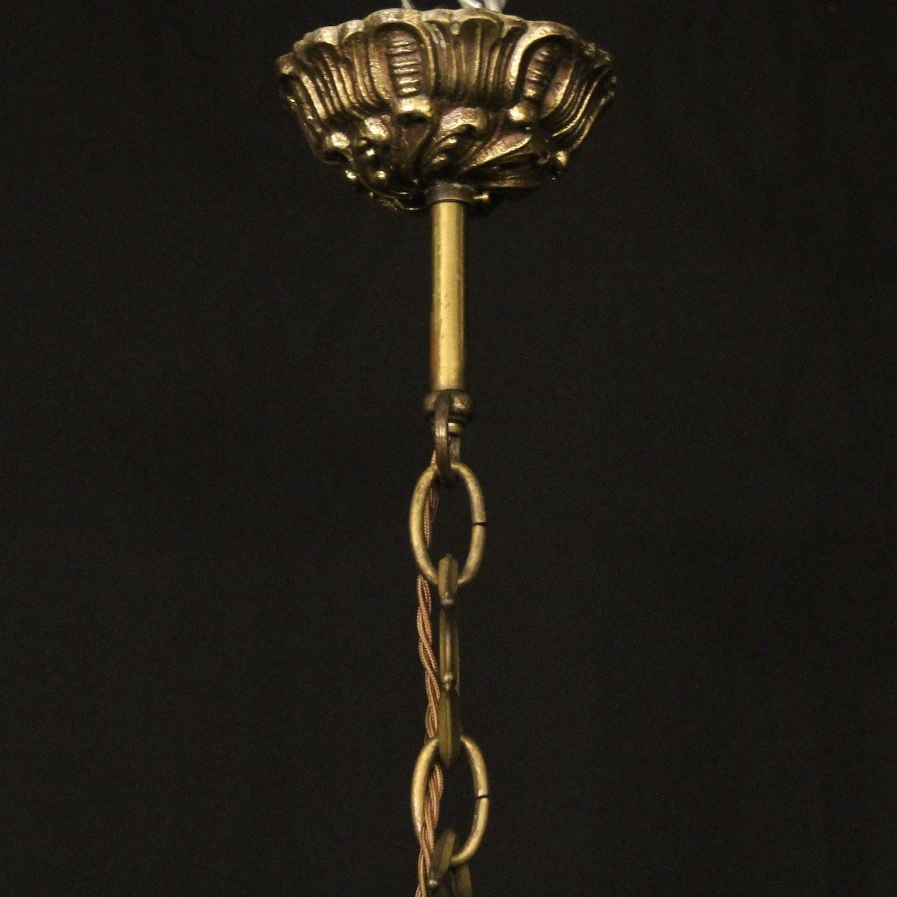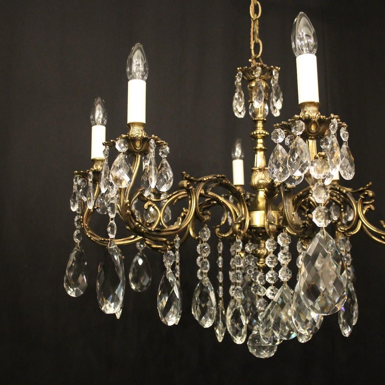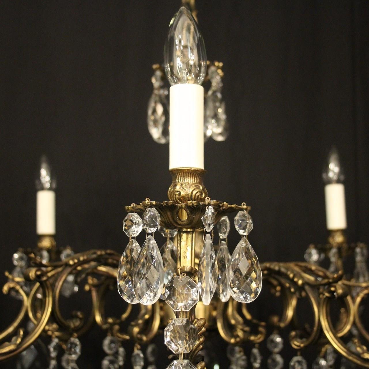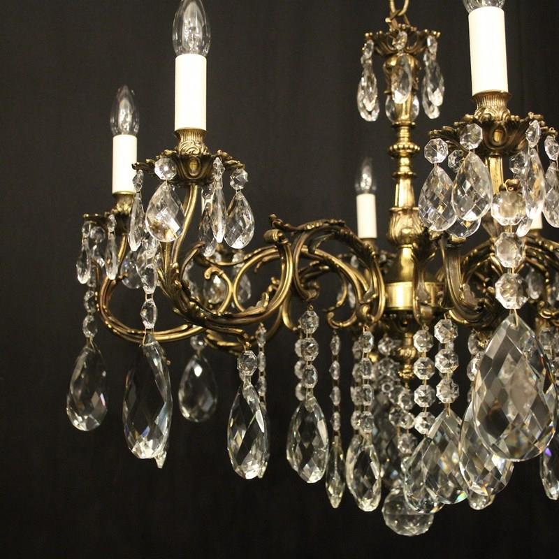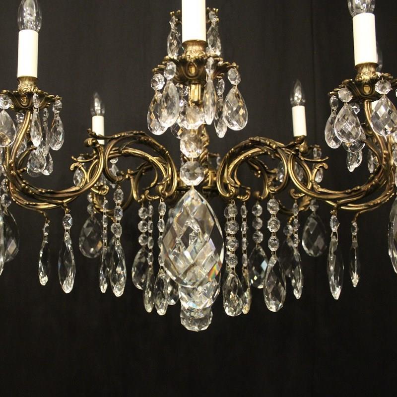 A French gilded brass and crystal 8 light antique chandelier, the leaf clad scrolling arms with leaf bobeche drip pans and bulbous candle sconces, issuing from a foliated central column with pierced leaf canopy, decorated overall in double pear faceted crystal pendants and having the original chain and ceiling rose. Great wide proportions, ideal for large room with low ceiling. Fully rewired and PAT tested. All our chandeliers come with ceiling fixings and spare bulbs.