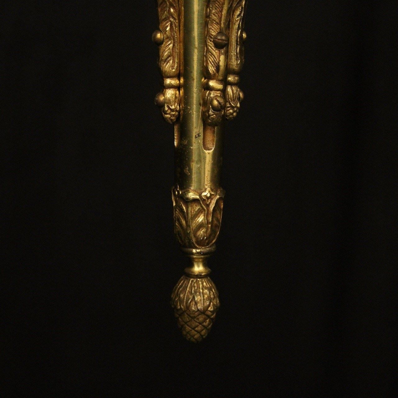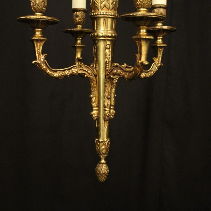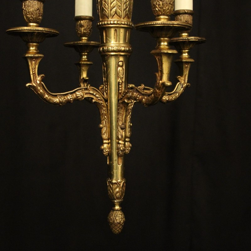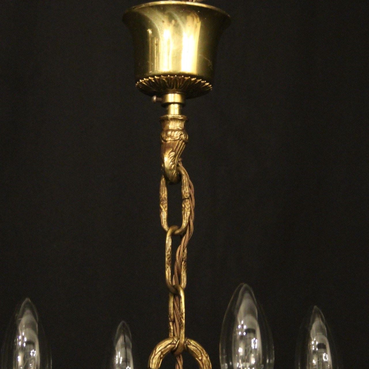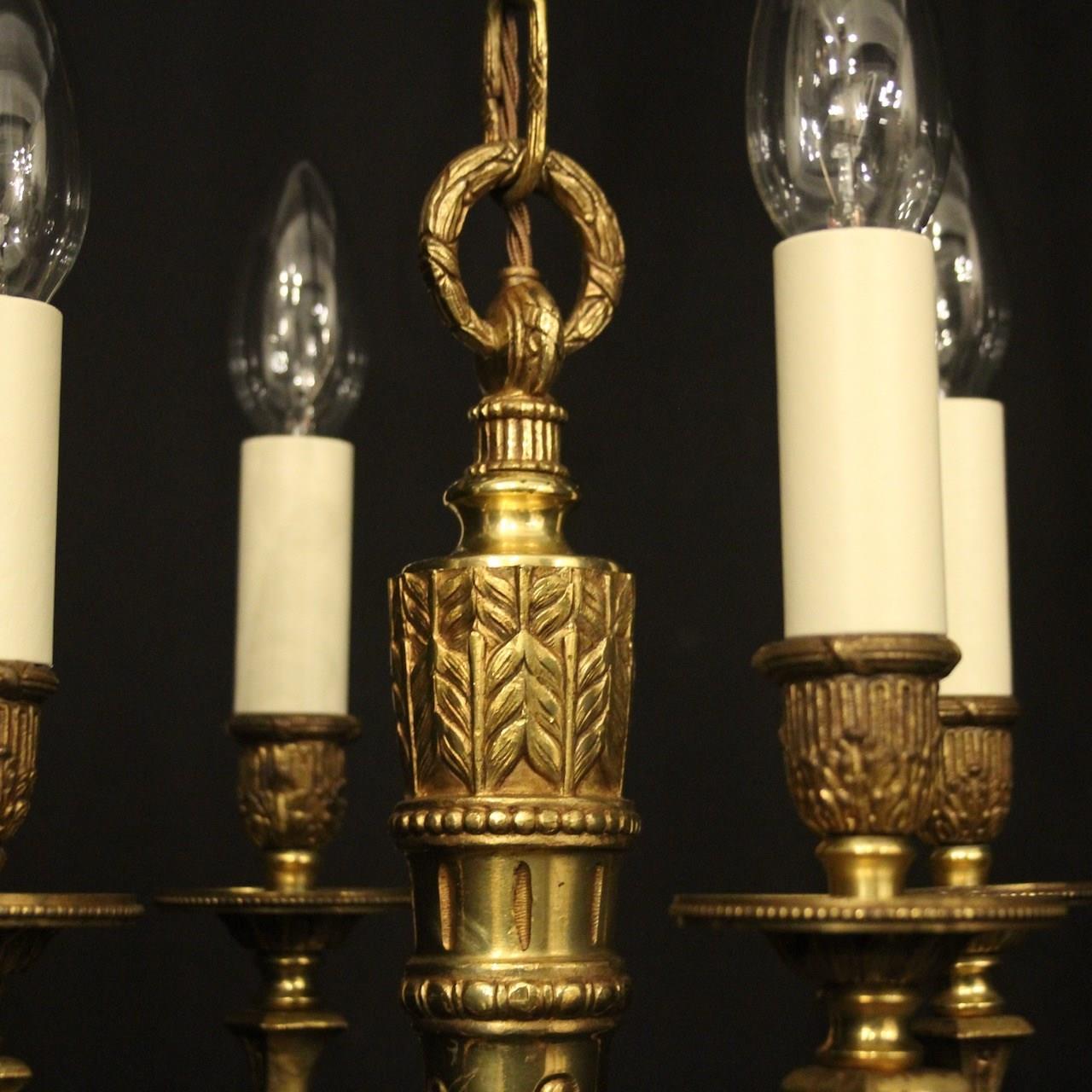A French gilded brass 4 light antique chandelier, the ornate scrolling arms with circular bobeche drip pans and bulbous candle sconces, issuing from a tapering central column with arrow head finial and inverted berried terminal, having the original chain and ceiling rose, nice original gilded patination. Fully rewired and PAT tested. All our chandeliers come with bulbs and ceiling fixings.