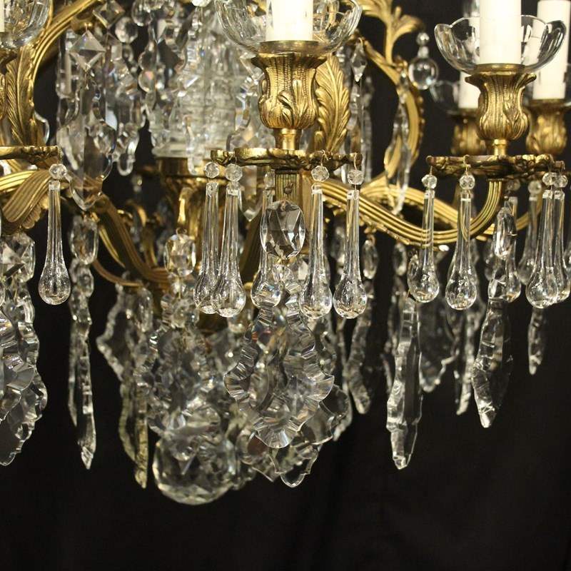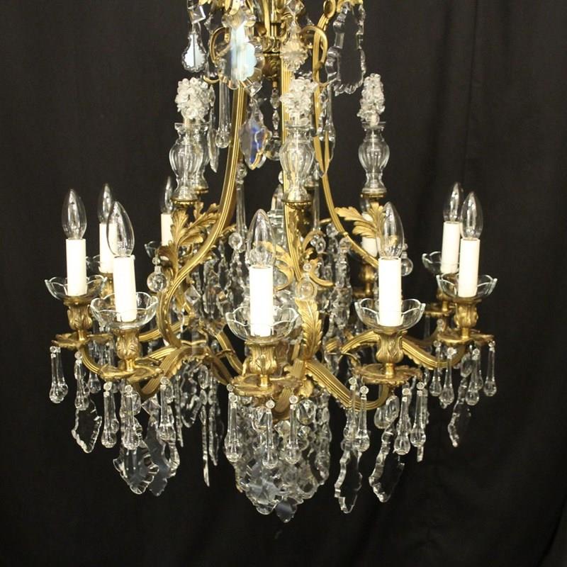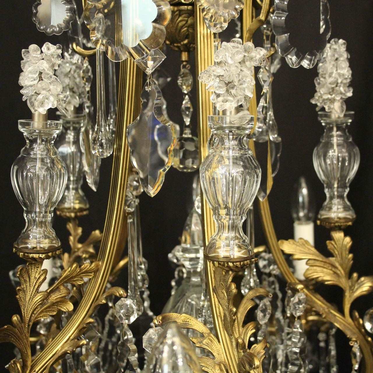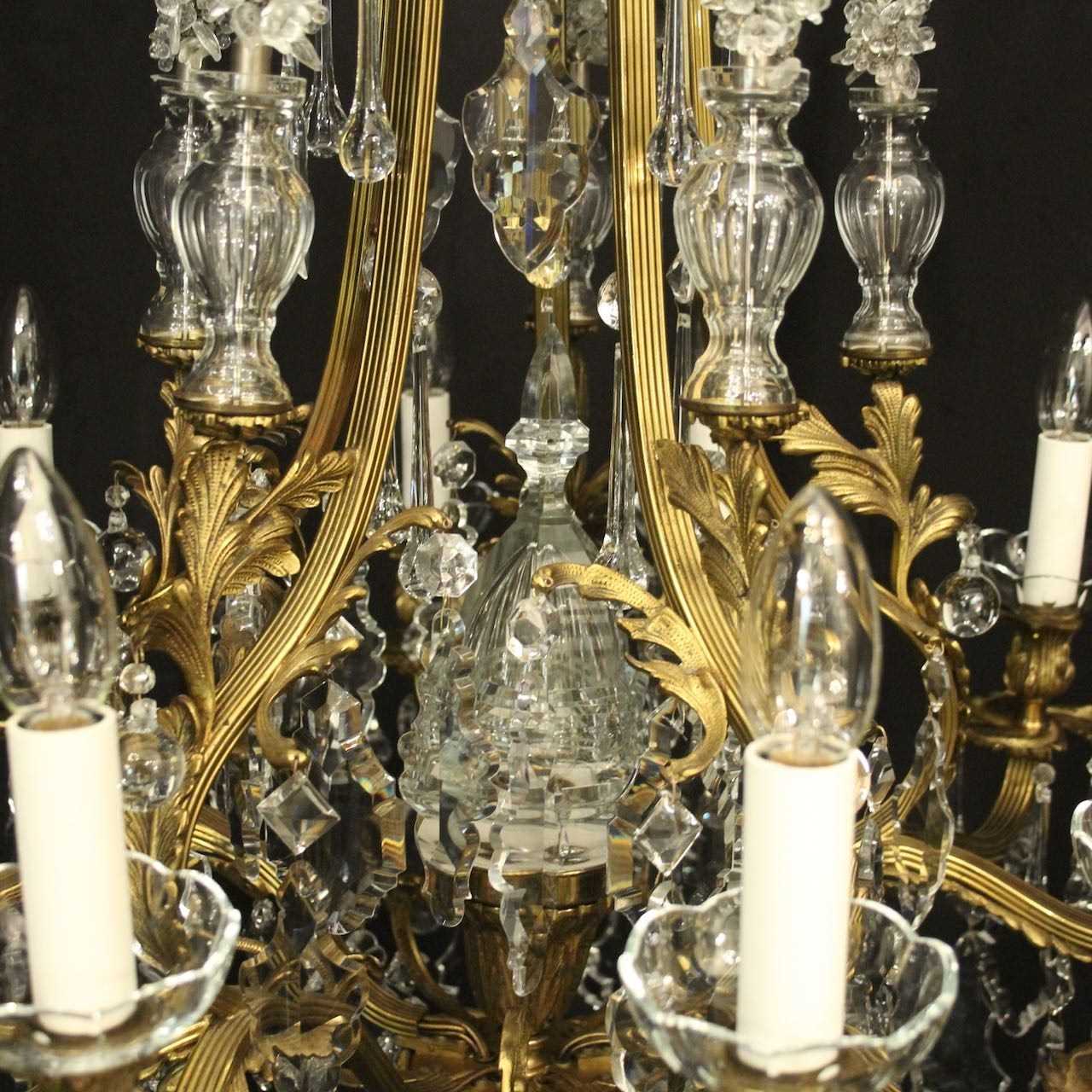 A French gilded bronze and crystal 11 light birdcage form antique chandelier, the acanthus leaf reeded scrolling arms with foliated leaf and glass bobeche drip pans with bulbous leaf candle sconces, issuing from a cage form interior with a large prismatic crystal centre and ornate scrolling canopy with glass baluster column, decorated overall with French Slab crystal faceted pendants, super crisp casting and nice quality. Fully rewired and PAT tested. All our chandeliers come with bulbs and ceiling fixings.