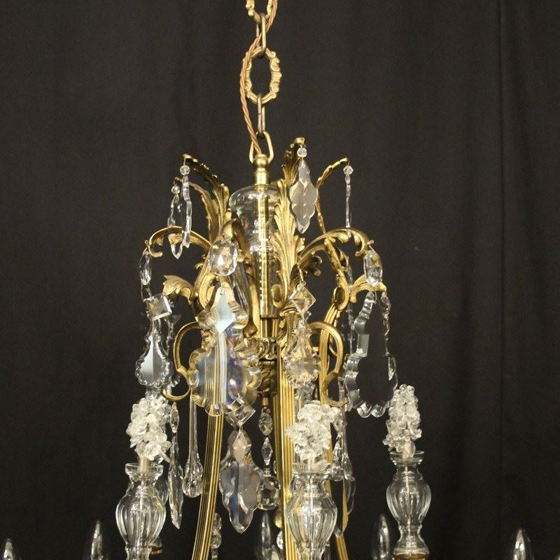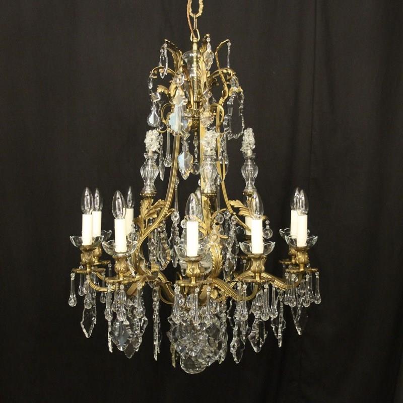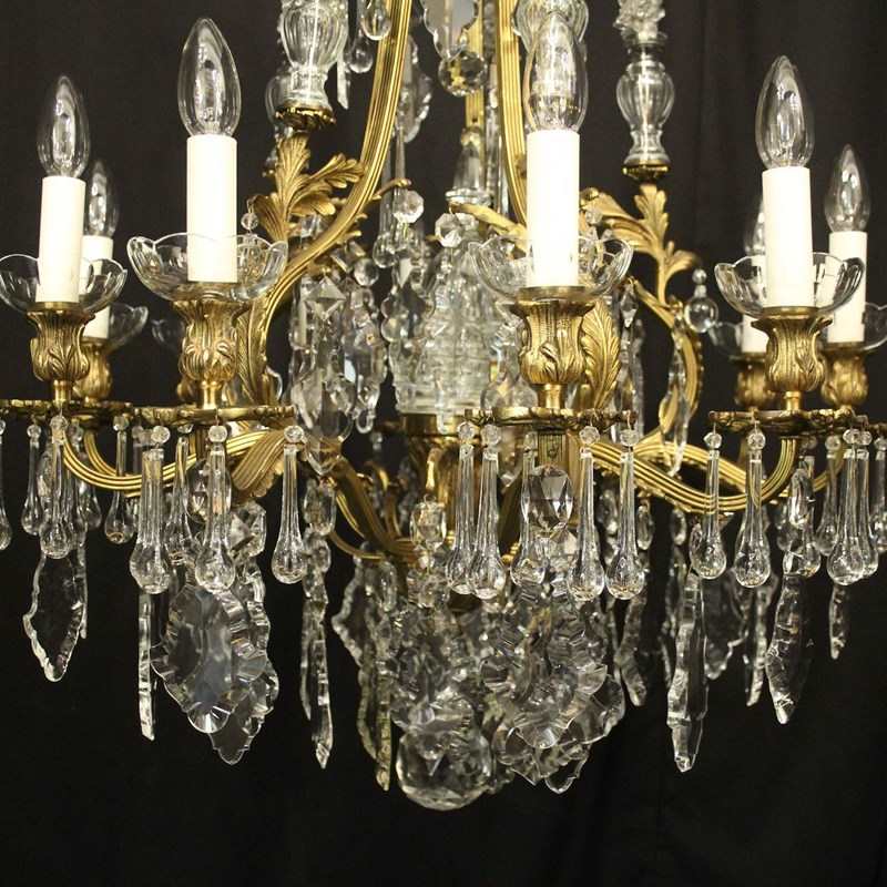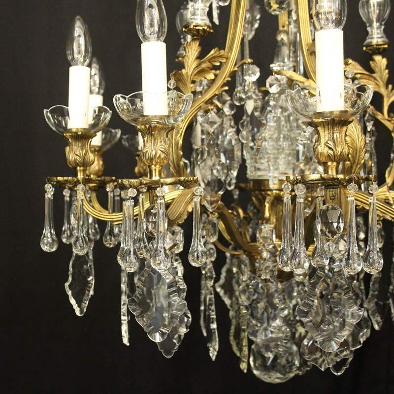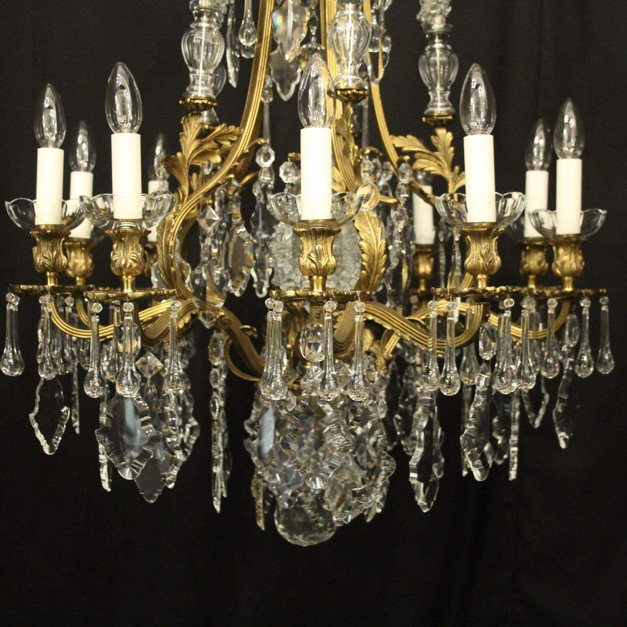 A French gilded bronze and crystal 11 light birdcage form antique chandelier, the acanthus leaf reeded scrolling arms with foliated leaf and glass bobeche drip pans with bulbous leaf candle sconces, issuing from a cage form interior with a large prismatic crystal centre and ornate scrolling canopy with glass baluster column, decorated overall with French Slab crystal faceted pendants, super crisp casting and nice quality. Fully rewired and PAT tested. All our chandeliers come with bulbs and ceiling fixings.