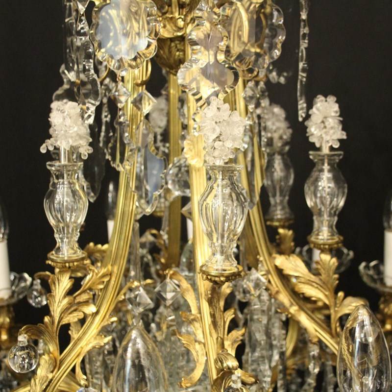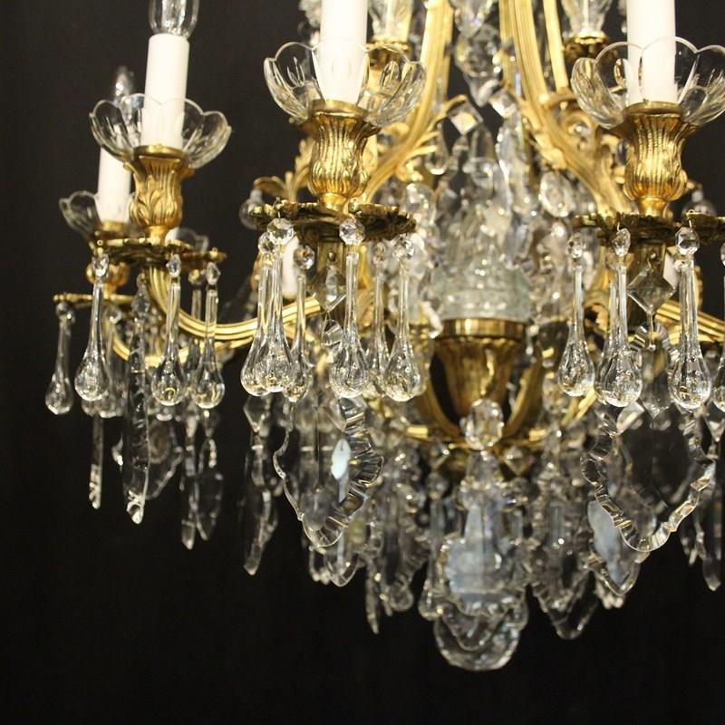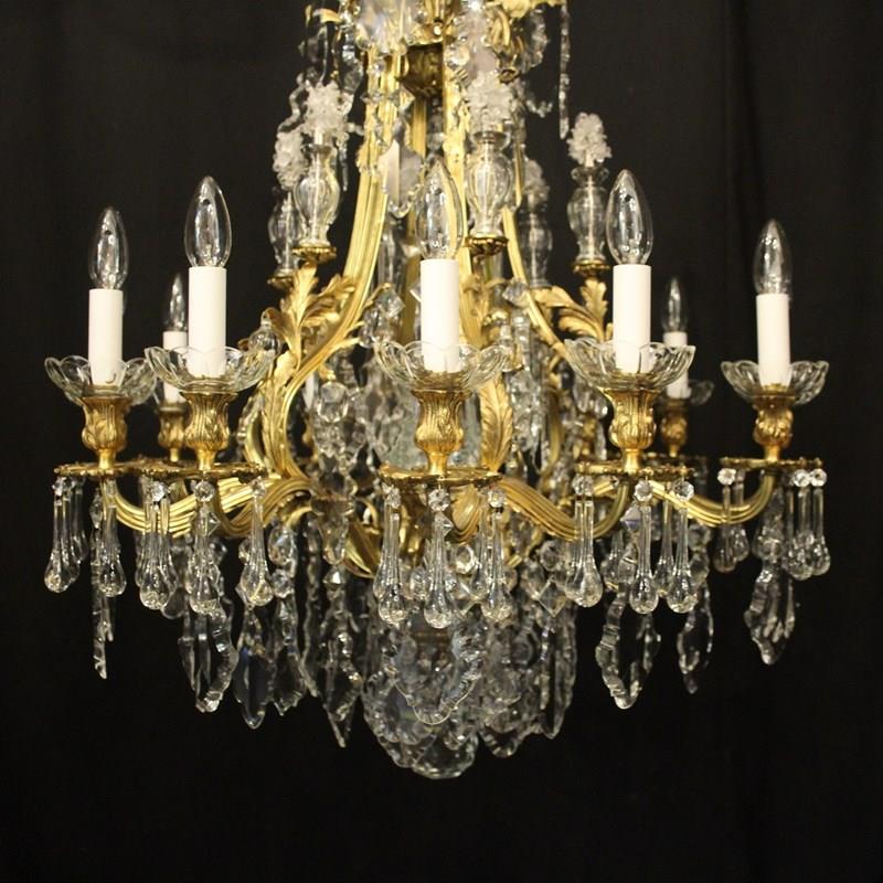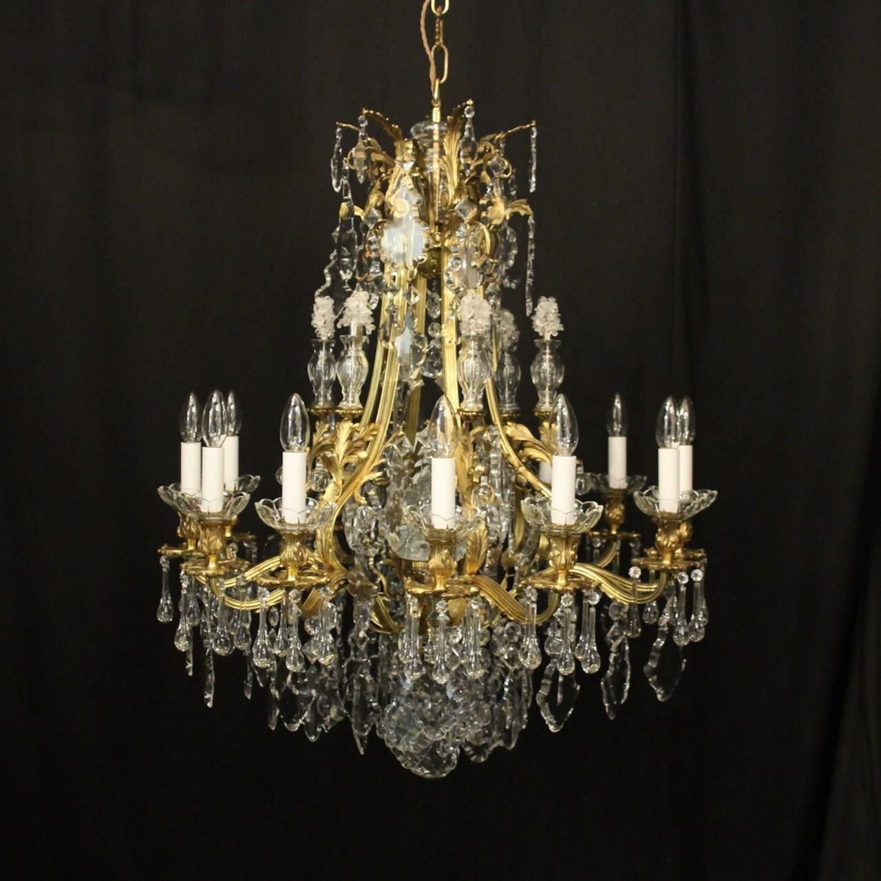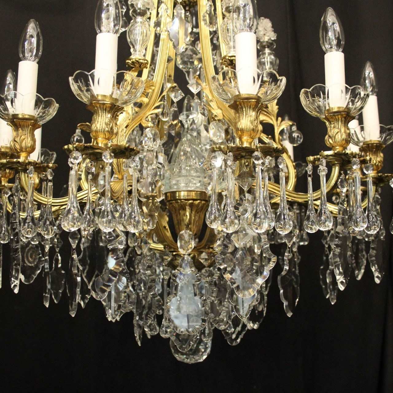 A French gilded bronze and crystal 13 light birdcage form antique chandelier, the 12 acanthus leaf reeded scrolling arms with foliated leaf bobeche, glass drip pans and bulbous leaf candle sconces, issuing from a cage form interior with a large prismatic crystal centre with internal light fitting and having an ornate scrolling canopy with glass baluster column, decorated overall with crystal faceted pendants, excellent crisp patination and nice quality. Fully rewired and PAT tested. All our chandeliers come with bulbs and ceiling fixings.