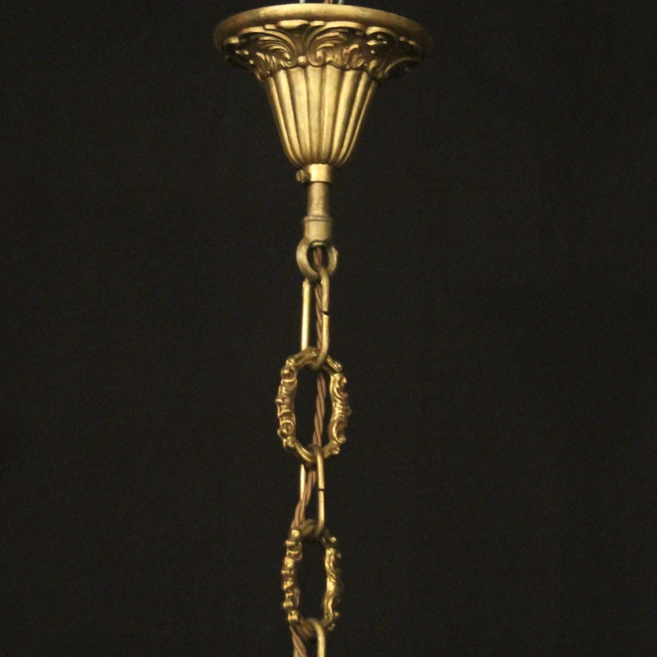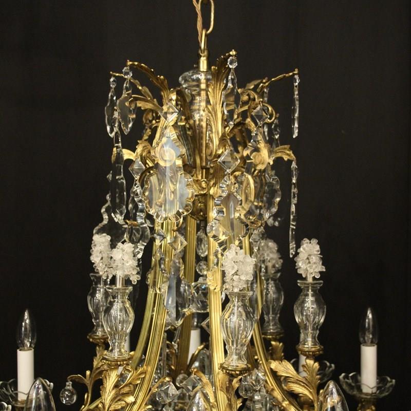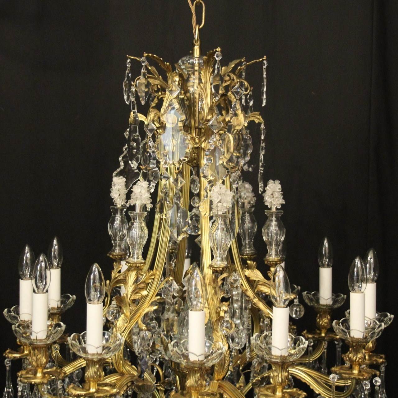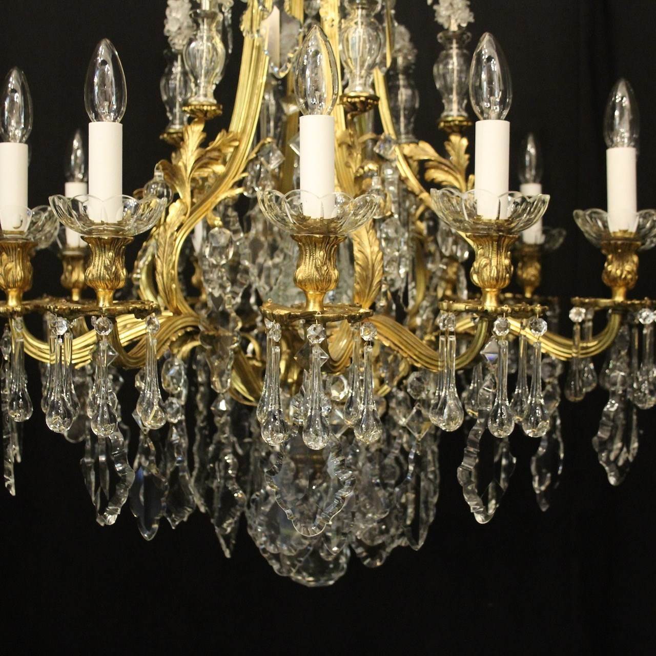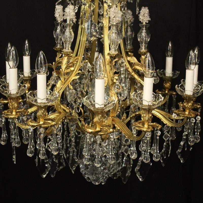 A French gilded bronze and crystal 13 light birdcage form antique chandelier, the 12 acanthus leaf reeded scrolling arms with foliated leaf bobeche, glass drip pans and bulbous leaf candle sconces, issuing from a cage form interior with a large prismatic crystal centre with internal light fitting and having an ornate scrolling canopy with glass baluster column, decorated overall with crystal faceted pendants, excellent crisp patination and nice quality. Fully rewired and PAT tested. All our chandeliers come with bulbs and ceiling fixings.