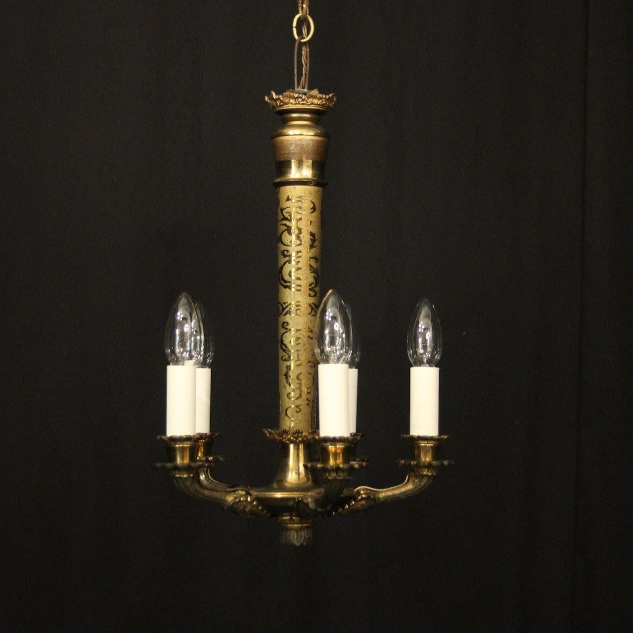 A French late 19th Century gilded bronze 5 light antique chandelier, the decorative mask headed reeded tapering arms with circular bobeche leaf drip pans and candle sconces, issuing from a very decorative tapering etched central column with crown finial, lovely quality and super crisp casting. Fully rewired and PAT tested. All our chandeliers come with bulbs and ceiling fixings.