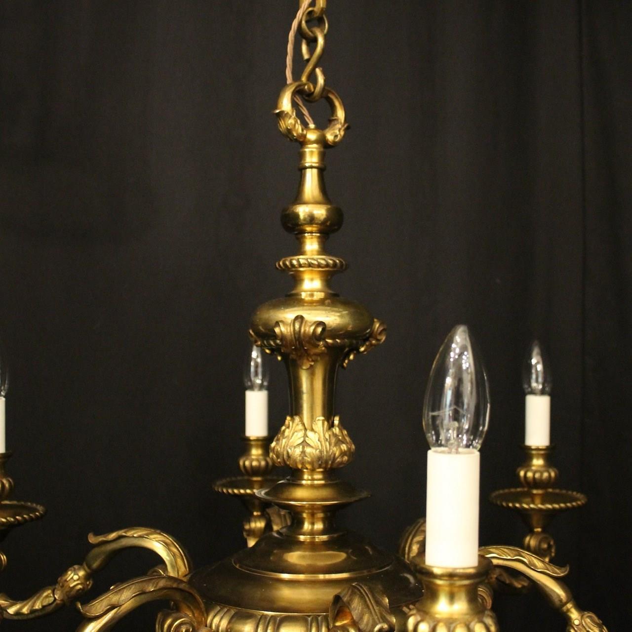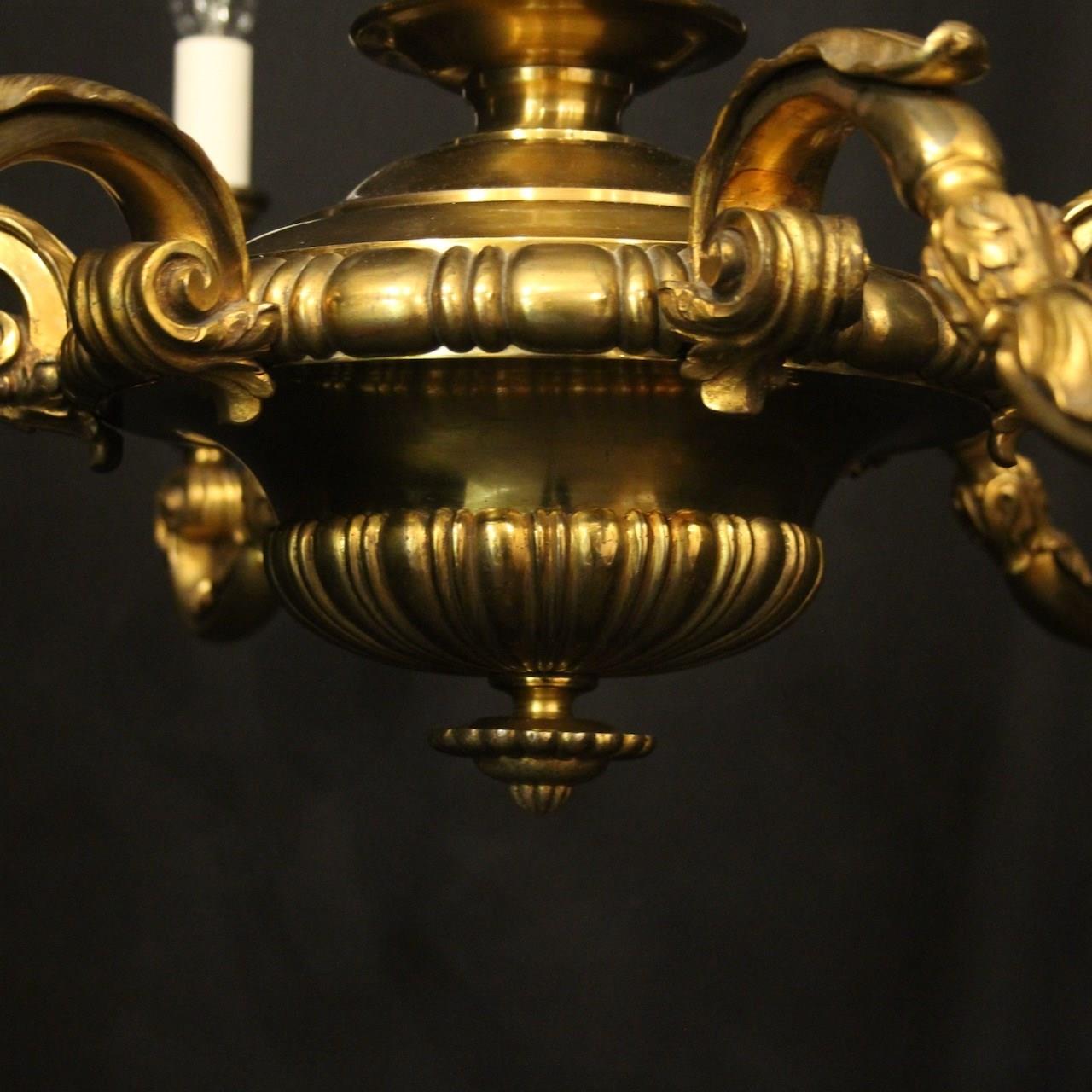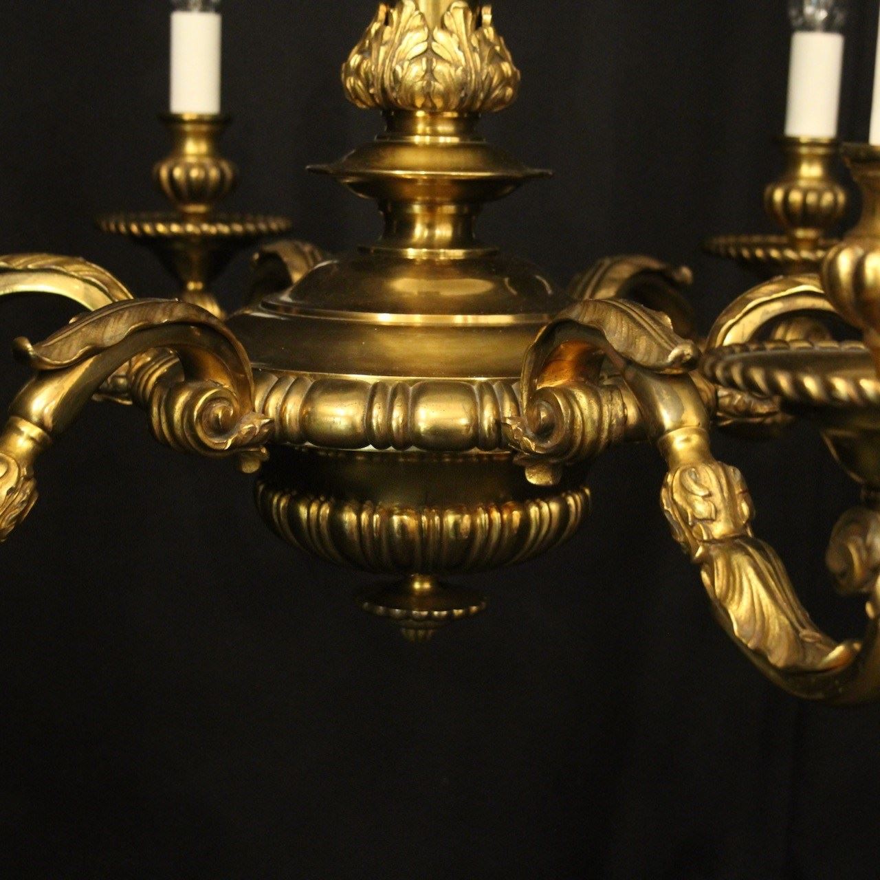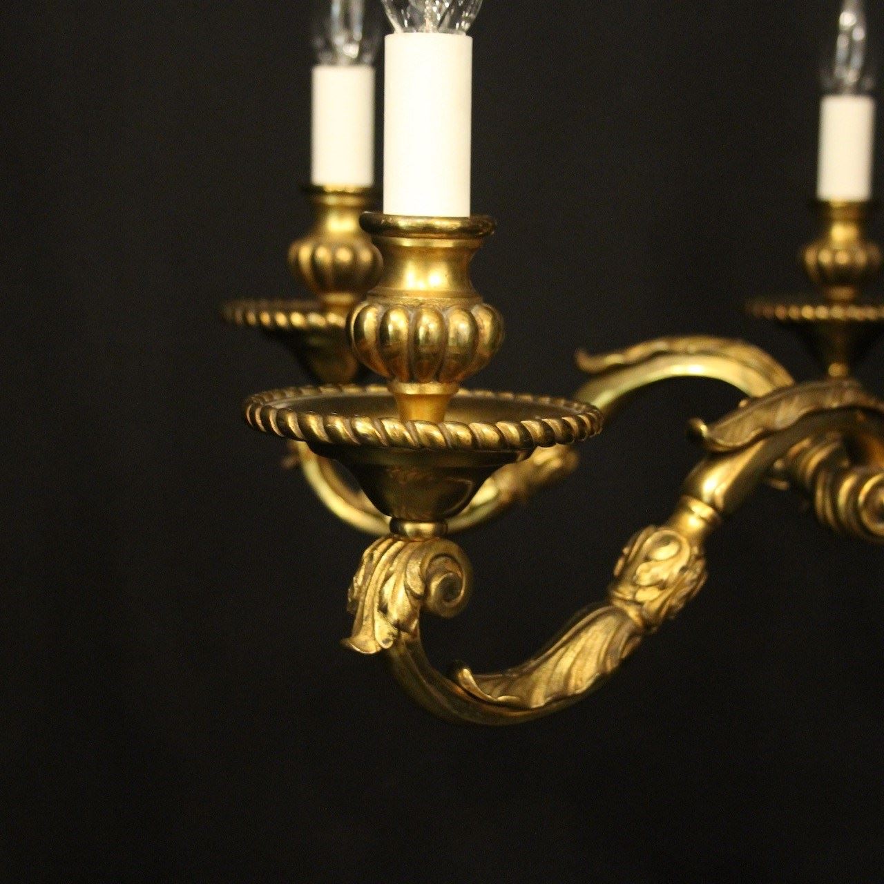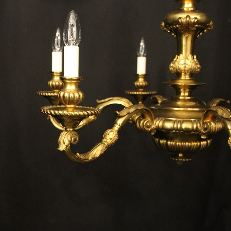 A quality French gilded bronze 6 light antique chandelier, the leaf clad scrolling arms with circular twisted bobeche drip pans and reeded bulbous candle sconces, issuing from a decorative baluster central column with reeded leaf base, super crisp casting and wonderful original colour. Fully rewired and PAT tested. All our chandeliers come with bulbs and ceiling fixings.