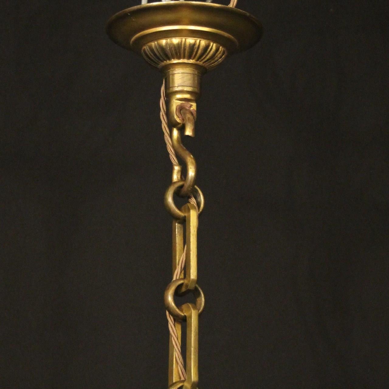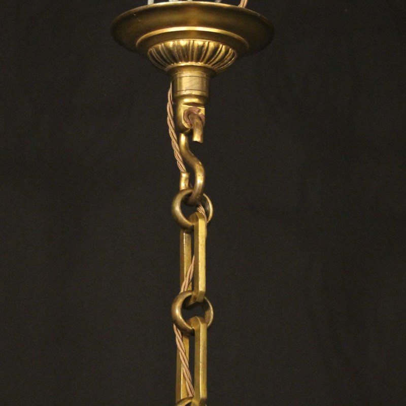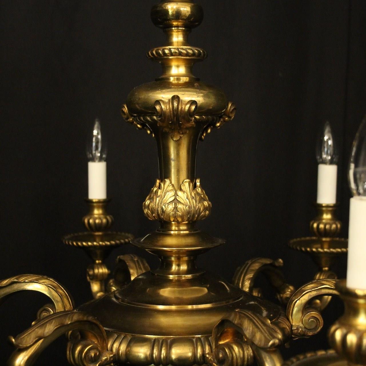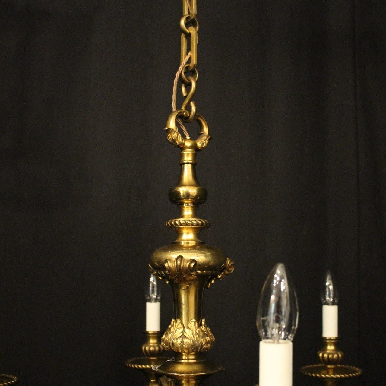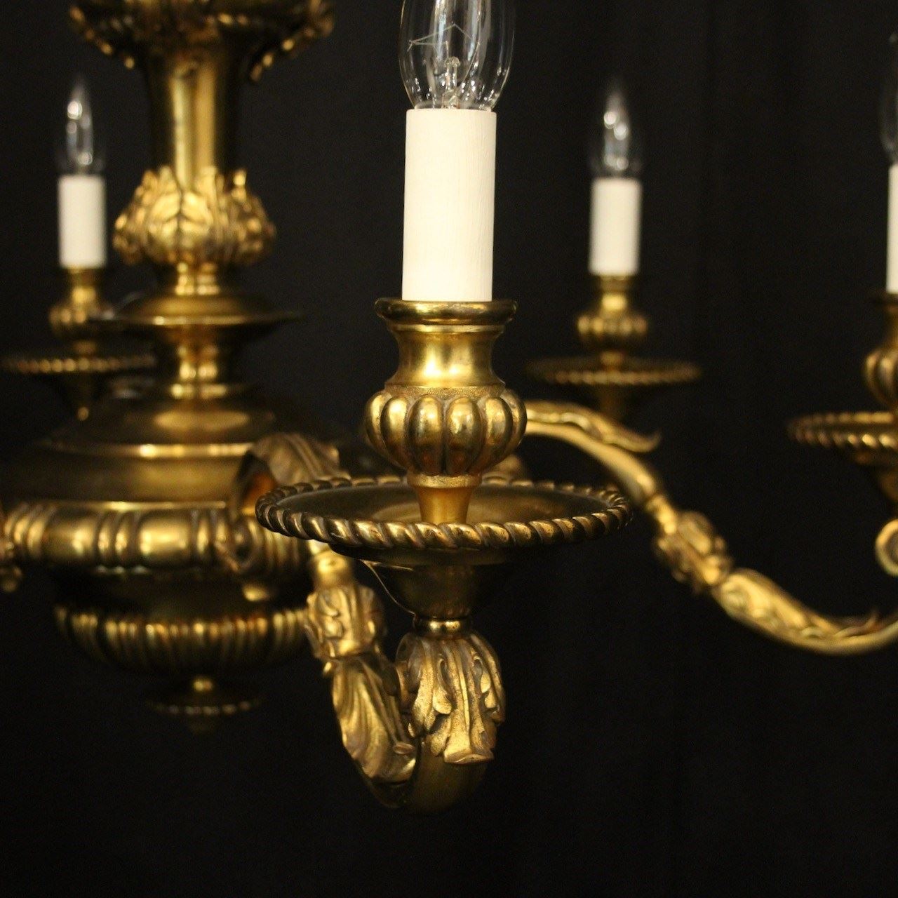 A quality French gilded bronze 6 light antique chandelier, the leaf clad scrolling arms with circular twisted bobeche drip pans and reeded bulbous candle sconces, issuing from a decorative baluster central column with reeded leaf base, super crisp casting and wonderful original colour. Fully rewired and PAT tested. All our chandeliers come with bulbs and ceiling fixings.