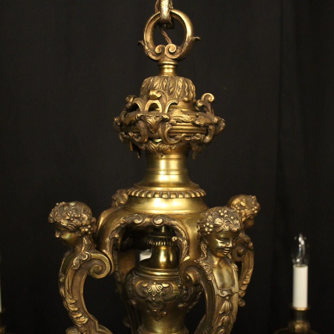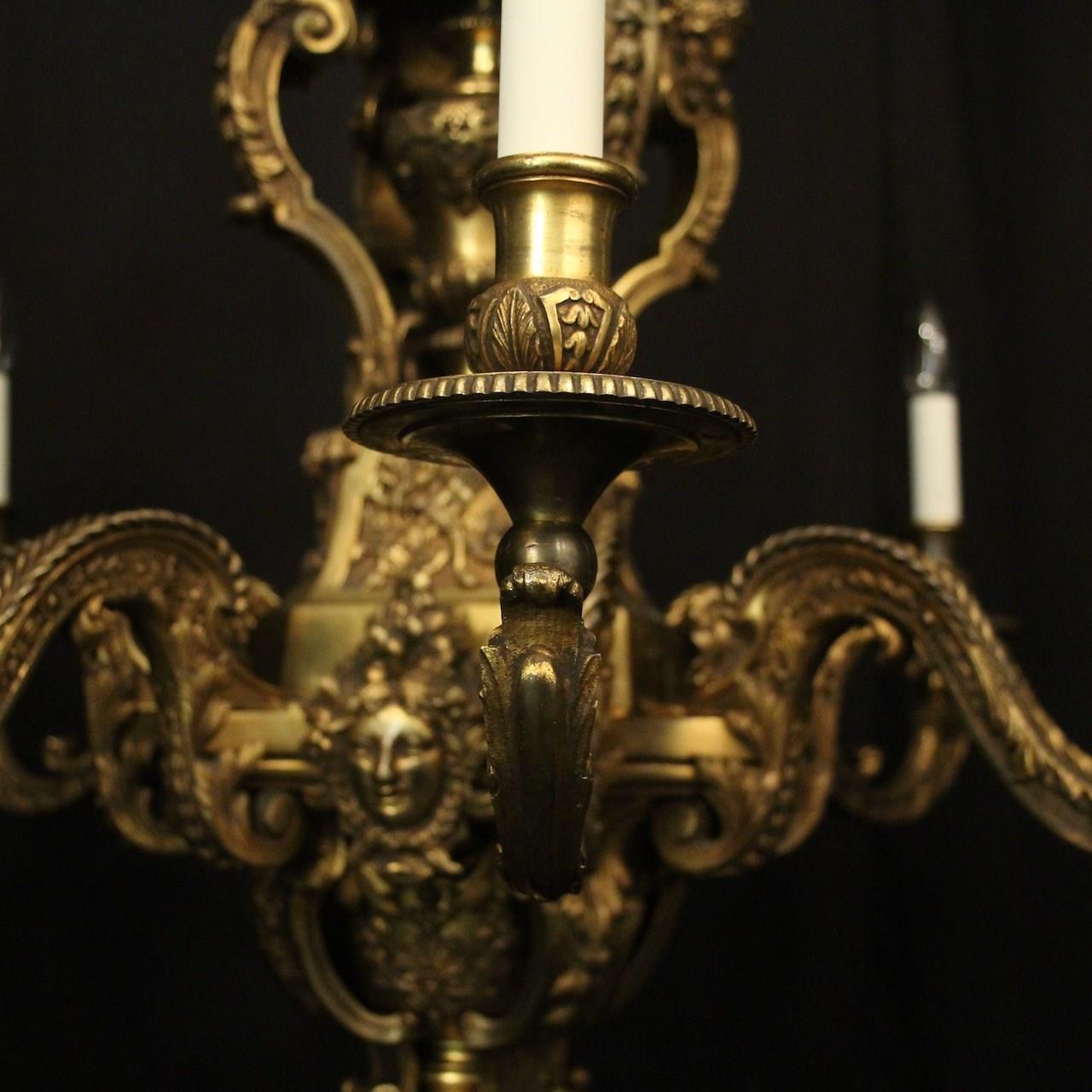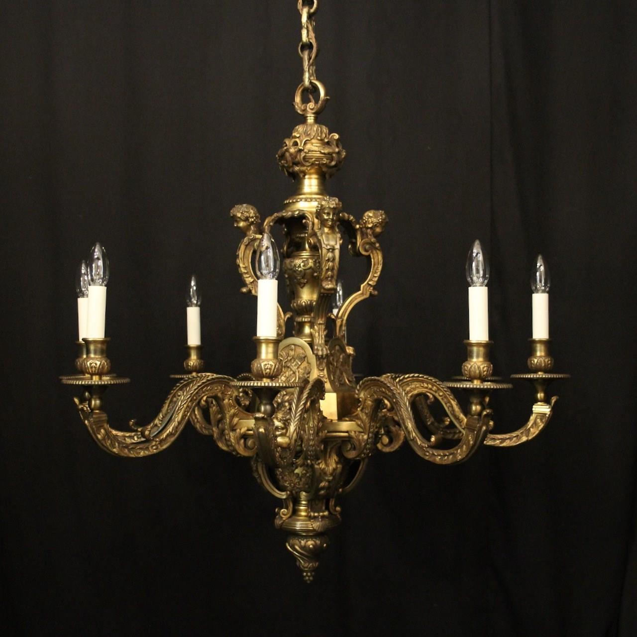 A quality French gilded bronze 8 light antique chandelier in the manner of Andre Charles Boulle, the ornate cast square gauge scrolling arms with millgrain circular bobeche drip pans and bulbous candle sconces, issuing from a pierced central urn baluster stem with four cherubs and set below with decorative female mask heads with scallop base and twisted finial, excellent original faded gilded patination and fantastic casting, one of the best quality chandeliers that we have found. Fully rewired and PAT tested. All our chandeliers come with bulbs and ceiling fixings.