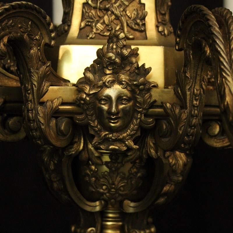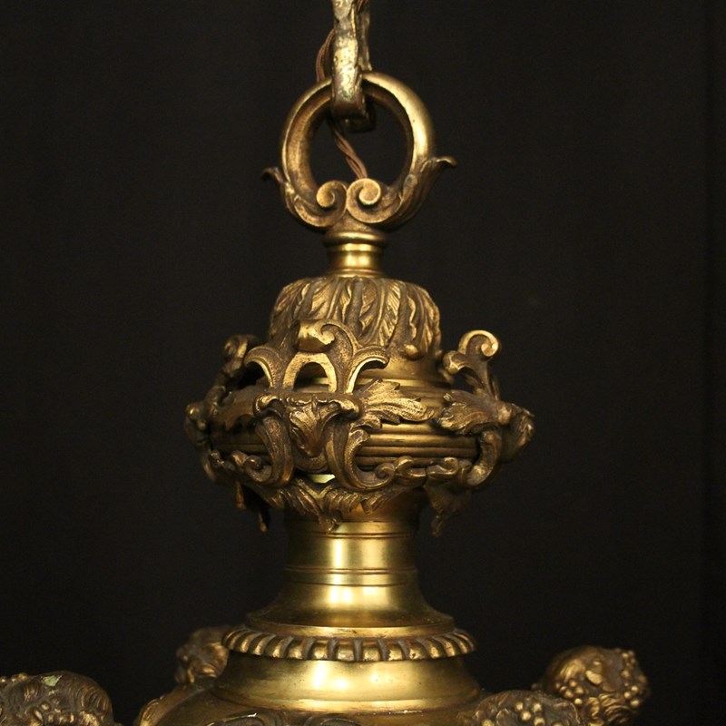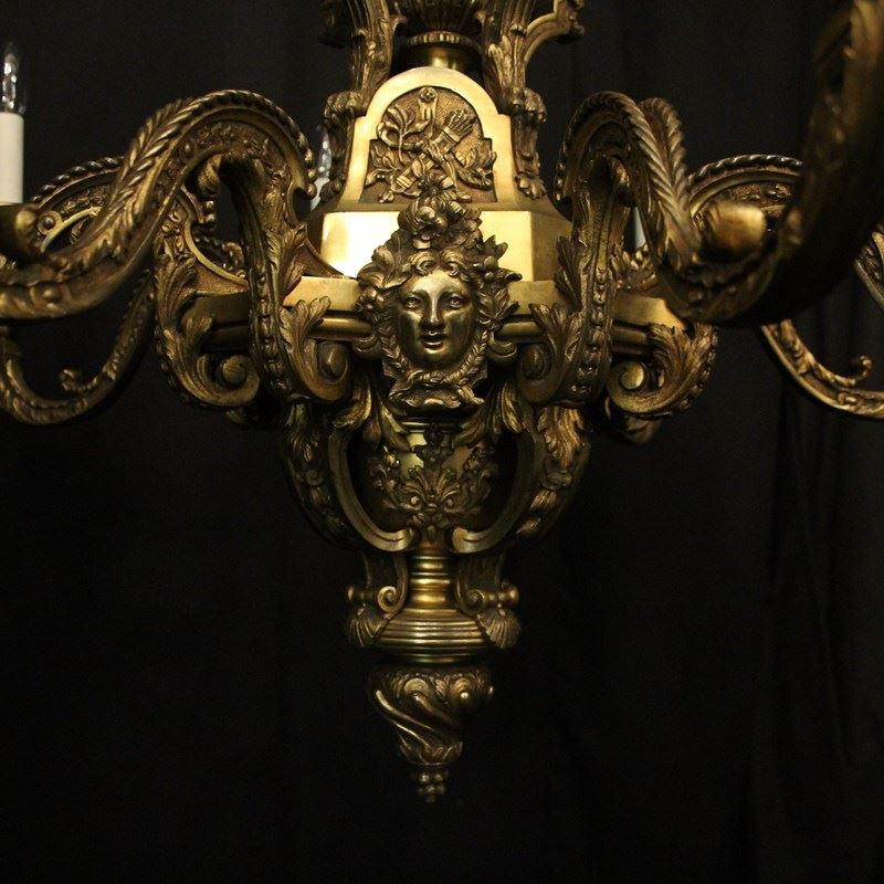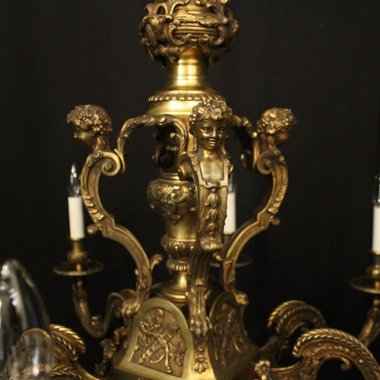 A quality French gilded bronze 8 light antique chandelier in the manner of Andre Charles Boulle, the ornate cast square gauge scrolling arms with millgrain circular bobeche drip pans and bulbous candle sconces, issuing from a pierced central urn baluster stem with four cherubs and set below with decorative female mask heads with scallop base and twisted finial, excellent original faded gilded patination and fantastic casting, one of the best quality chandeliers that we have found. Fully rewired and PAT tested. All our chandeliers come with bulbs and ceiling fixings.