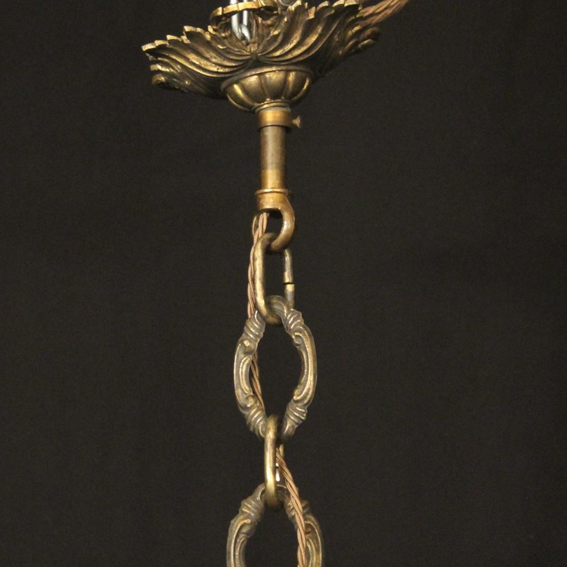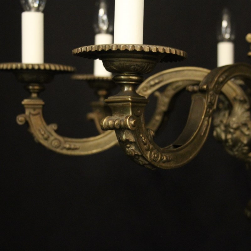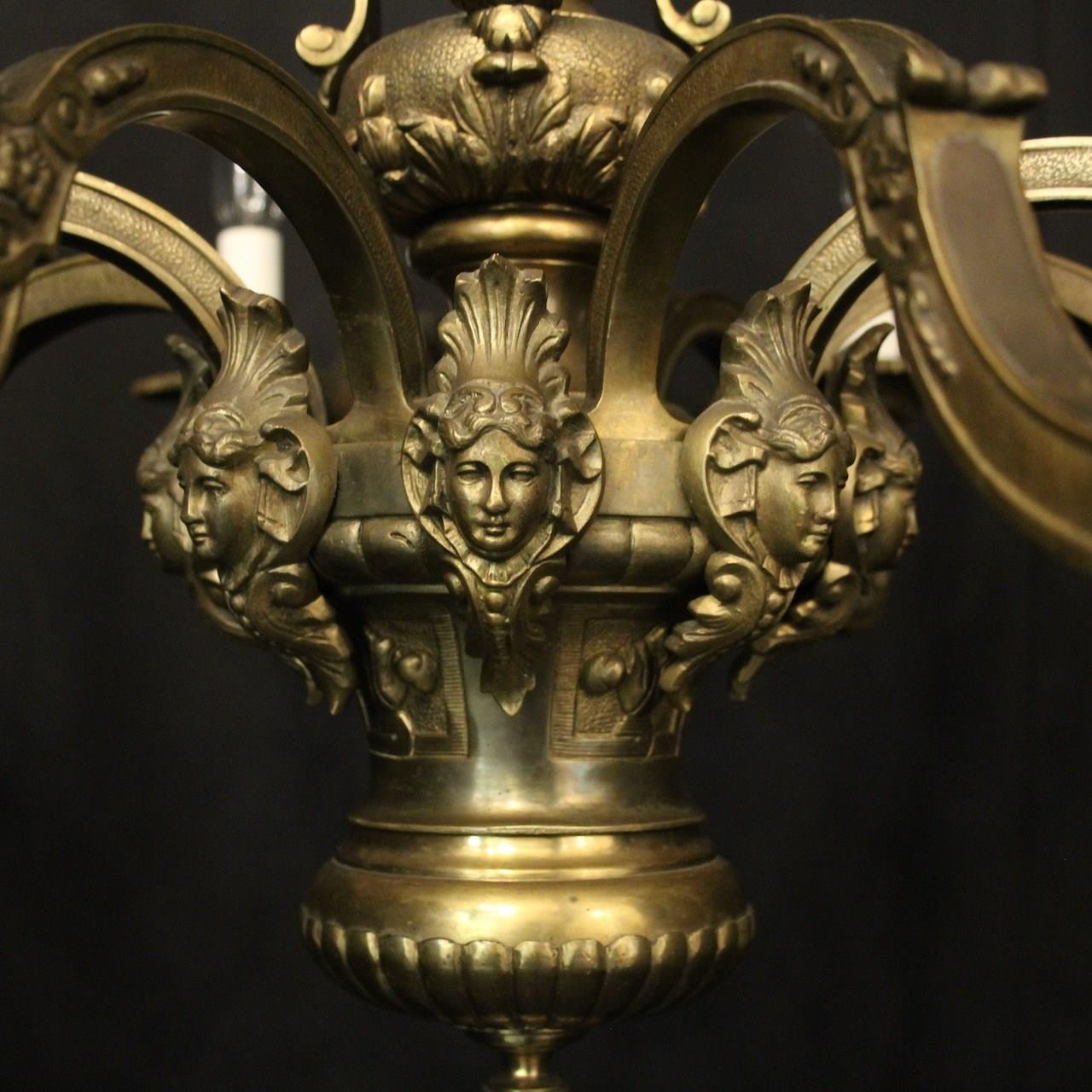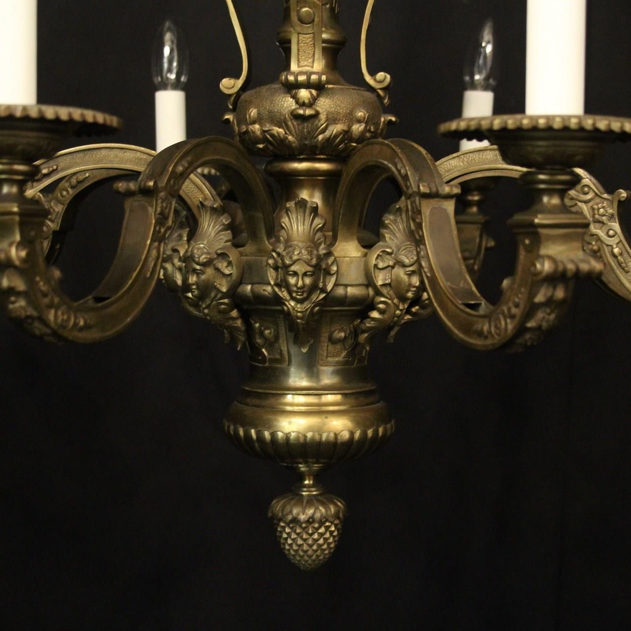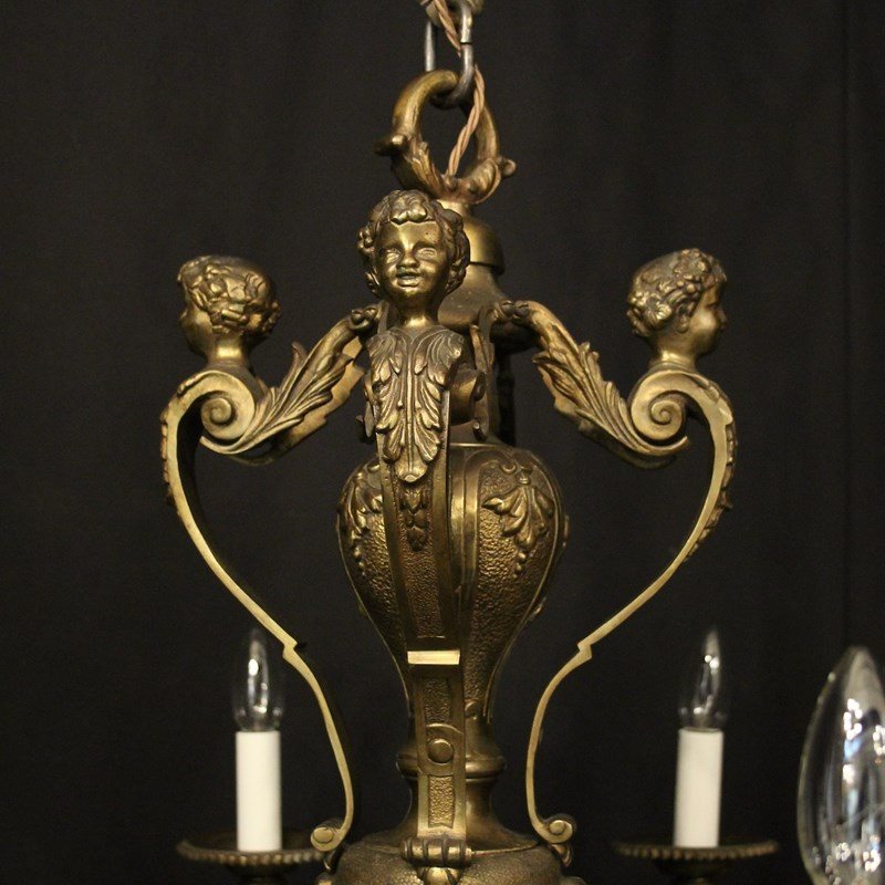 A French faded gilded bronze 8 light antique chandelier, the leaf clad square gauge scrolling arms with ornate circular bobeche drip pans, issuing from a pierced central urn baluster stem with four cherubs and set below with decorative female mask heads with reeded leaf base and inverted acorn finial, good faded original patination. Fully rewired and PAT tested. All our chandeliers come with bulbs and ceiling fixings.