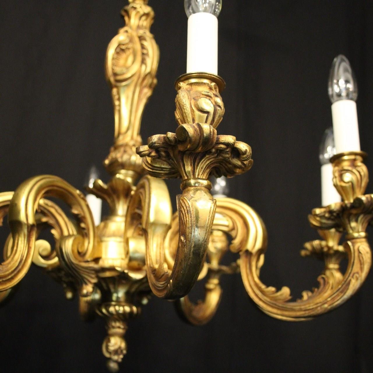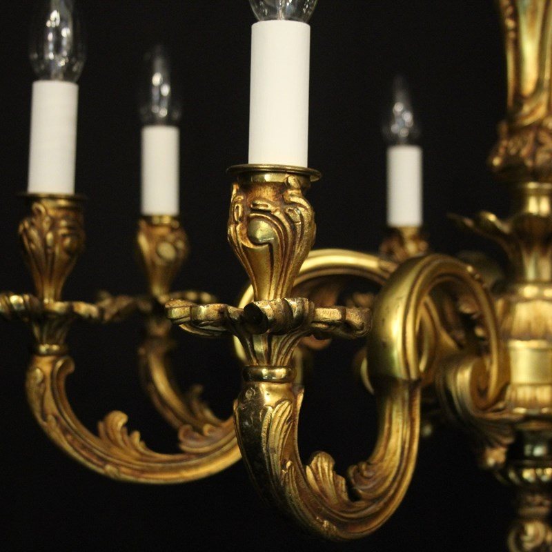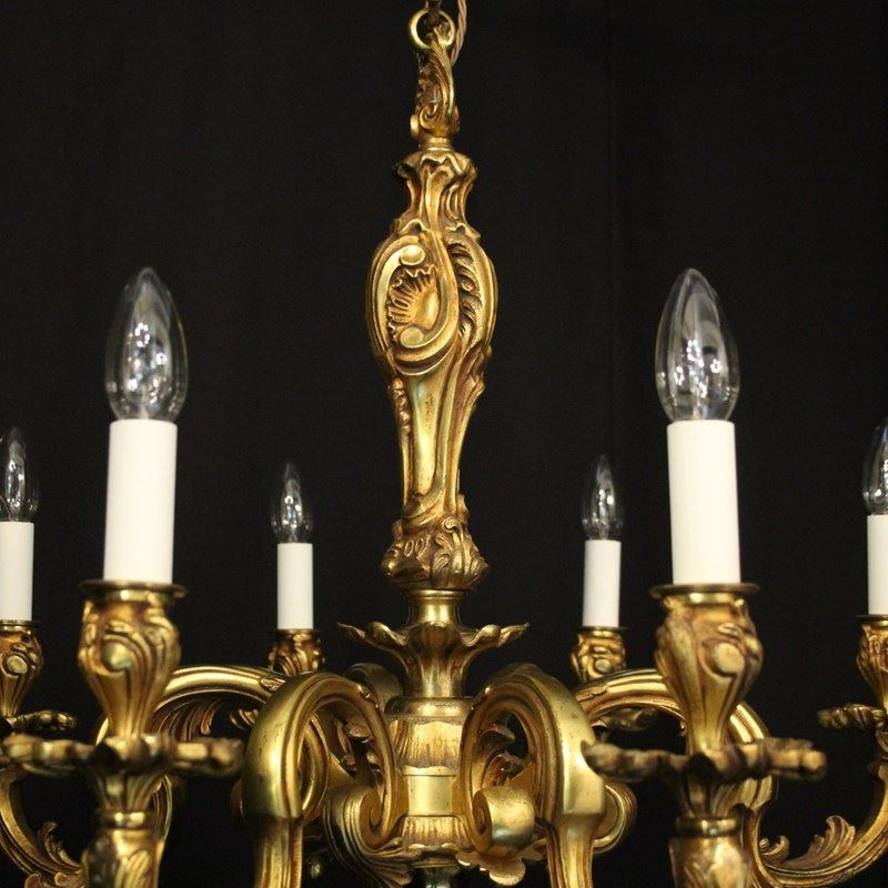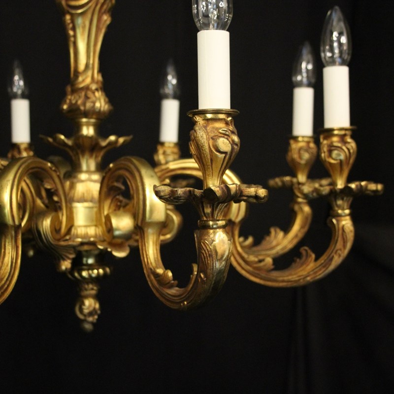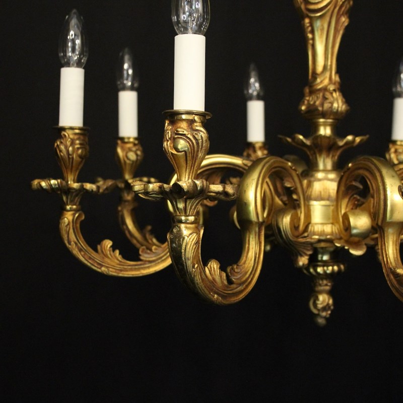 A nice quality French gilded bronze 8 light antique chandelier, the leaf clad scrolling arms with ornate trumpet bobeche drip pans and bulbous candle sconces, issuing from a tapering foliated central column with decorative leaf base, having the original chain and ceiling rose. Ideal for large room with low ceilings. Fully rewired and PAT tested. All our chandeliers come with bulbs and ceiling fixings.