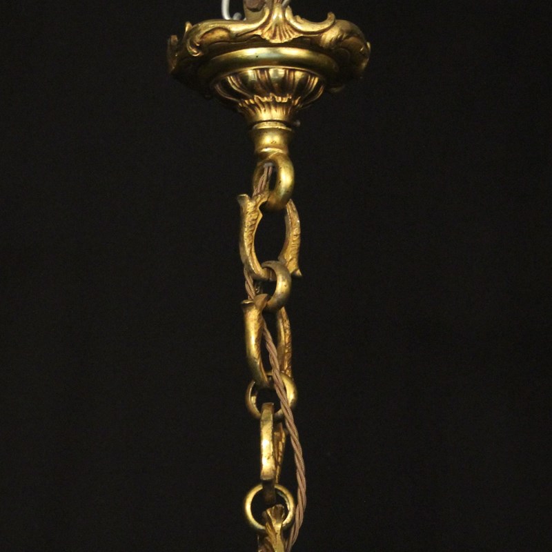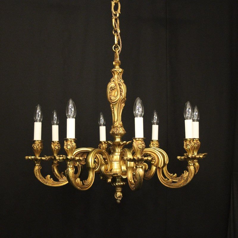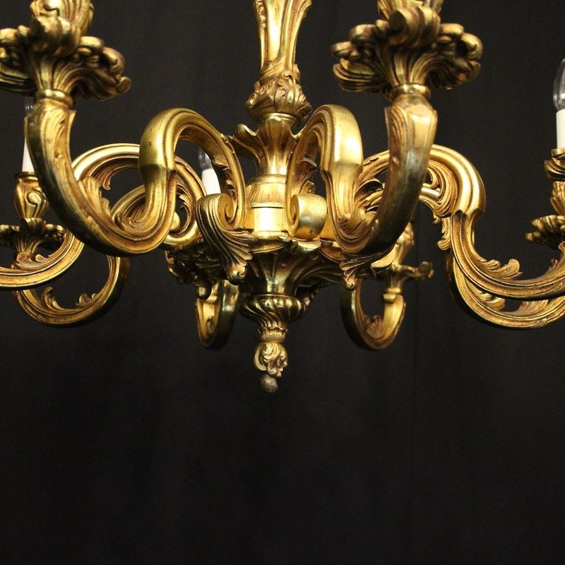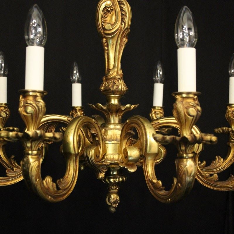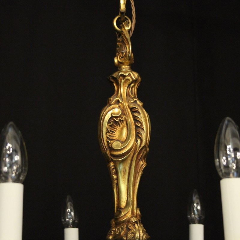 A nice quality French gilded bronze 8 light antique chandelier, the leaf clad scrolling arms with ornate trumpet bobeche drip pans and bulbous candle sconces, issuing from a tapering foliated central column with decorative leaf base, having the original chain and ceiling rose. Ideal for large room with low ceilings. Fully rewired and PAT tested. All our chandeliers come with bulbs and ceiling fixings.