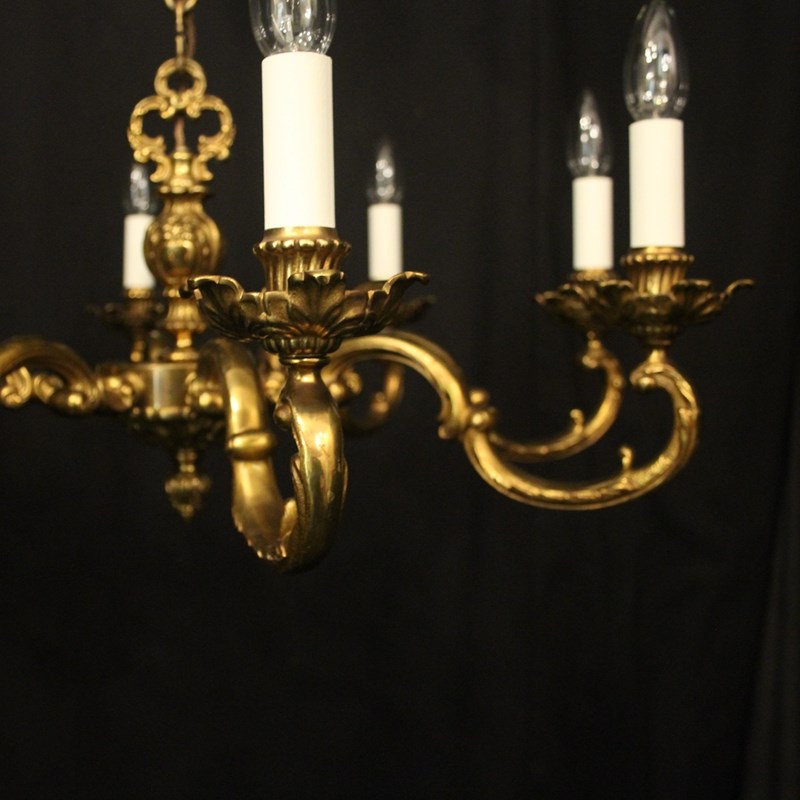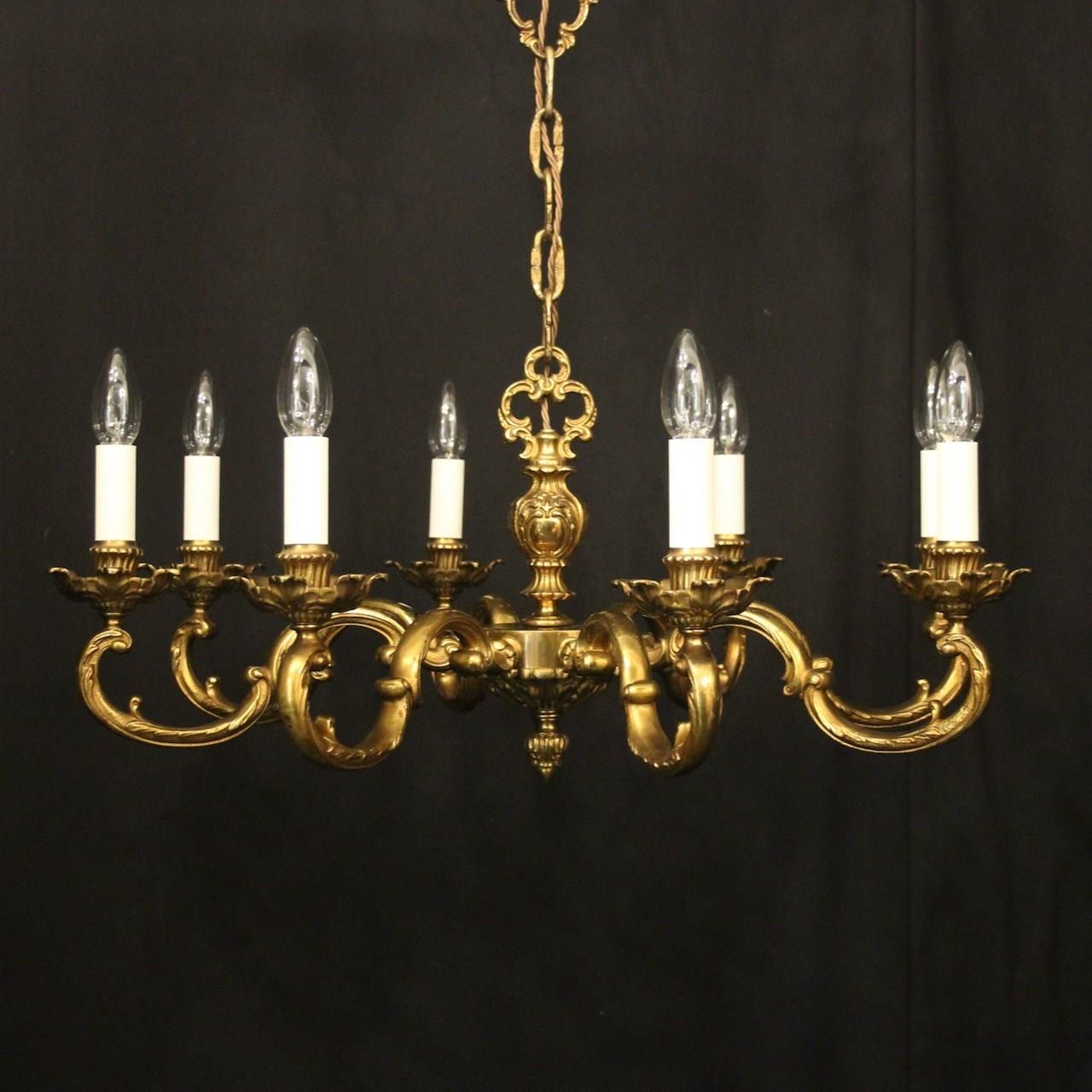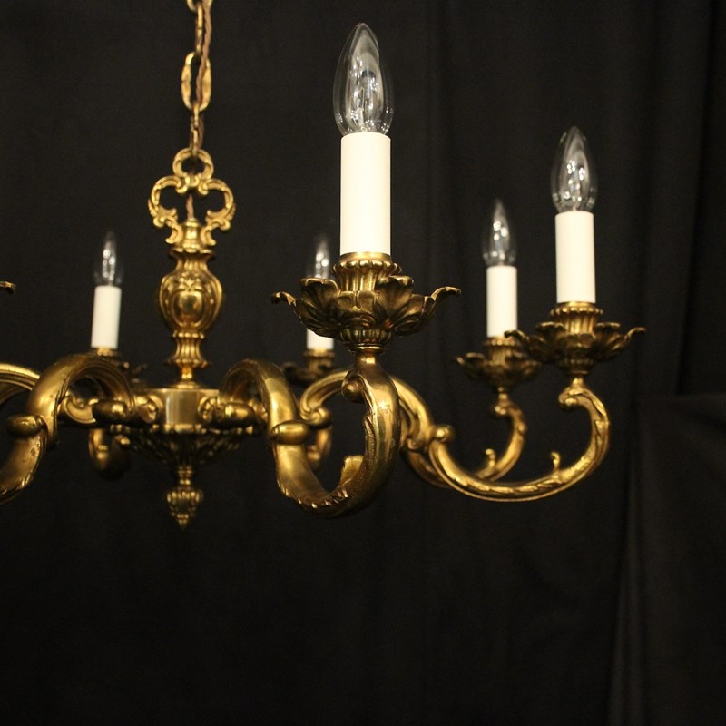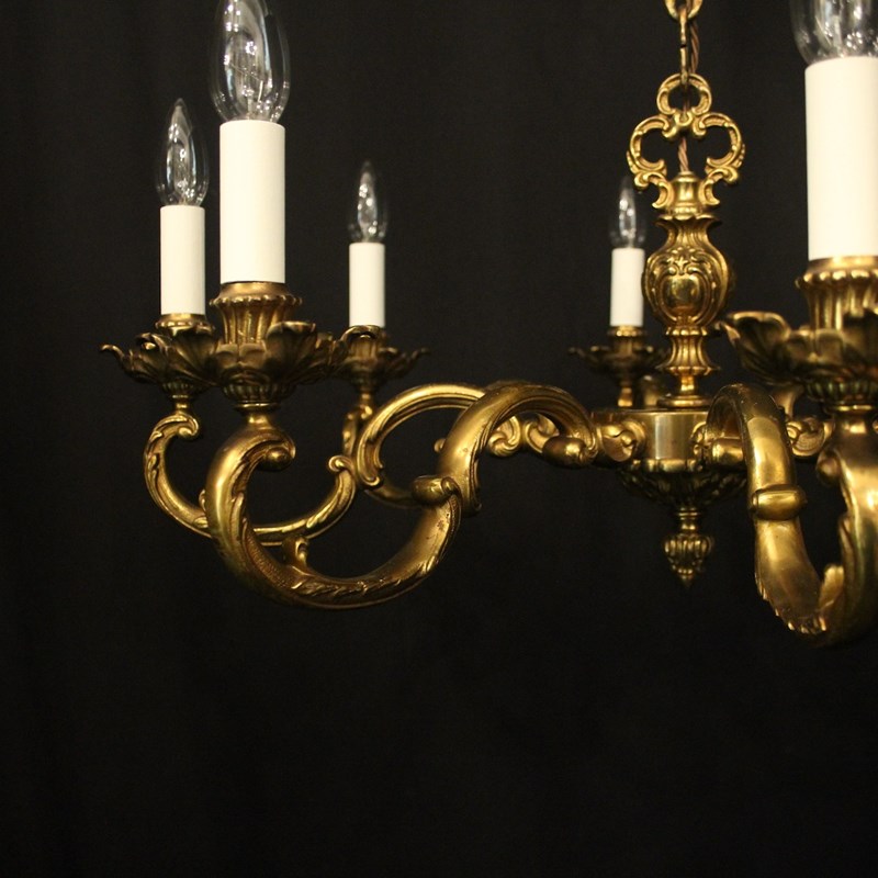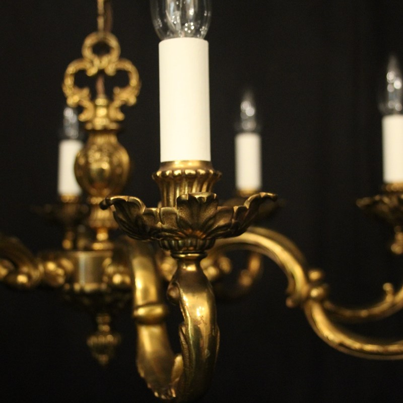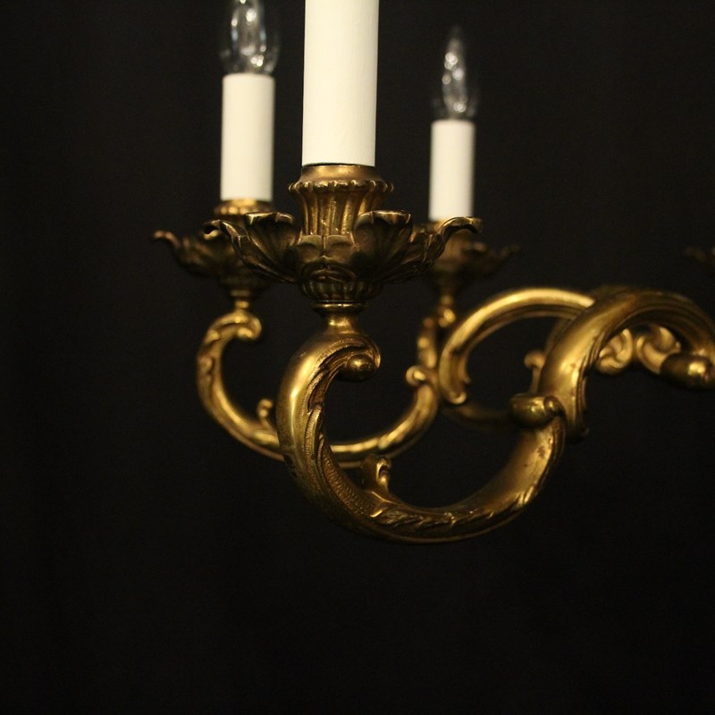 A French gilded bronze 8 light chandelier, the scrolling arms with leaf bobeche drip pans and reeded bulbous candle sconces, issuing from a decorative baluster central column with pierced finial and ornate leaf base, great wide proportions and lovely original colour. Fully rewired and PAT tested. All our chandeliers come with bulbs and ceiling fixings.