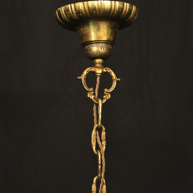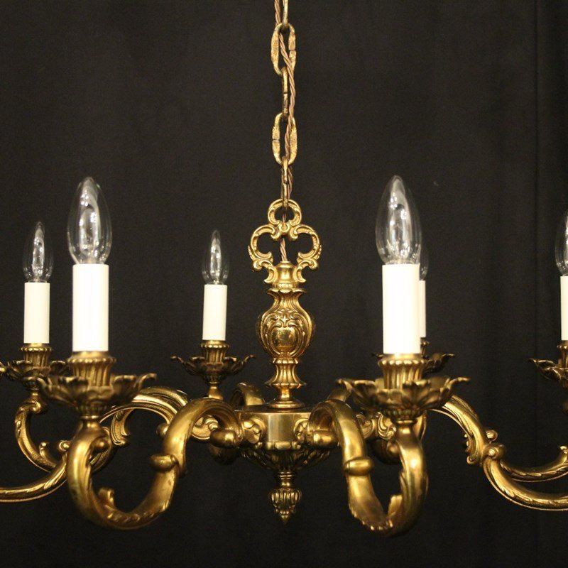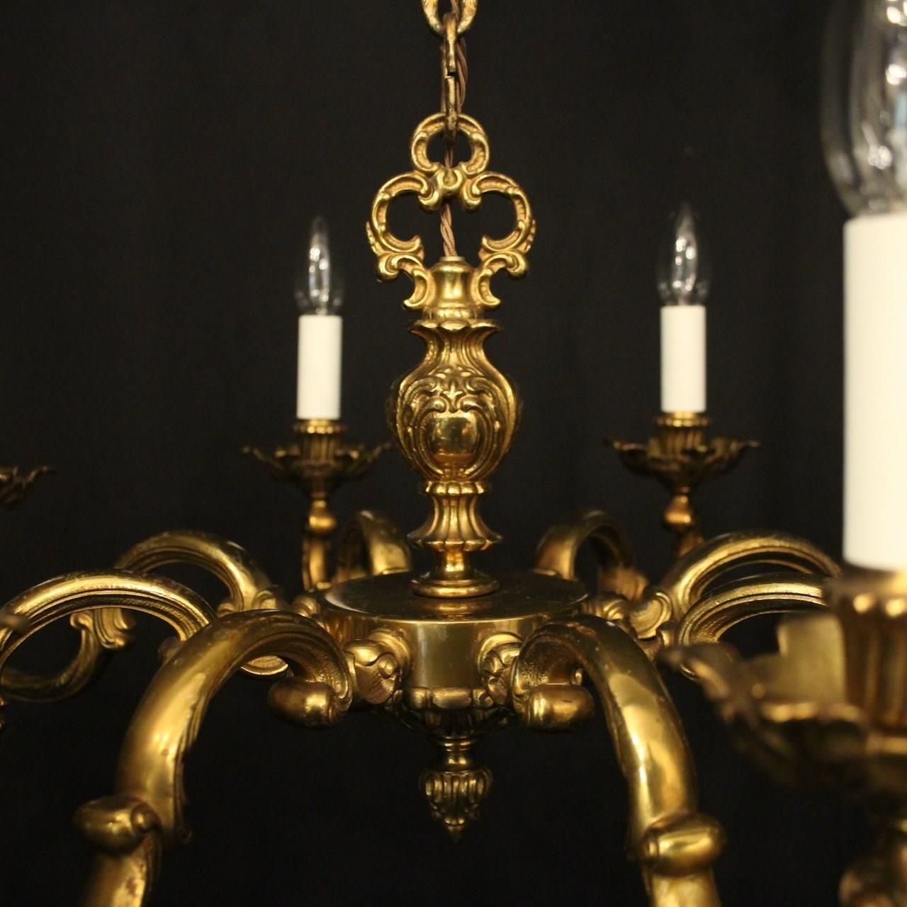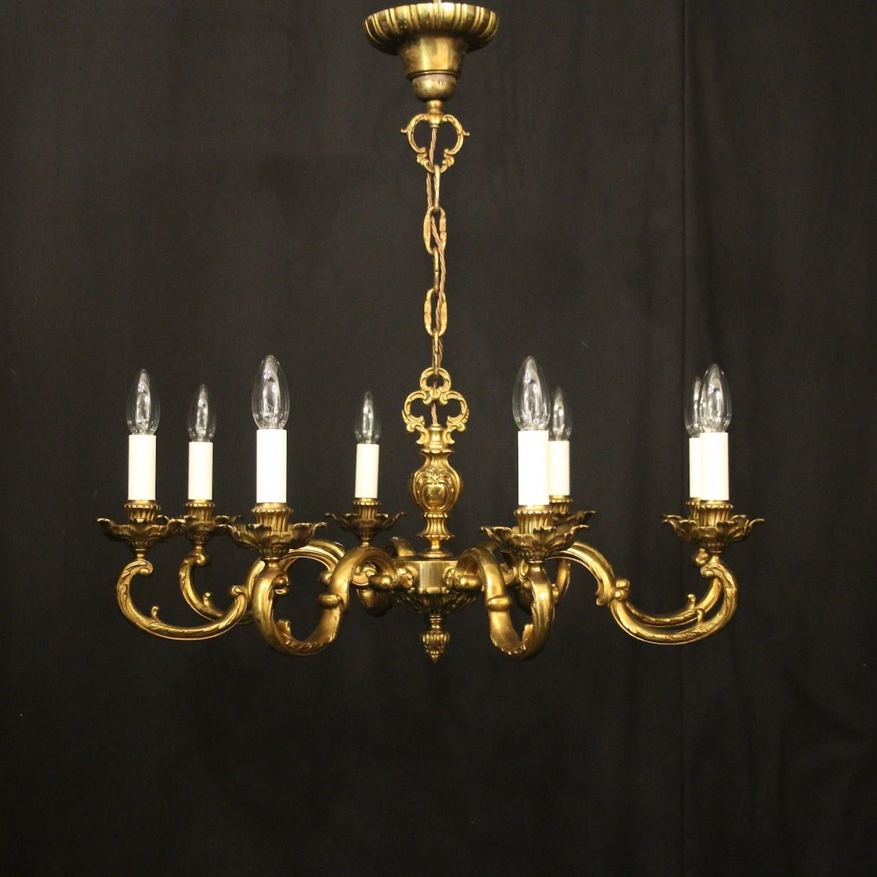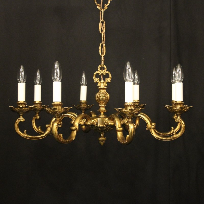 A French gilded bronze 8 light chandelier, the scrolling arms with leaf bobeche drip pans and reeded bulbous candle sconces, issuing from a decorative baluster central column with pierced finial and ornate leaf base, great wide proportions and lovely original colour. Fully rewired and PAT tested. All our chandeliers come with bulbs and ceiling fixings.