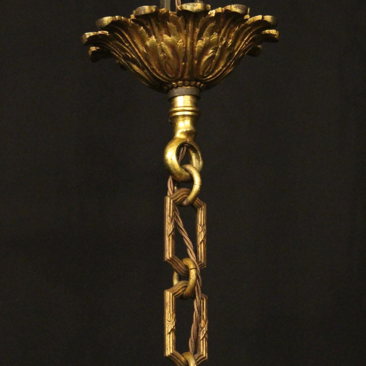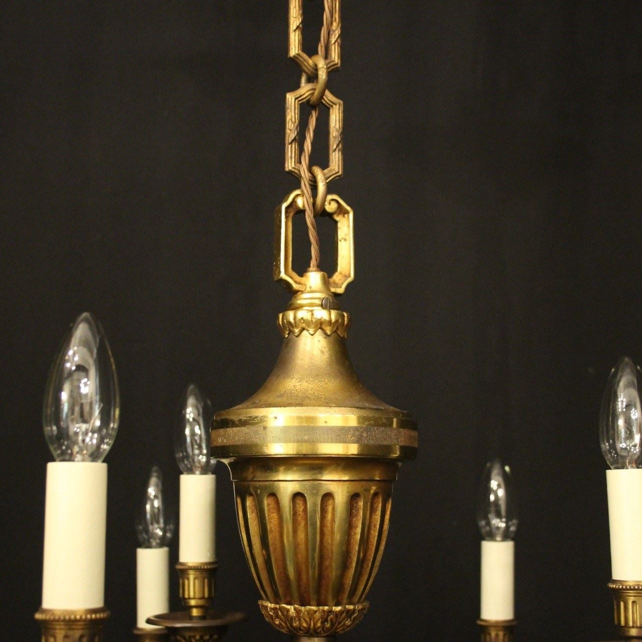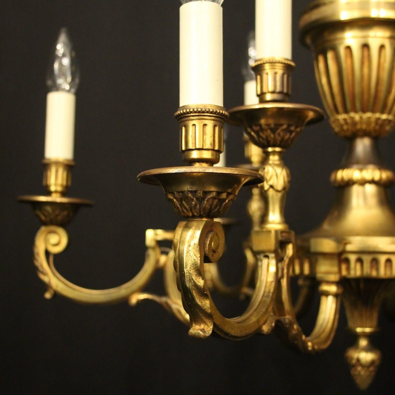 A French gilded bronze 9 light double tiered antique chandelier, the 6 & 3 square gauge leaf clad scrolling arms with circular bobeche drip pans and reeded millgrain candle sconces, issuing from a tapering reeded urn central column and trumpet base with inverted berried terminal, having the original chain and ceiling rose. Nice crisp gilded patination and well cast. Fully rewired and PAT tested. All our chandeliers come with bulbs and ceiling fixings.
