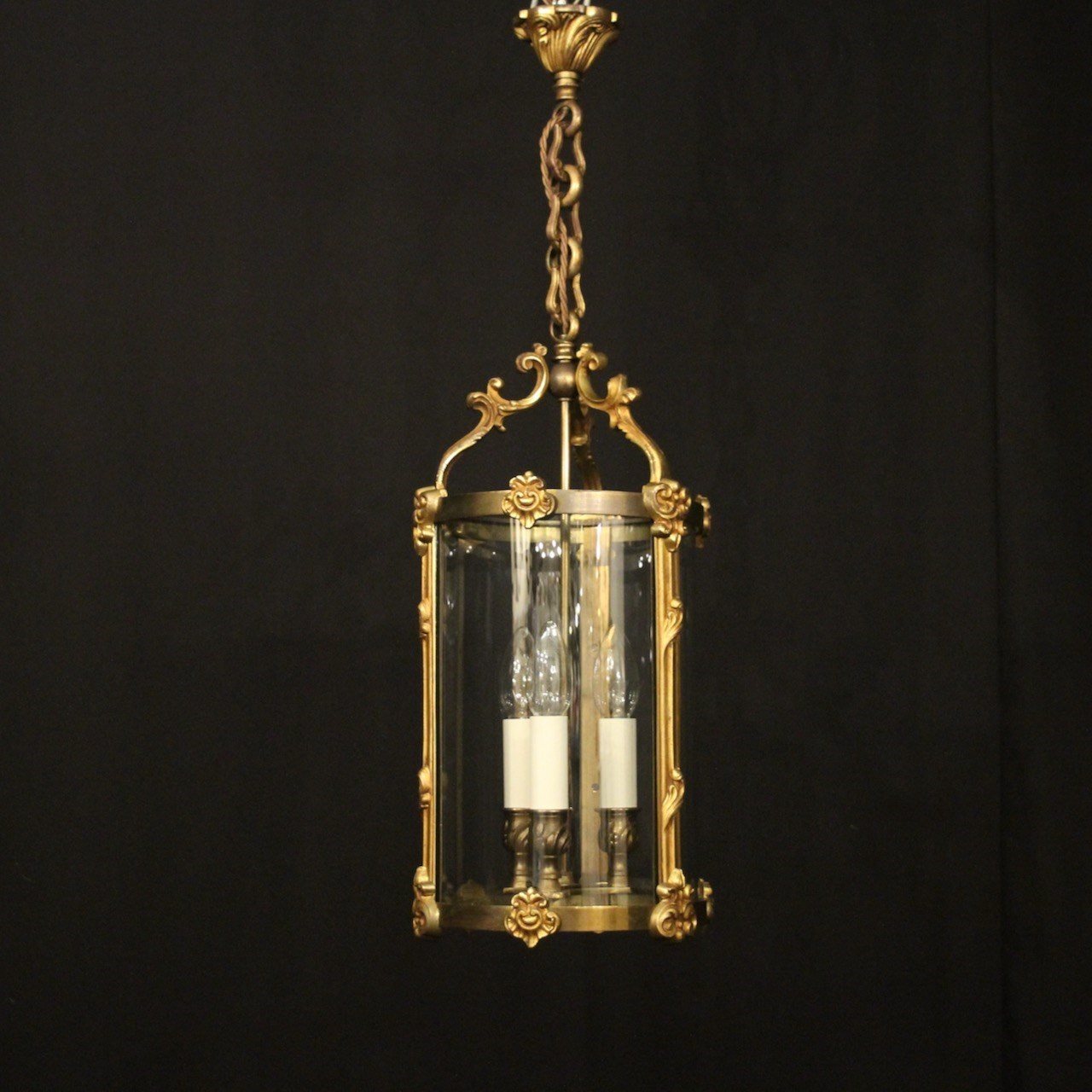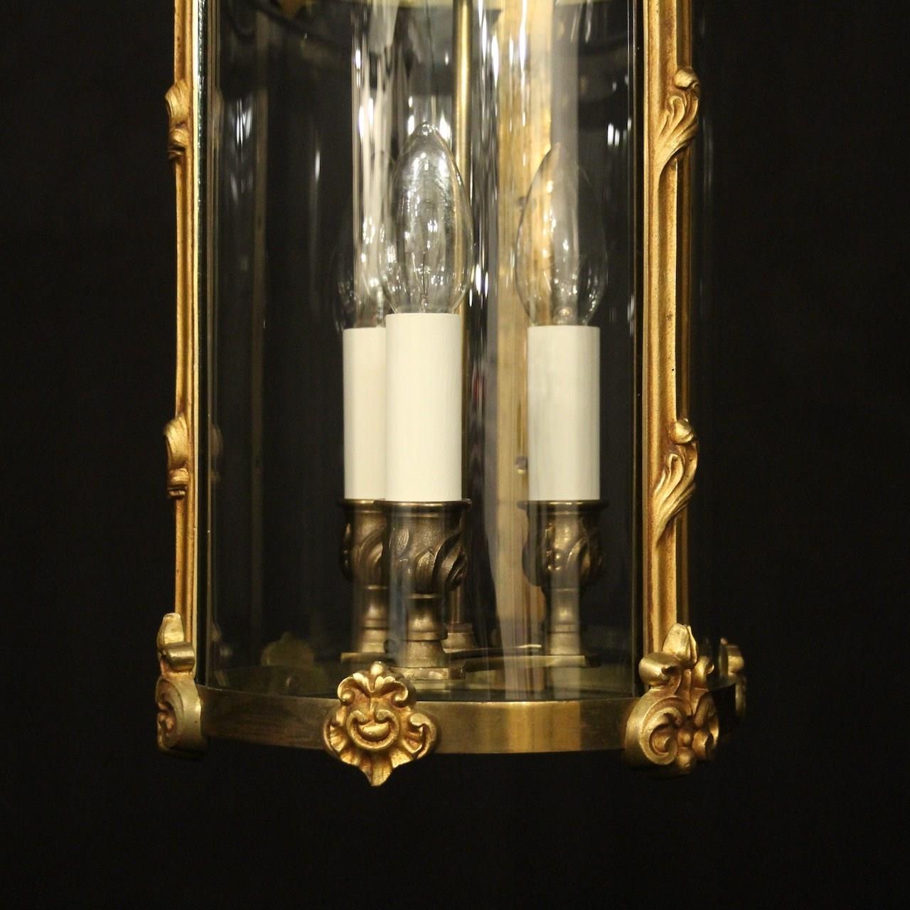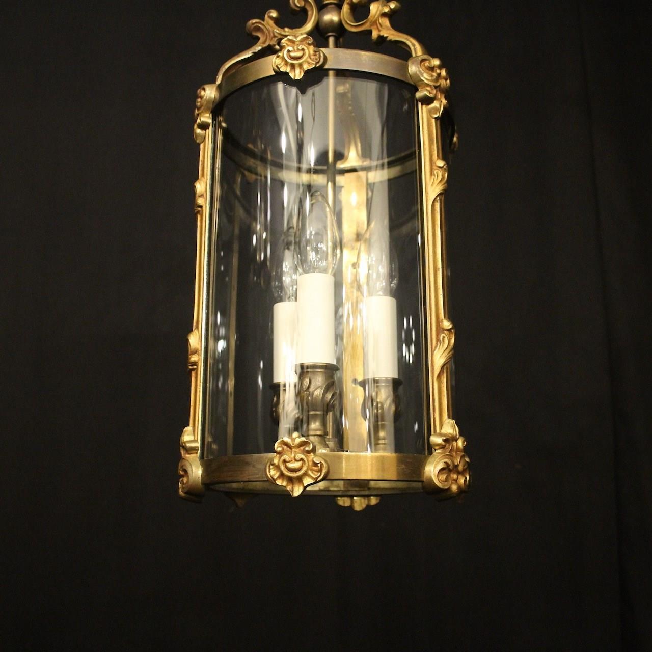 A French gilded bronze triple light antique hall lantern, the bulbous candle sconces, surrounded by sectional circular convex glass panels and held within an ornately cast heavy gauge scrolling framework with side reeded panels, decorative embellishments and open scrolling canopy, having the original chain and ceiling rose, Stamped L.C for Lucian Gau a great French bronze lighting manufacturer and designer, excellent original patination and a lovely scale. Fully rewired and PAT tested. All our lanterns come with bulbs and ceiling fixings.