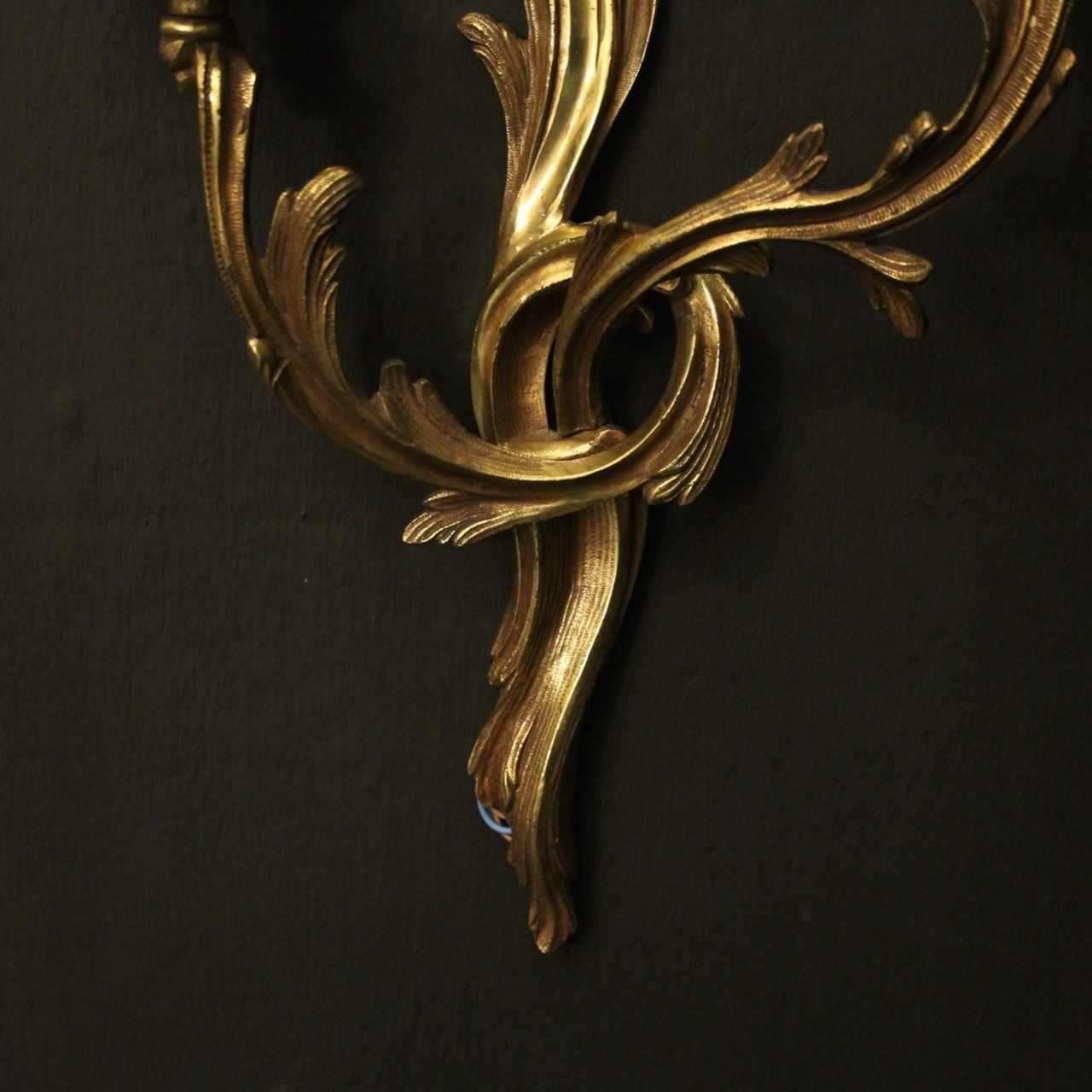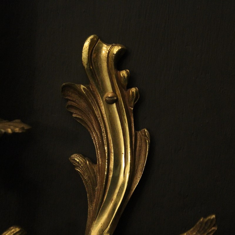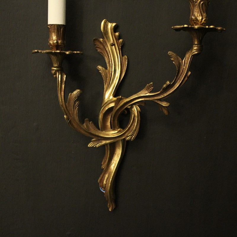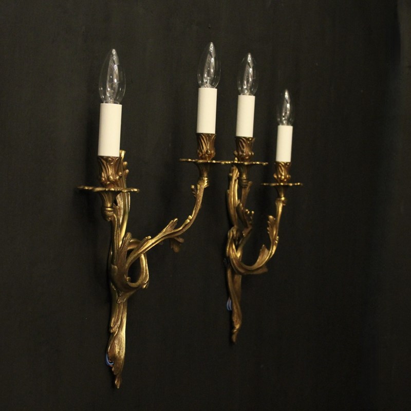 A French pair of gilded brass twin arm antique wall lights, the tiered leaf clad scrolling arms with foliated bobeche drip pans and bulbous candle sconces, issuing from an opposing leaf backplate. Fully rewired and PAT tested. All our wall lights come with aged brass screws or brackets for fixing and spare bulbs.
