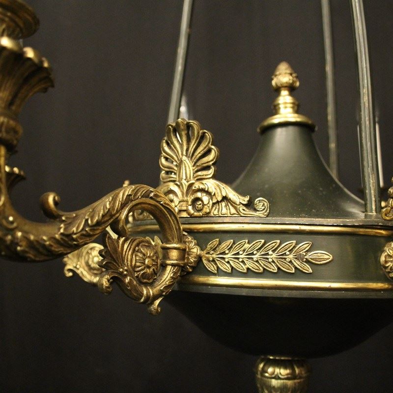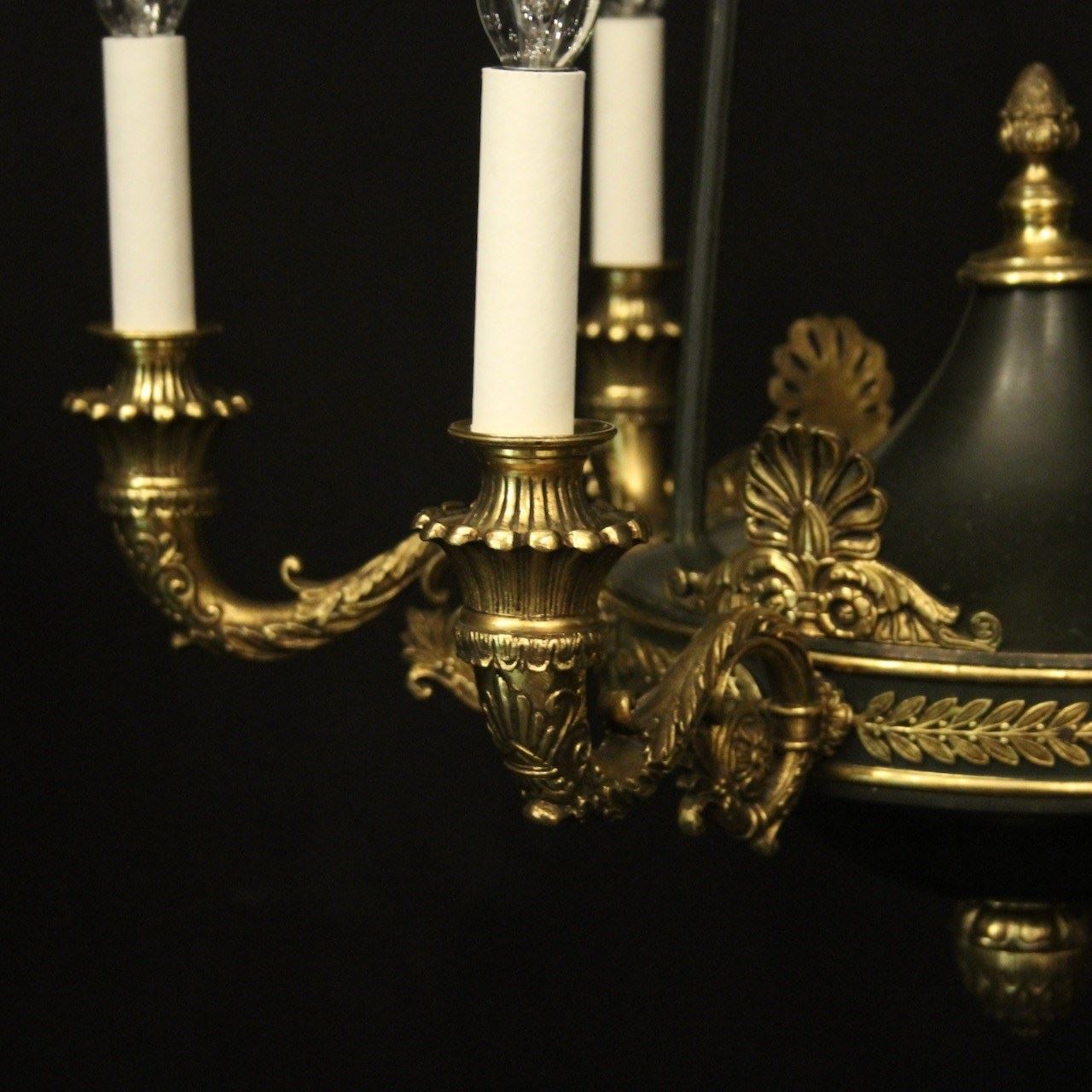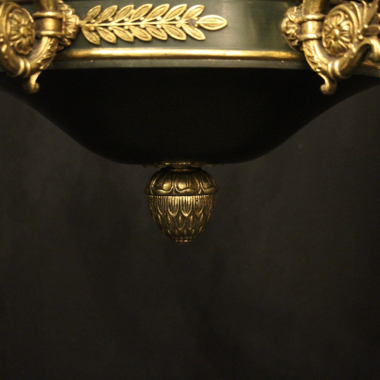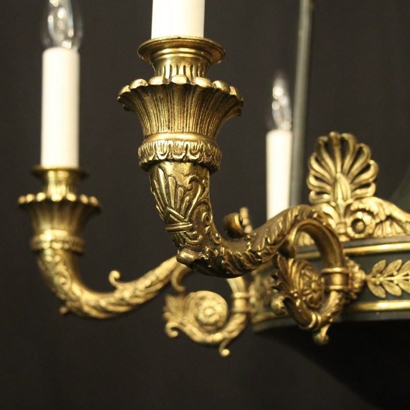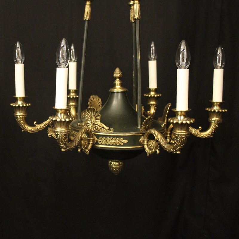 A French Empire gilded bronze and dark green enamelled 6 light antique chandelier, the decorative leaf scolling arms with reeded scalloped candle sconces, issuing from a green enamelled leaf centre banding with acorn finial and ornate terminal, held with three reeded columns with pierced Anthemion canopy. Super original patiantion and nice quality. Fully rewired and PAT tested. All our chandeliers come with ceiling fixings and spare bulbs.