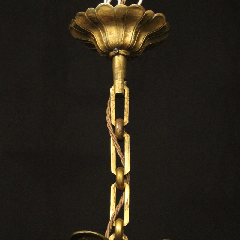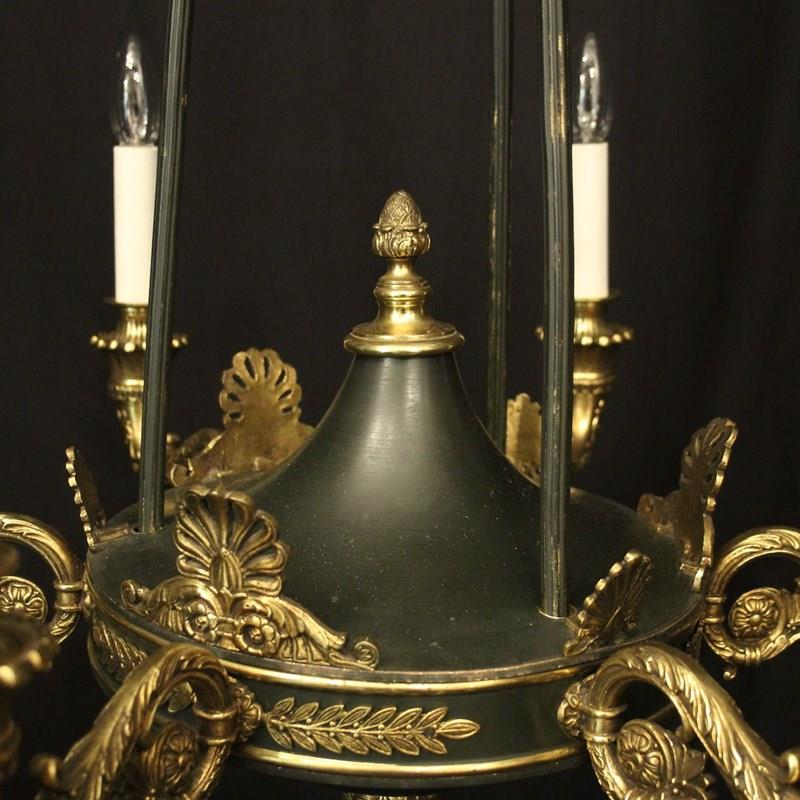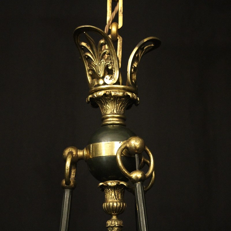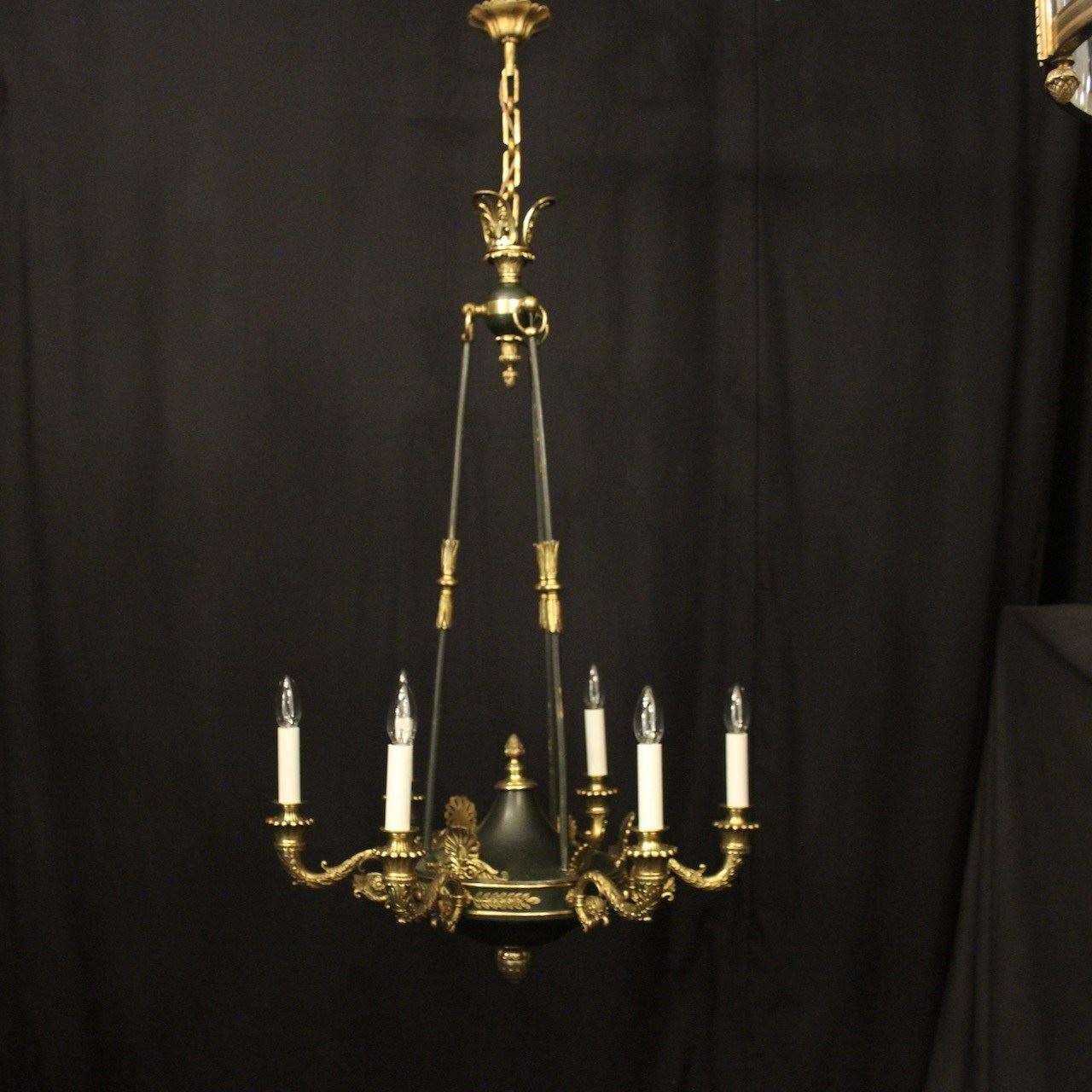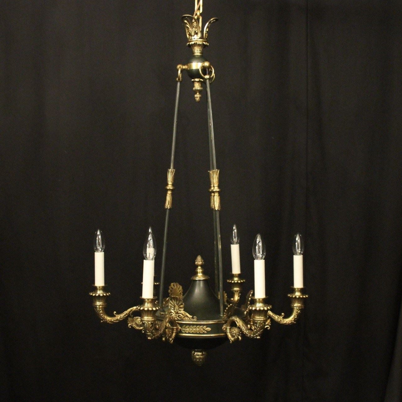 A French Empire gilded bronze and dark green enamelled 6 light antique chandelier, the decorative leaf scolling arms with reeded scalloped candle sconces, issuing from a green enamelled leaf centre banding with acorn finial and ornate terminal, held with three reeded columns with pierced Anthemion canopy. Super original patiantion and nice quality. Fully rewired and PAT tested. All our chandeliers come with ceiling fixings and spare bulbs.