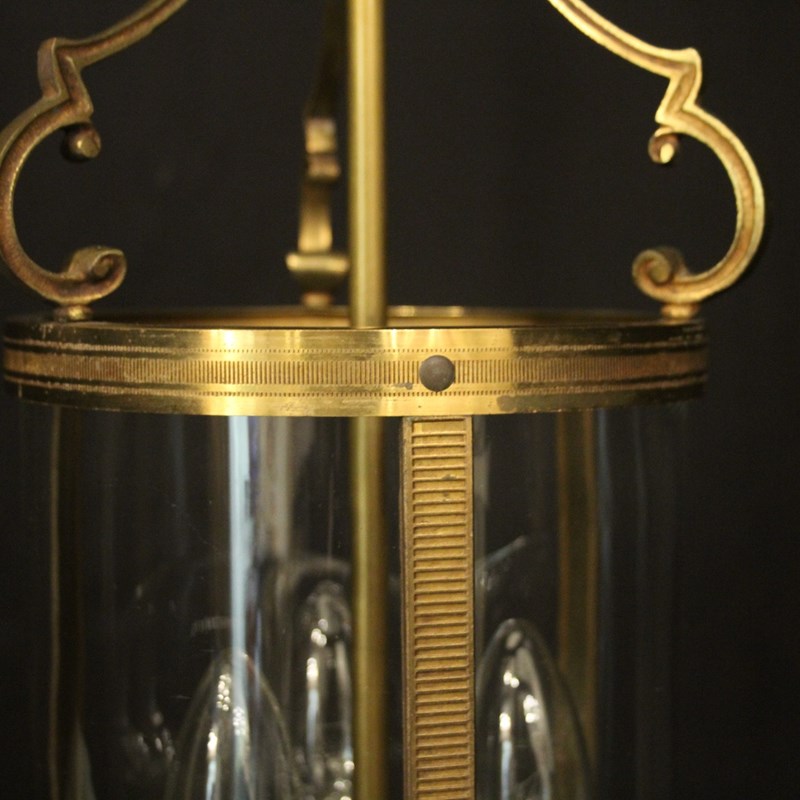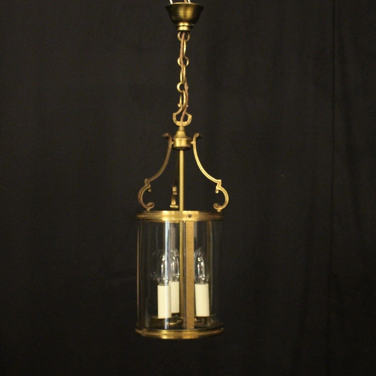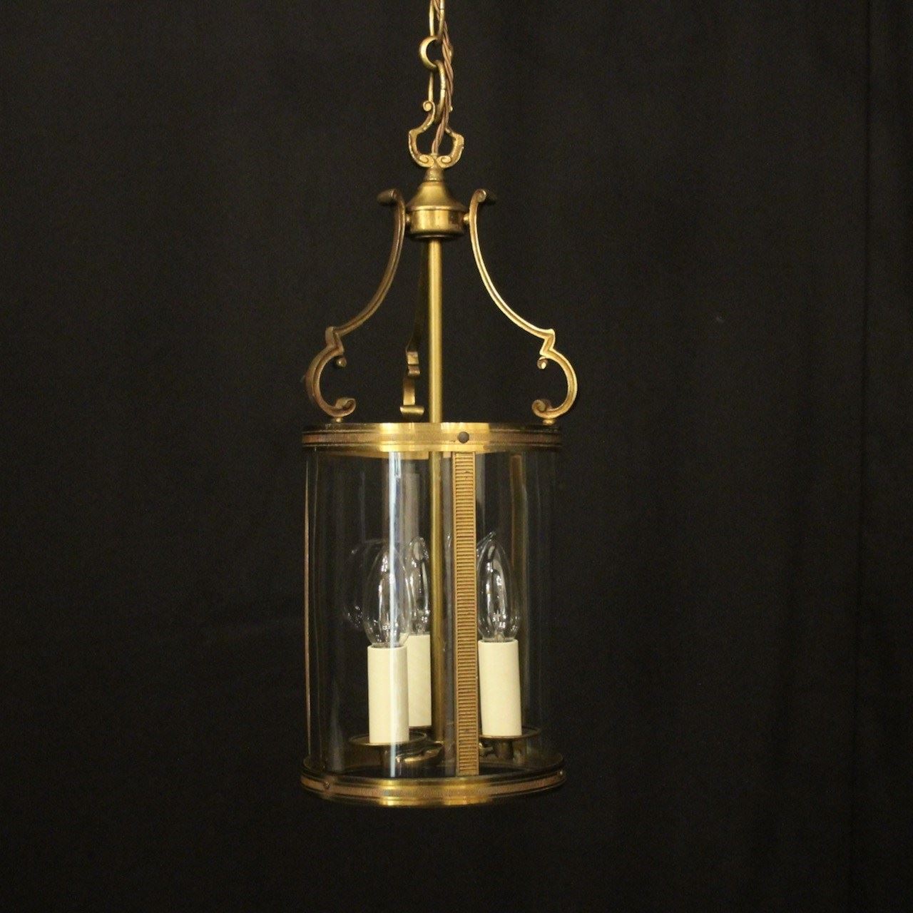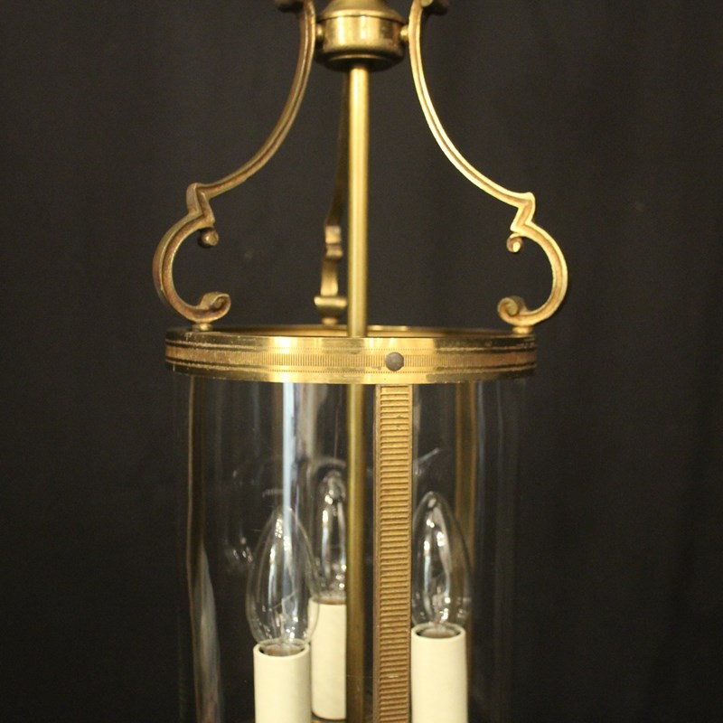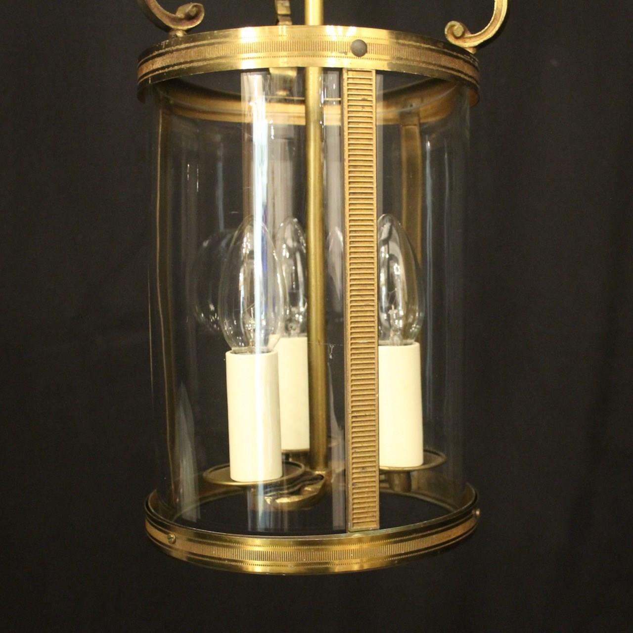 A French gilded brass triple light antique hall lantern, the three light fittings with circular bobeche drip pans, surrounded by a single circular convex glass panel, held within a decorative scrolling framework with reeded banding, reeded side sections and floral central finial with a square gauge scrolling canopy and having the original chain and ceiling rose. Fully rewired and PAT tested. All our lanterns come with bulbs and ceiling fixings.