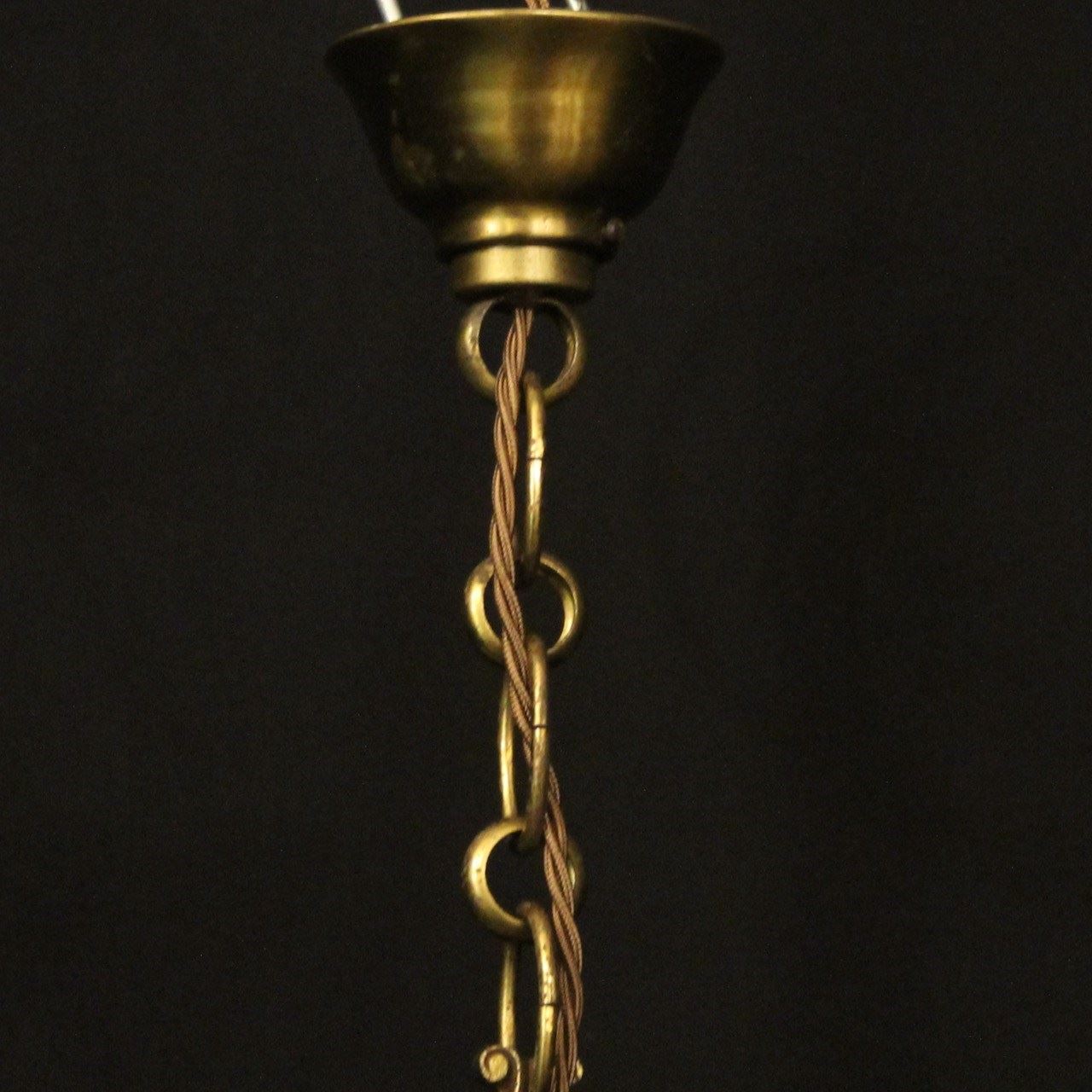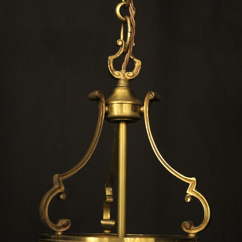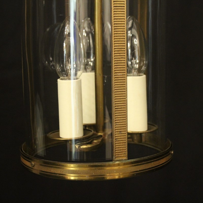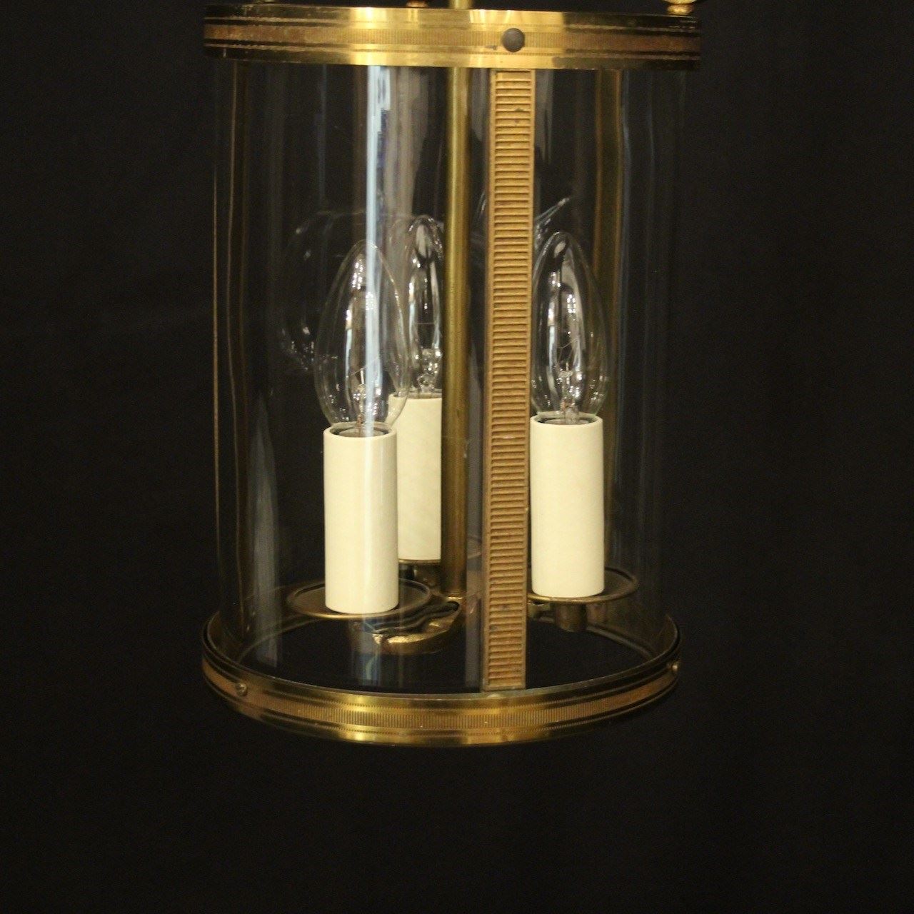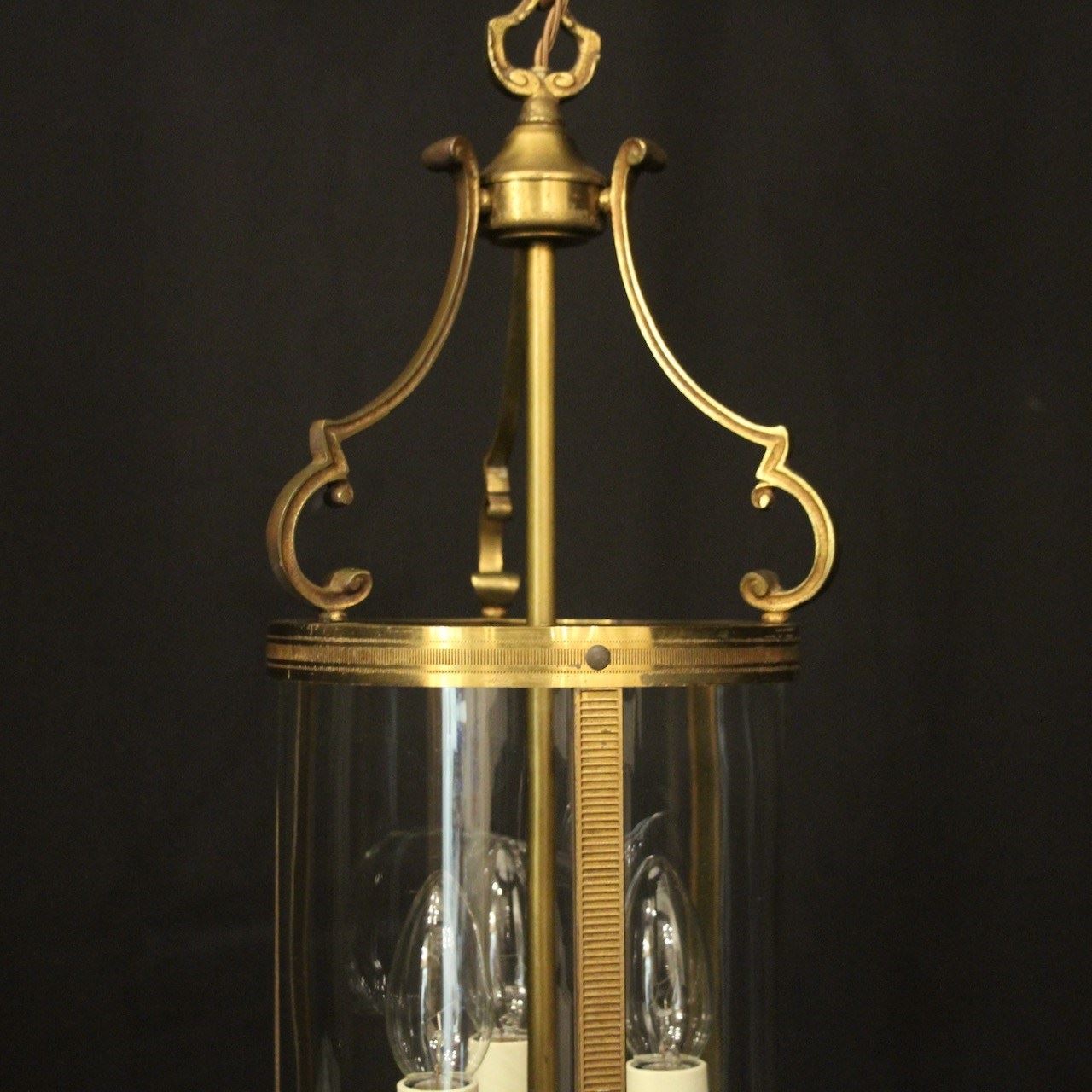 A French gilded brass triple light antique hall lantern, the three light fittings with circular bobeche drip pans, surrounded by a single circular convex glass panel, held within a decorative scrolling framework with reeded banding, reeded side sections and floral central finial with a square gauge scrolling canopy and having the original chain and ceiling rose. Fully rewired and PAT tested. All our lanterns come with bulbs and ceiling fixings.