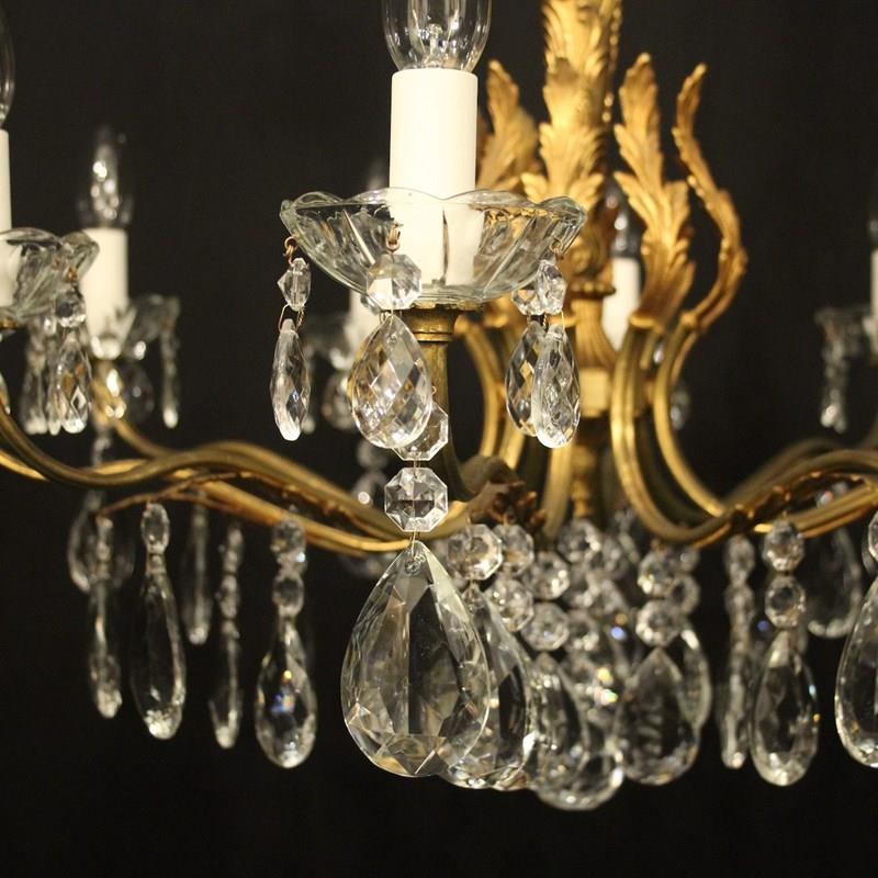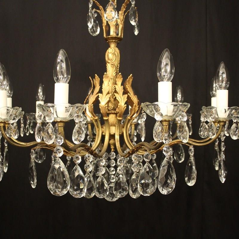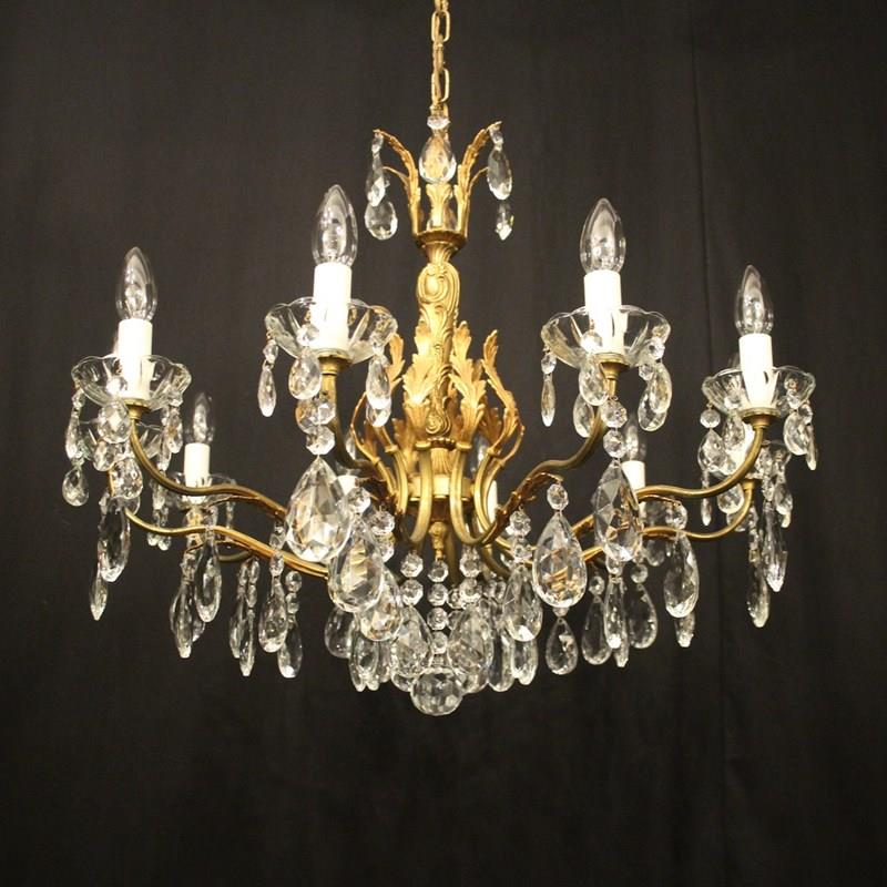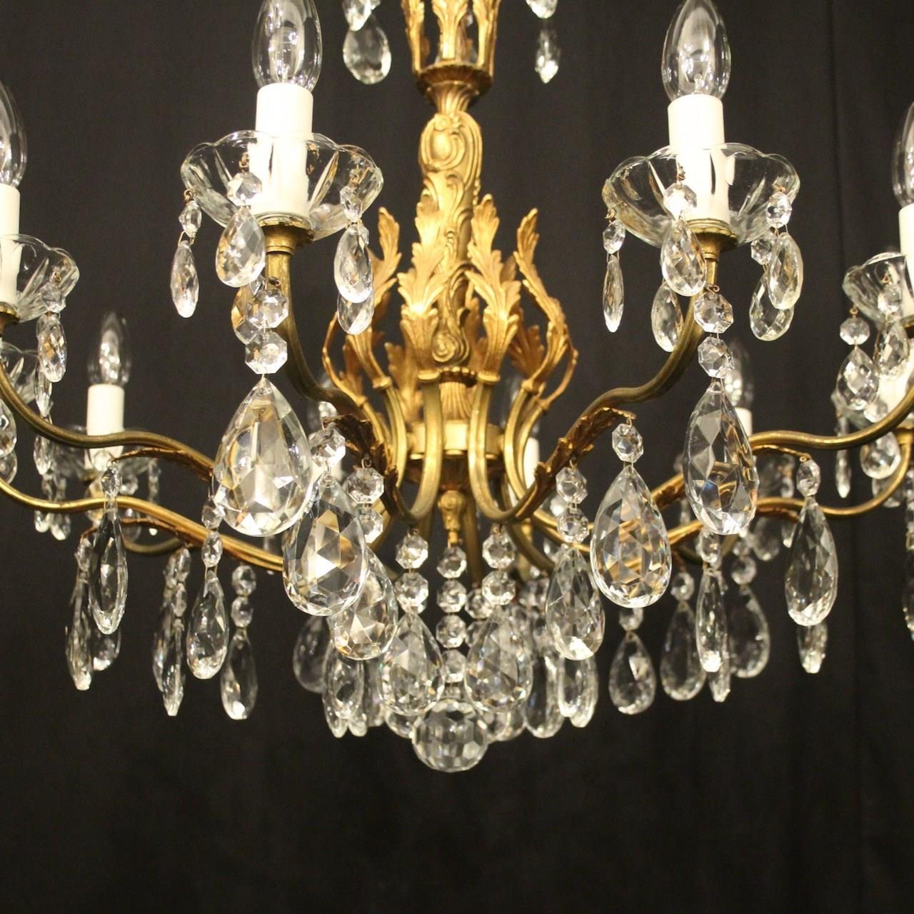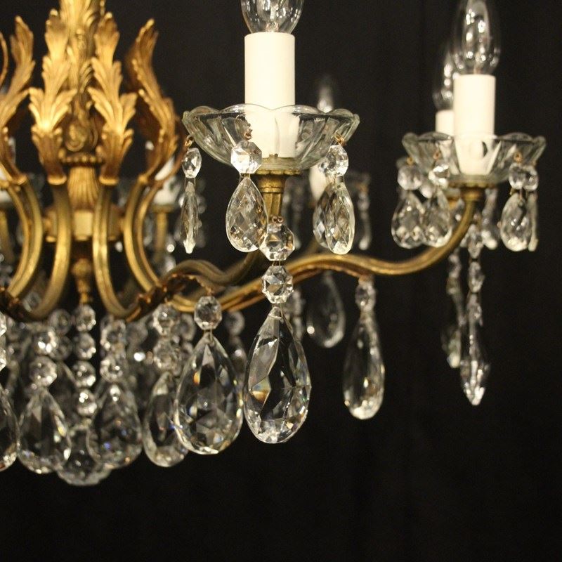 A French gilded brass and crystal 10 light chandelier, the leaf scrolling arms with glass bobeche drip pans, issuing from a bulbous tapering foliated central column with leaf canopy, decorated overall with faceted crystal pendants and having the original chain and ceiling rose. Great wide proportions. Fully rewired and PAT tested. All our chandeliers come with ceiling fixings and spare bulbs. We have an almost identical chandelier to this OKA05581