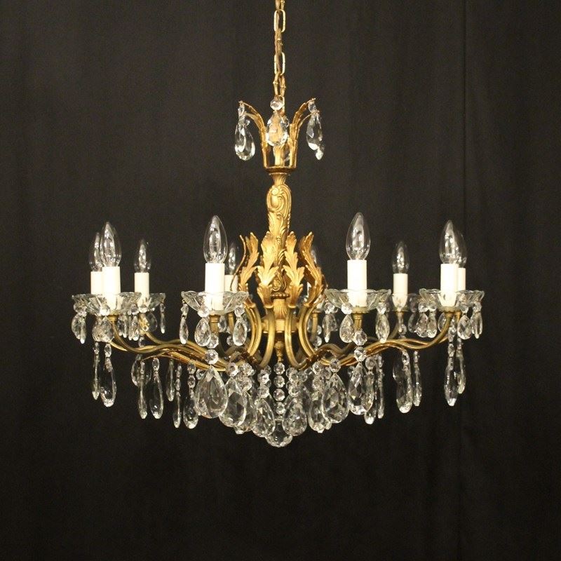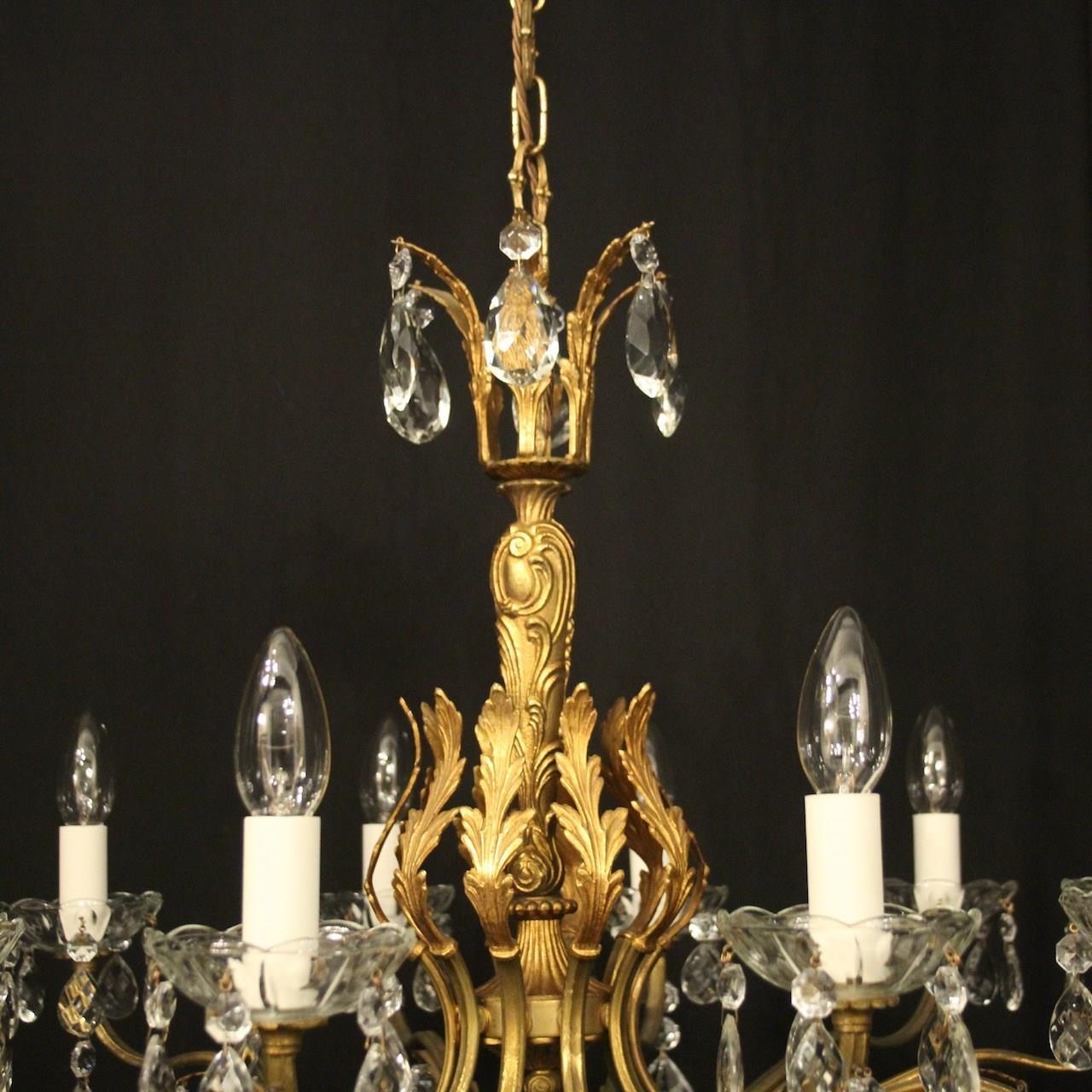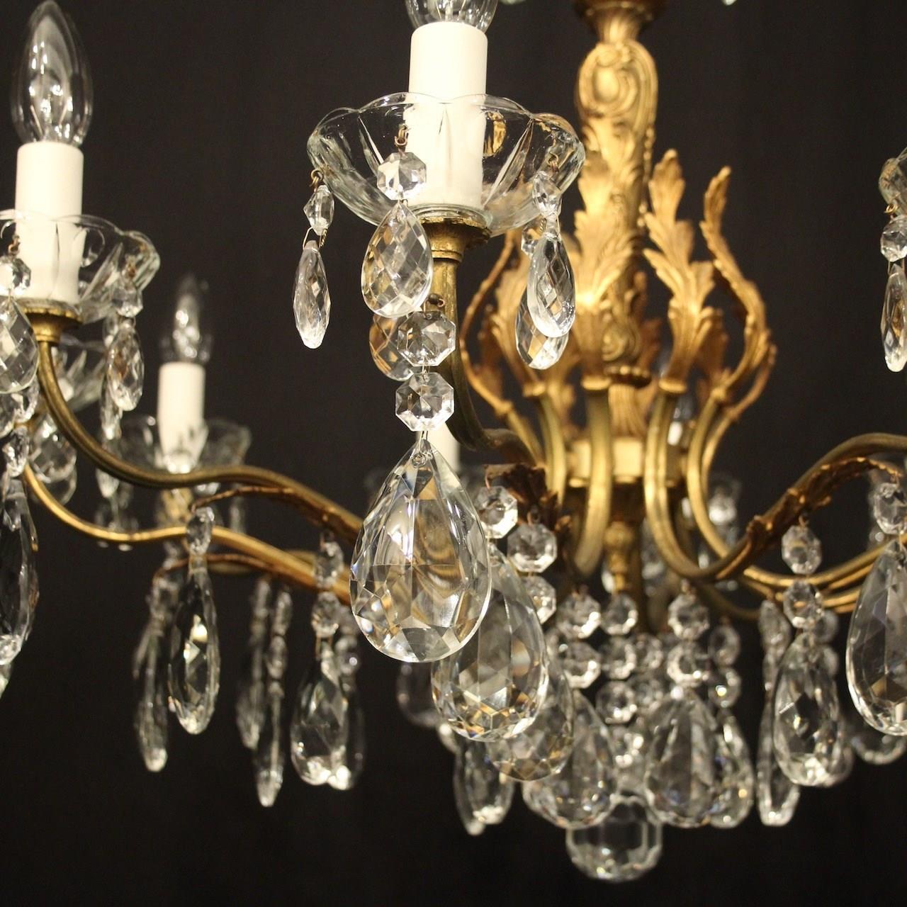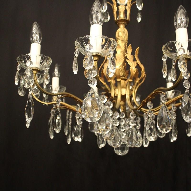 A French gilded brass and crystal 10 light chandelier, the leaf scrolling arms with glass bobeche drip pans, issuing from a bulbous tapering foliated central column with leaf canopy, decorated overall with faceted crystal pendants and having the original chain and ceiling rose. Great wide proportions. Fully rewired and PAT tested. All our chandeliers come with ceiling fixings and spare bulbs. We have an almost identical chandelier to this OKA05581