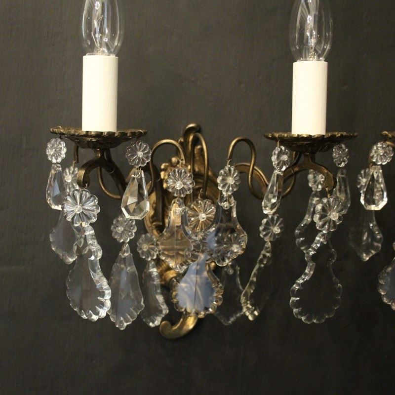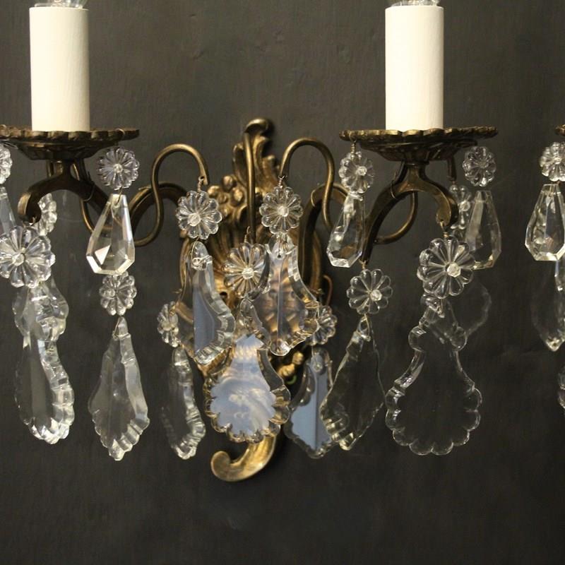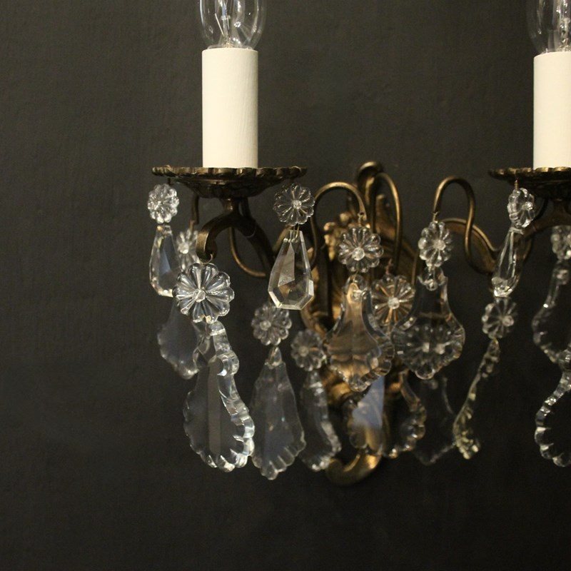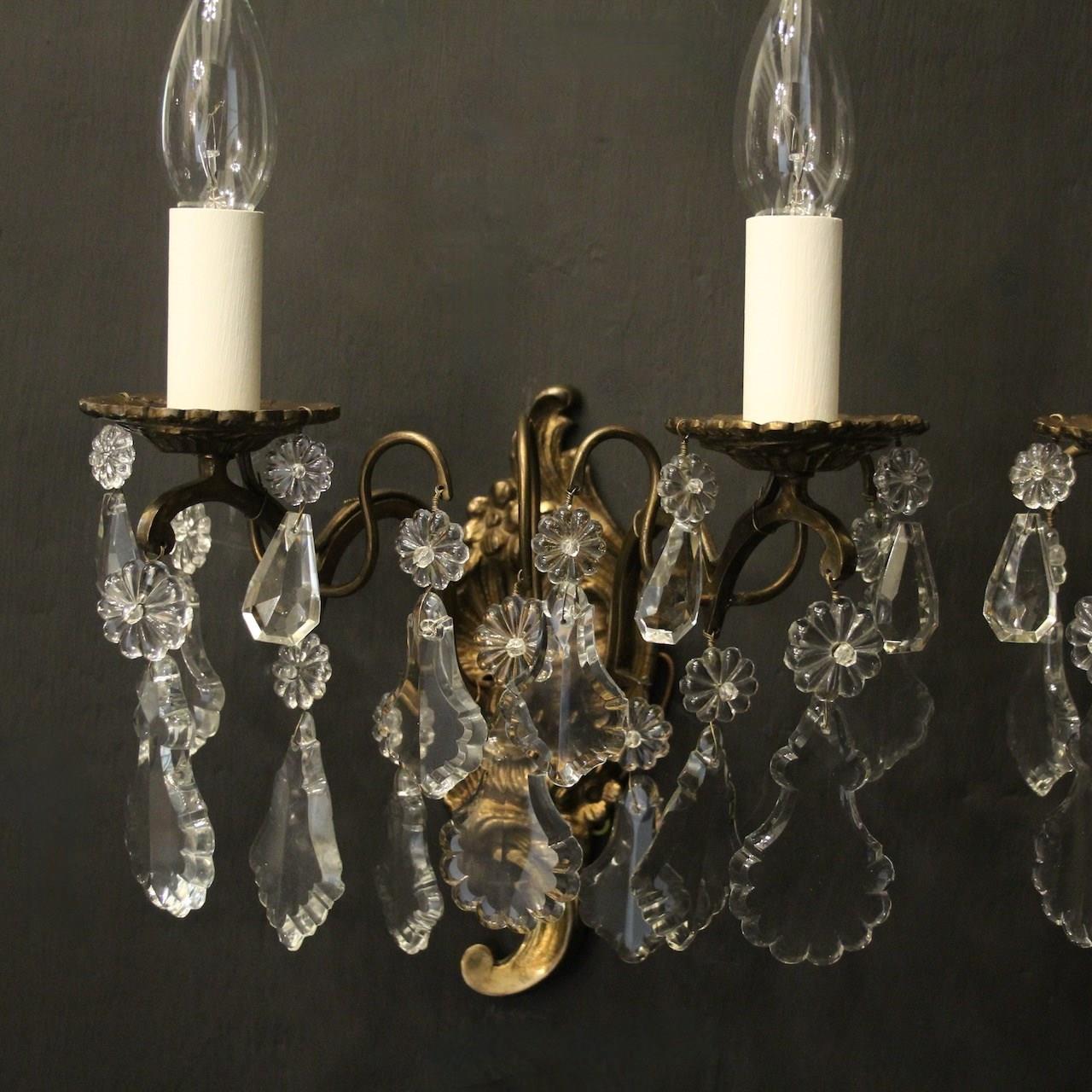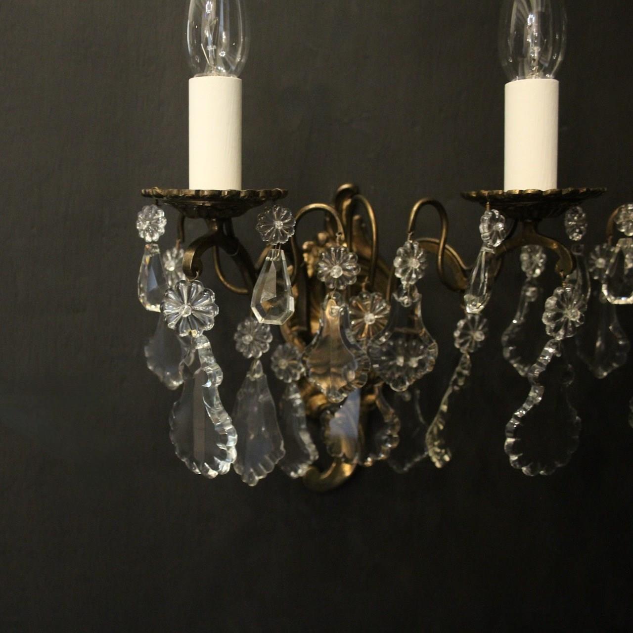 A French pair of faded brass and crystal twin arm antique wall lights, the square gauge scrolling arms with leaf bobeche drip pans, issuing from a cartouche leaf backplate and decorated overall with French Slab crystal faceted pendants. Fully rewired and PAT tested. All our wall lights come with aged brass screws for fixing and spare bulbs.