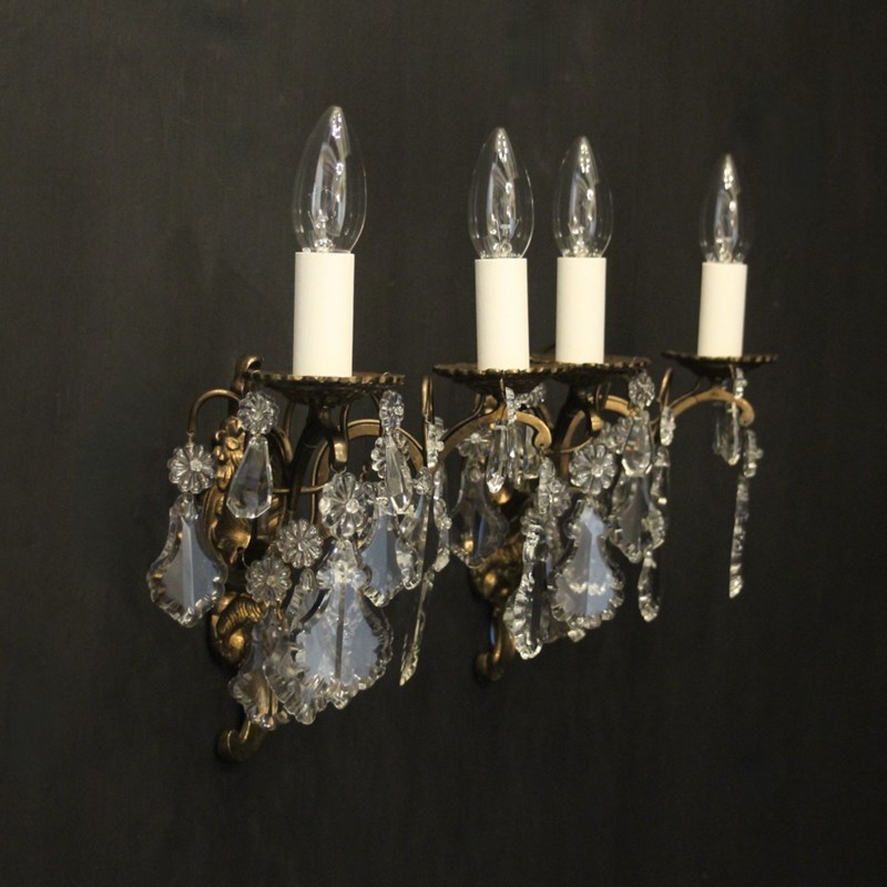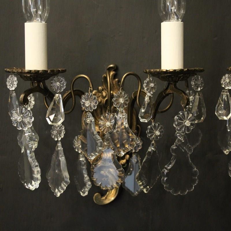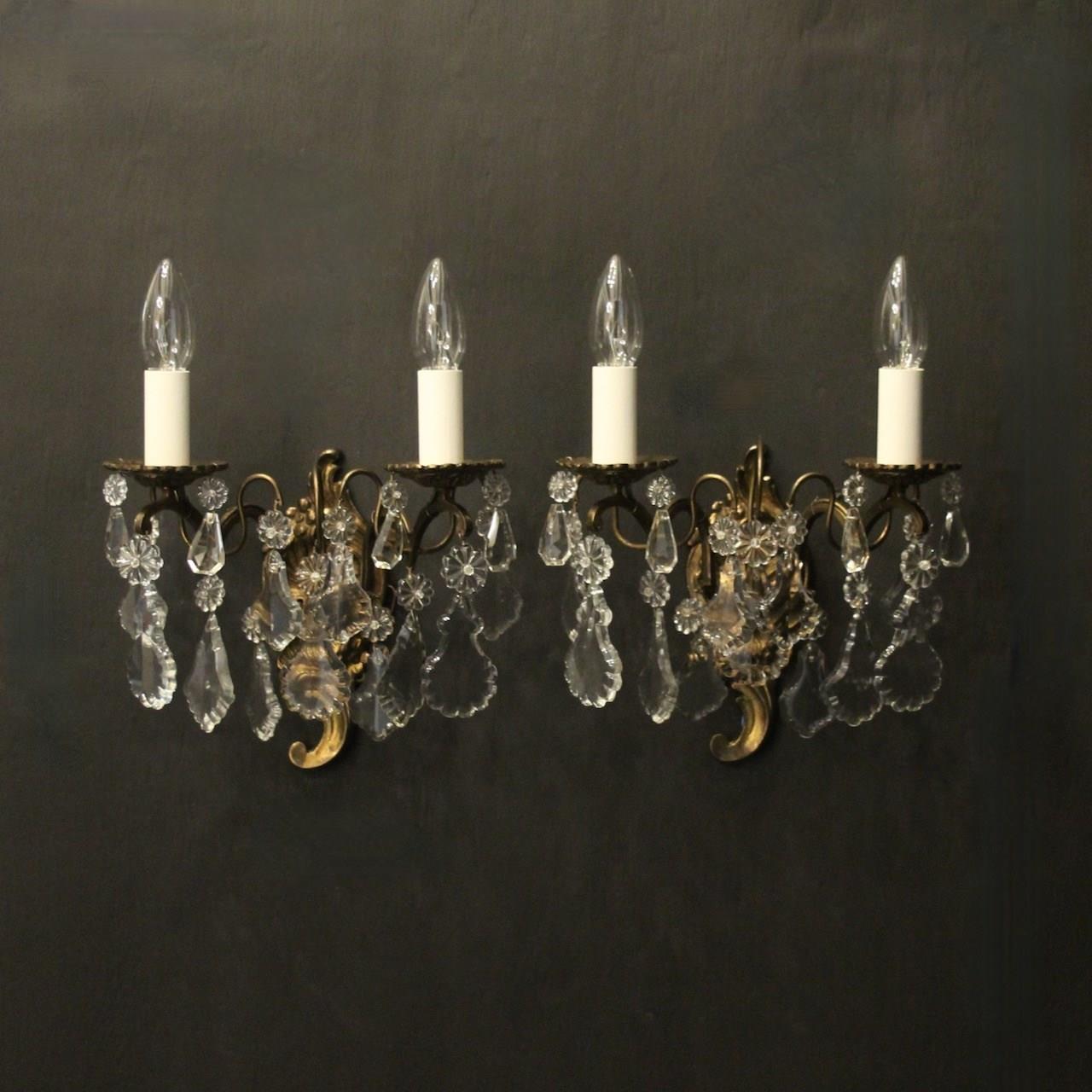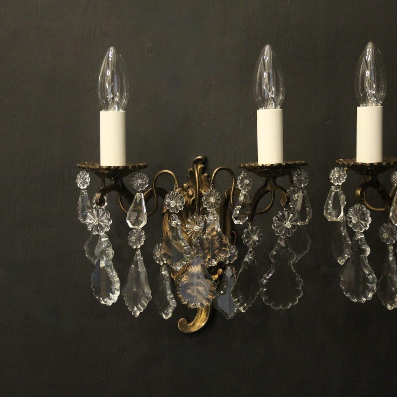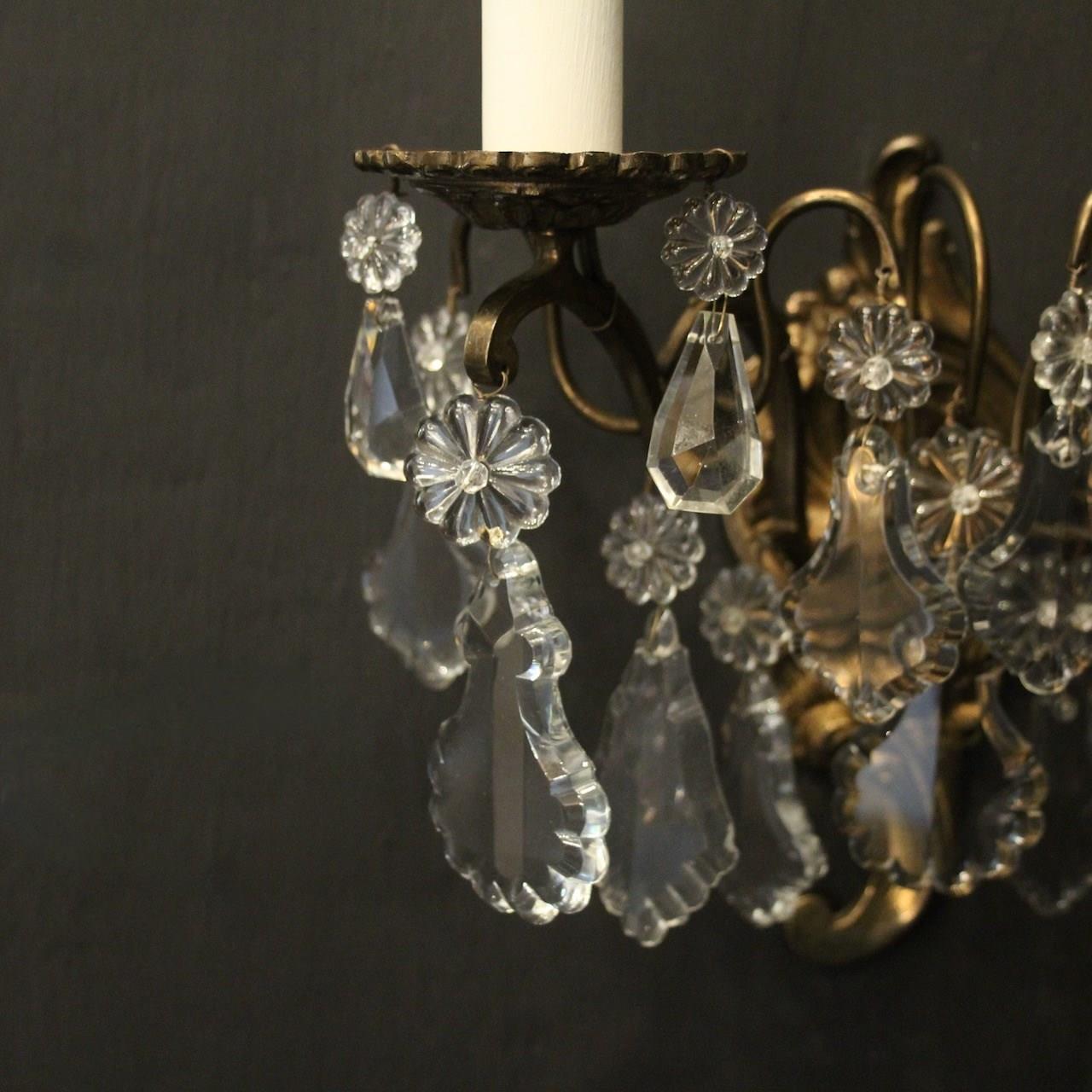 A French pair of faded brass and crystal twin arm antique wall lights, the square gauge scrolling arms with leaf bobeche drip pans, issuing from a cartouche leaf backplate and decorated overall with French Slab crystal faceted pendants. Fully rewired and PAT tested. All our wall lights come with aged brass screws for fixing and spare bulbs.
