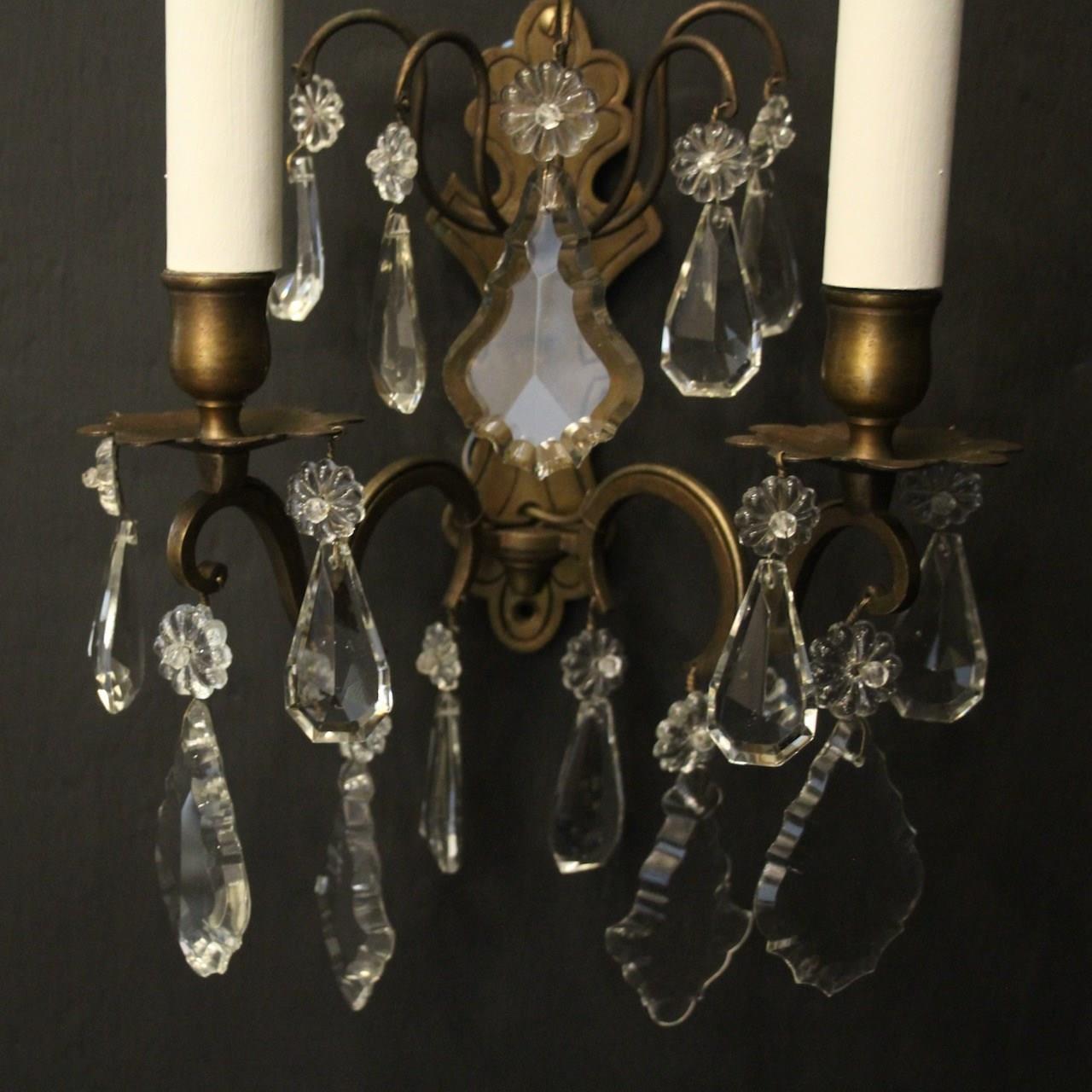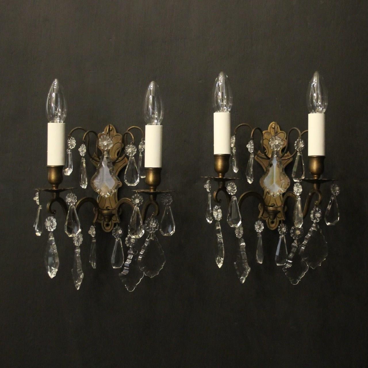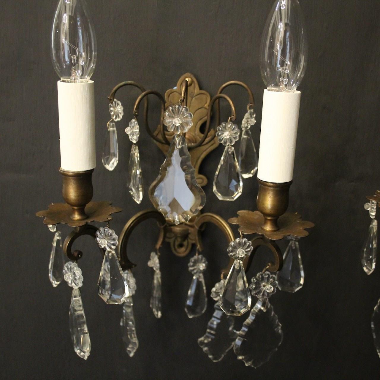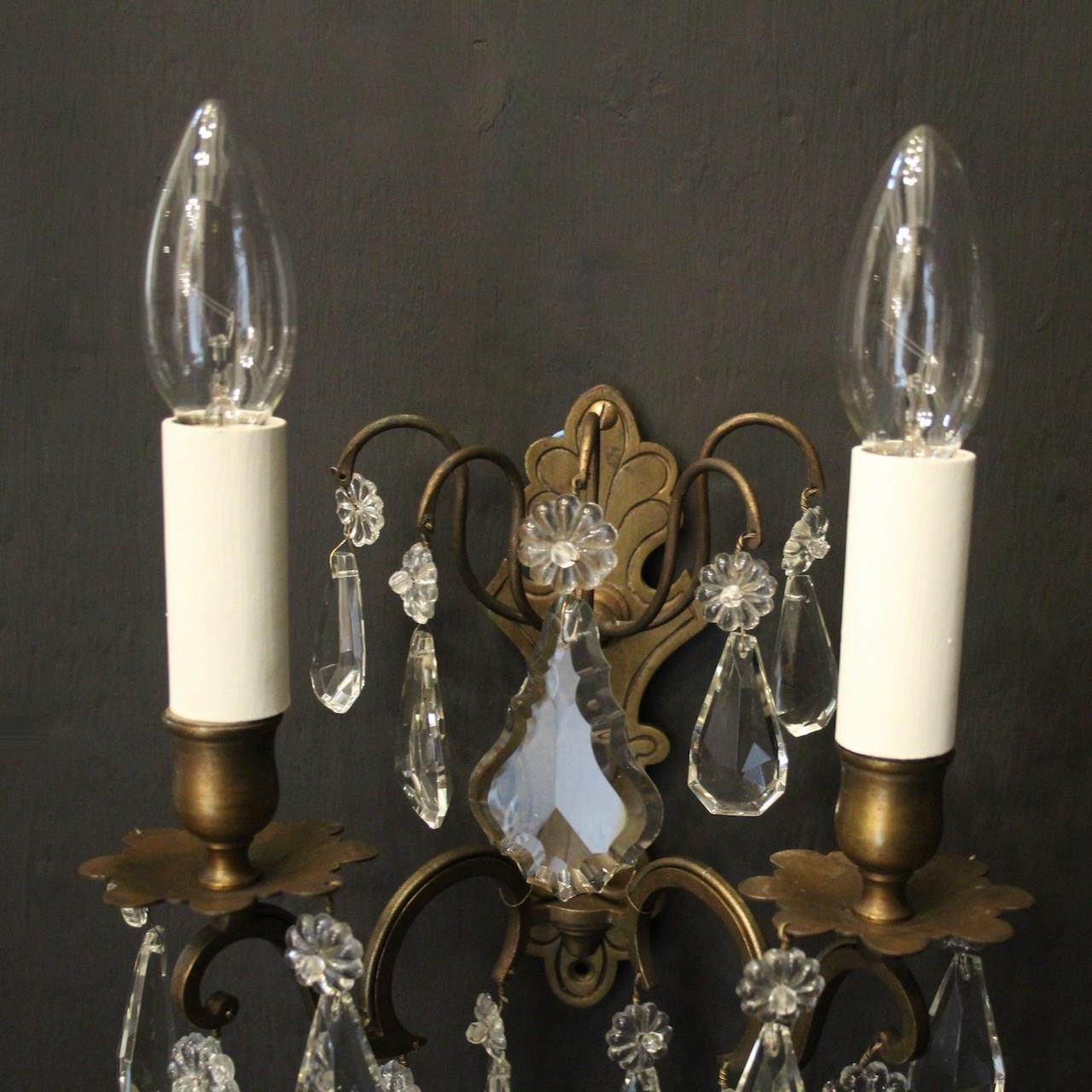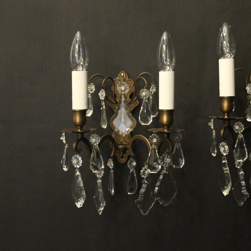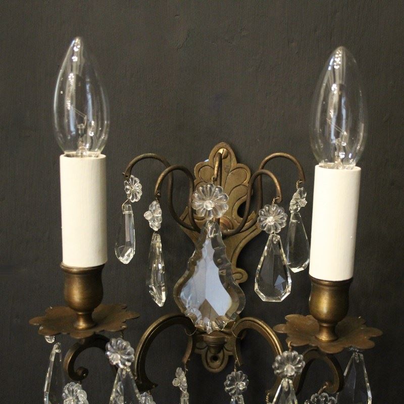A French pair of faded brass and crystal twin arm antique wall lights, the square gauge scrolling arms with leaf bobeche drip pans and bulbous candle sconces, issuing from a leaf backplate with scrolling wirework canopy and decorated overall with French Slab crystal faceted pendants. Fully rewired and PAT tested. All our wall lights come with aged brass screws for fixing and spare bulbs.Dimensions: H: 13"/33cm W: 9"/23cm D: 6"/15cmCirca: Early 20th CenturyProduct Ref: OKA05539