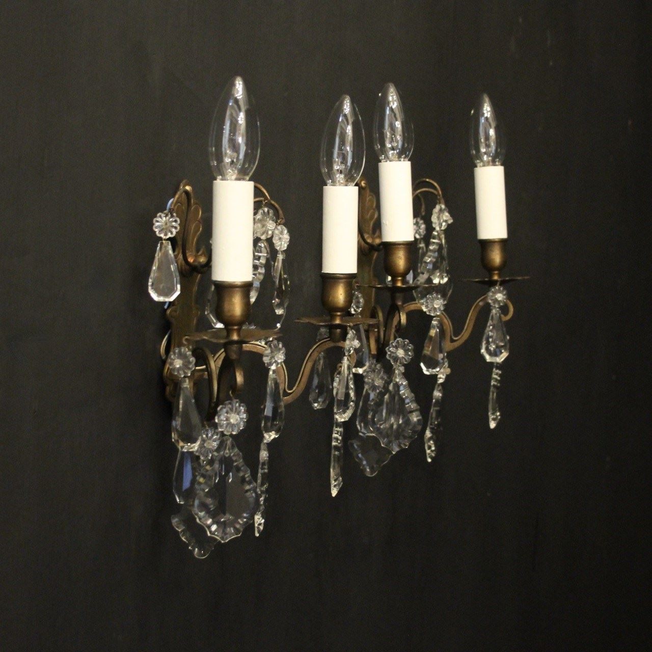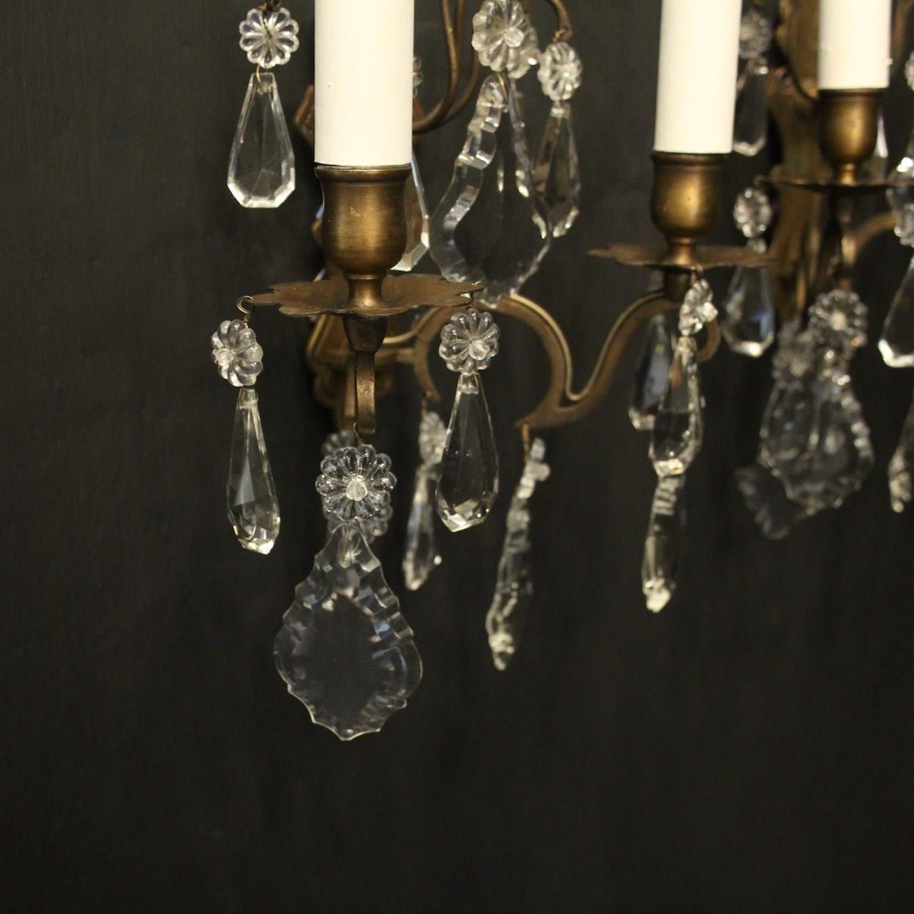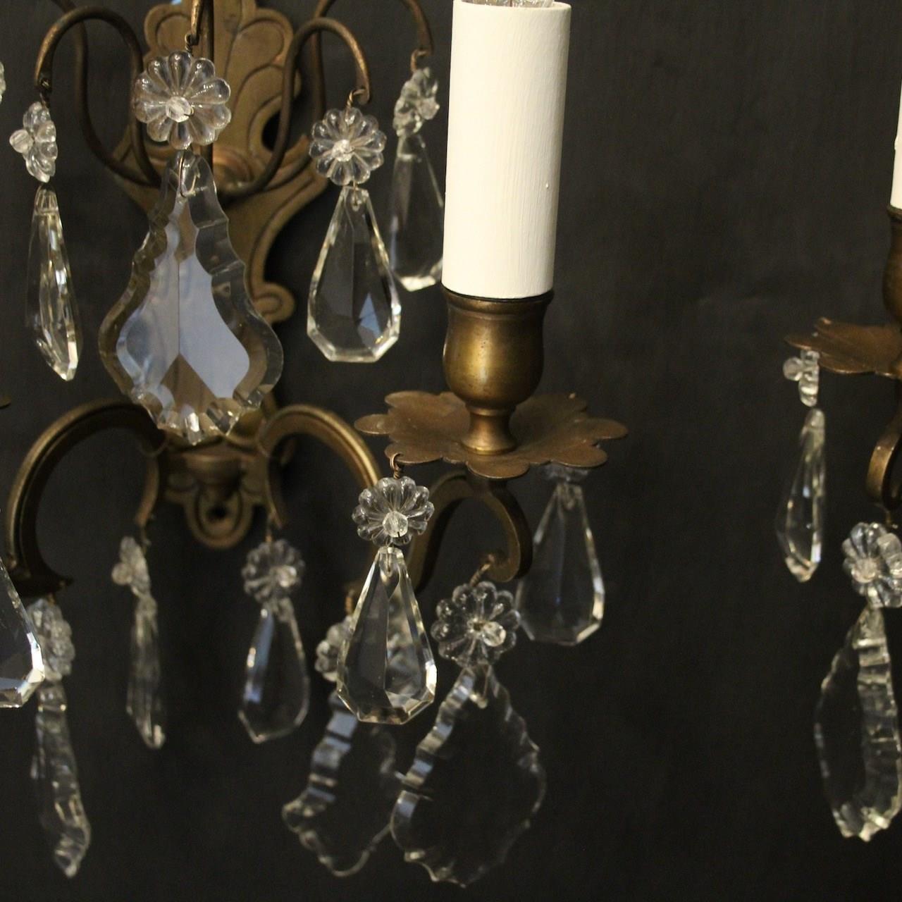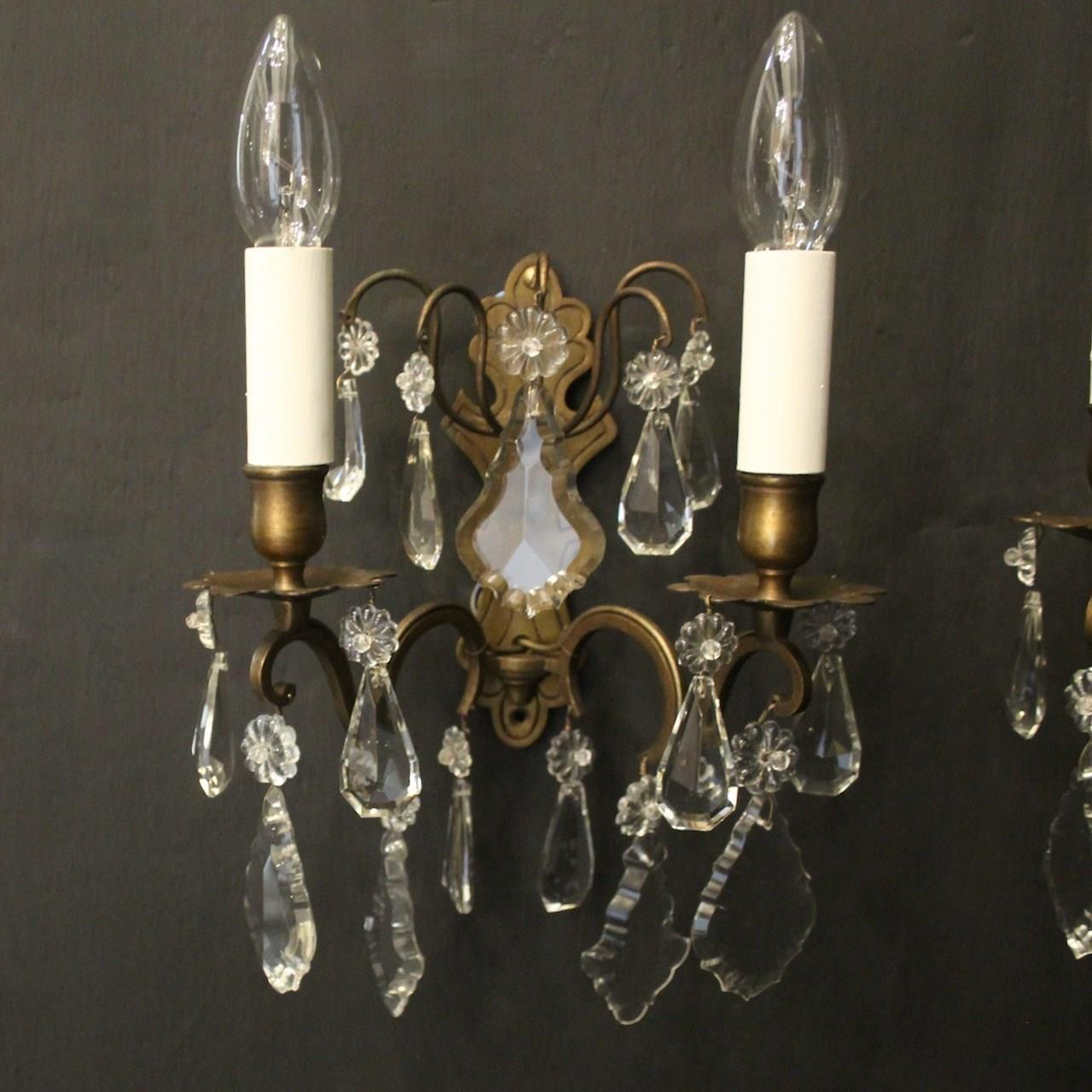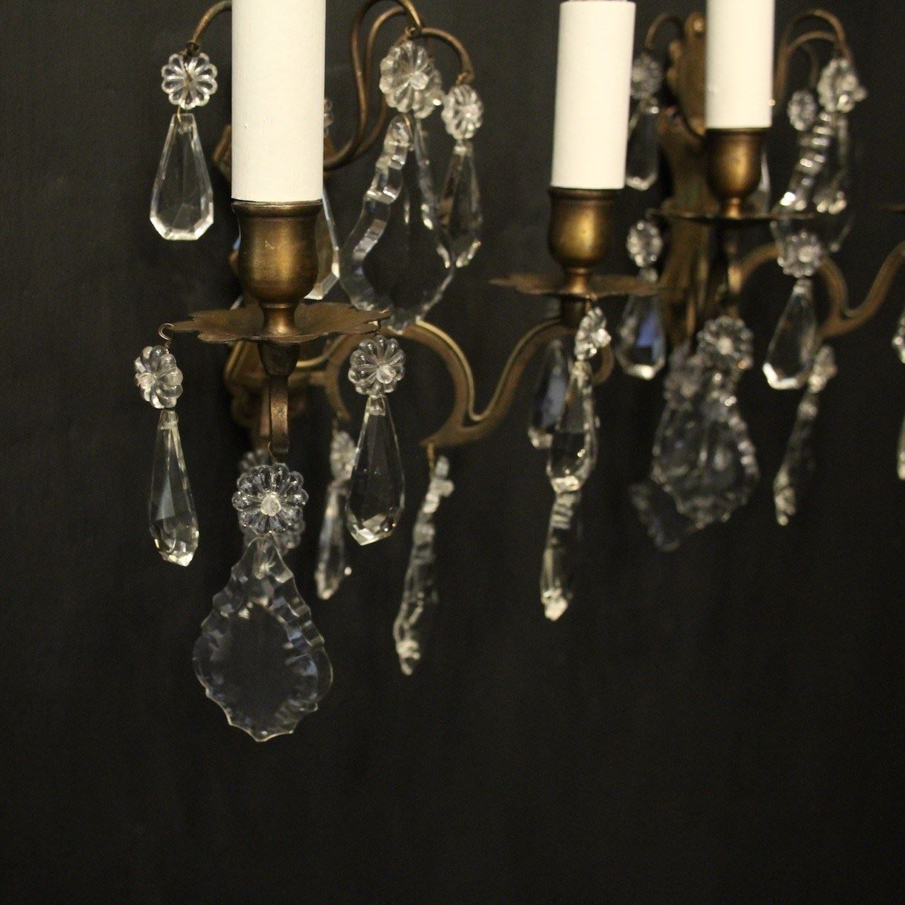 A French pair of faded brass and crystal twin arm antique wall lights, the square gauge scrolling arms with leaf bobeche drip pans and bulbous candle sconces, issuing from a leaf backplate with scrolling wirework canopy and decorated overall with French Slab crystal faceted pendants. Fully rewired and PAT tested. All our wall lights come with aged brass screws for fixing and spare bulbs.Dimensions: H: 13"/33cm W: 9"/23cm D: 6"/15cmCirca: Early 20th CenturyProduct Ref: OKA05539