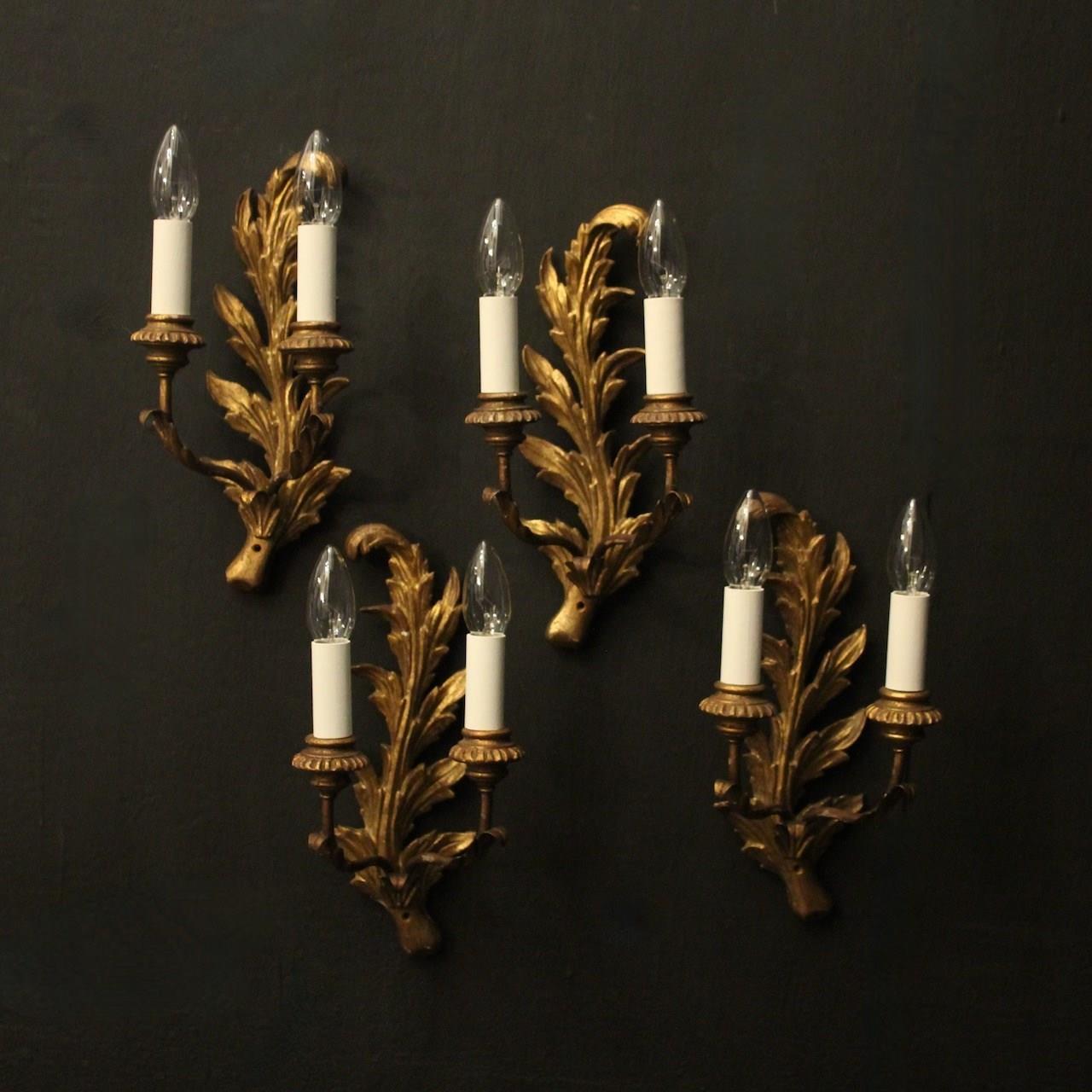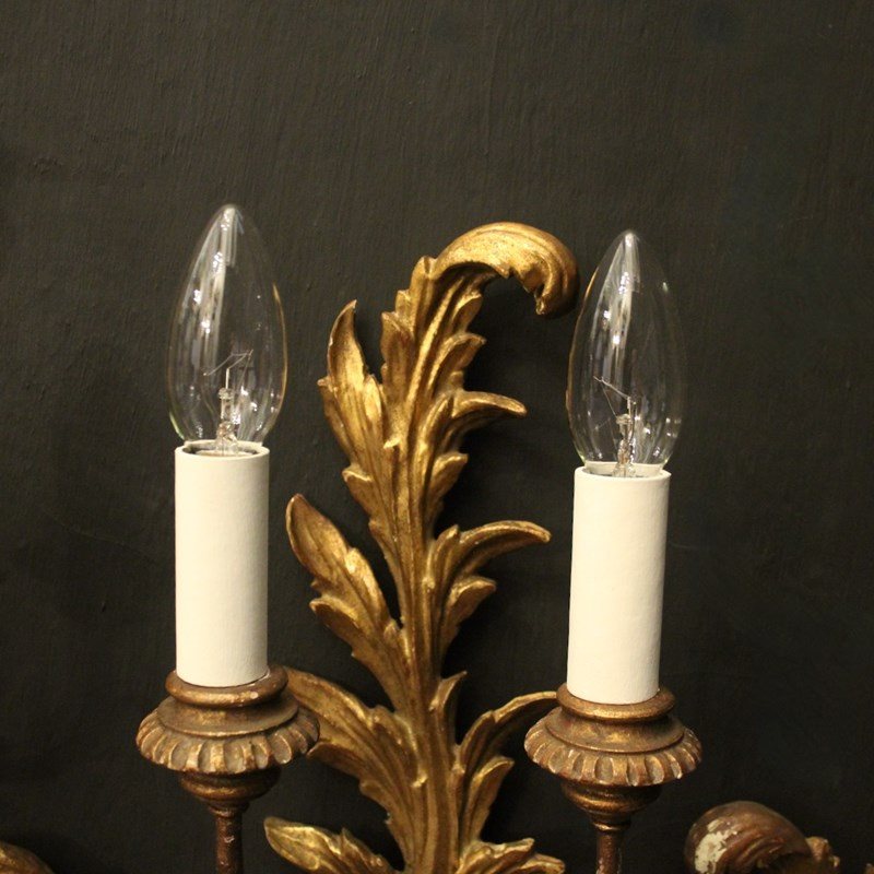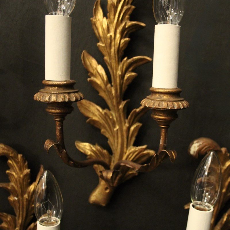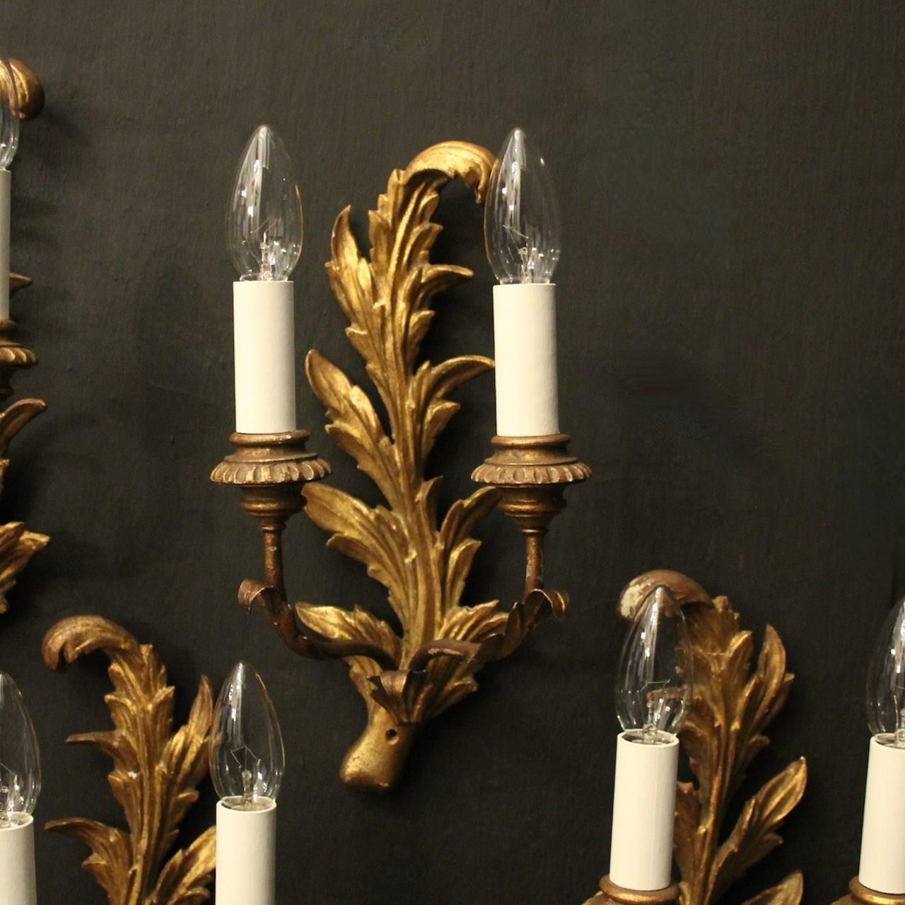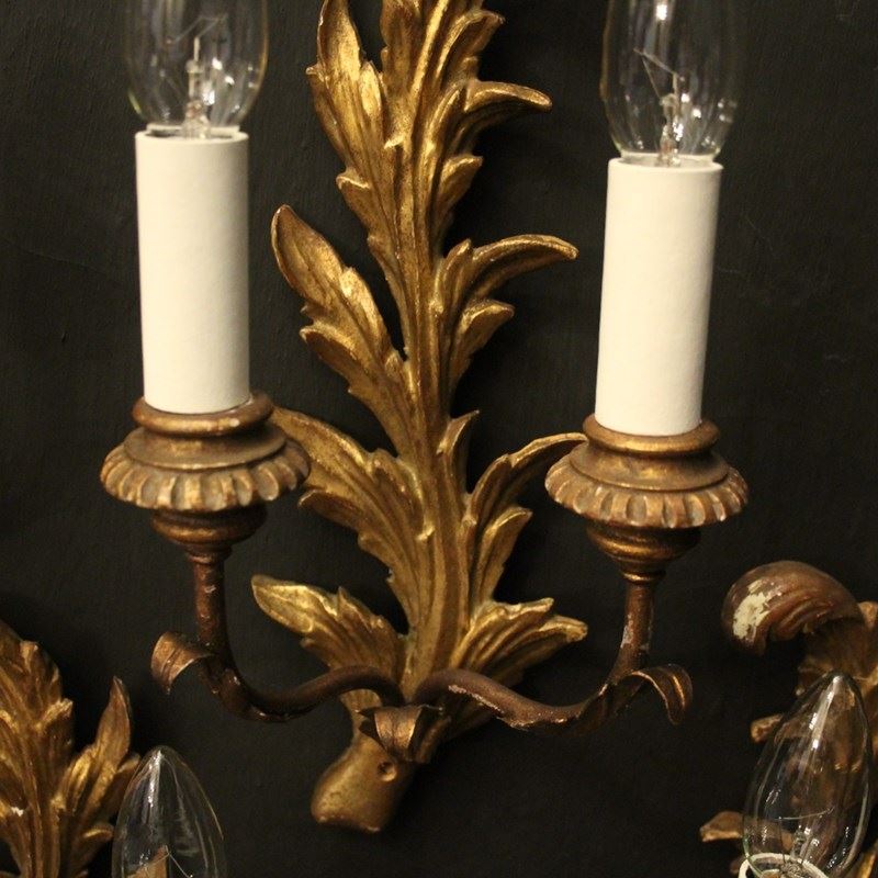 A decorative set of 4 French gilded giltwood twin arm antique wall lights, the toleware metal leaf scrolling arms with wooden bobeche drip pans, issuing from a carved opposing giltwood leaf backplate, lovely original patination. Fully rewired and PAT tested. All our wall lights come with aged brass screws for fixing and spare bulbs.