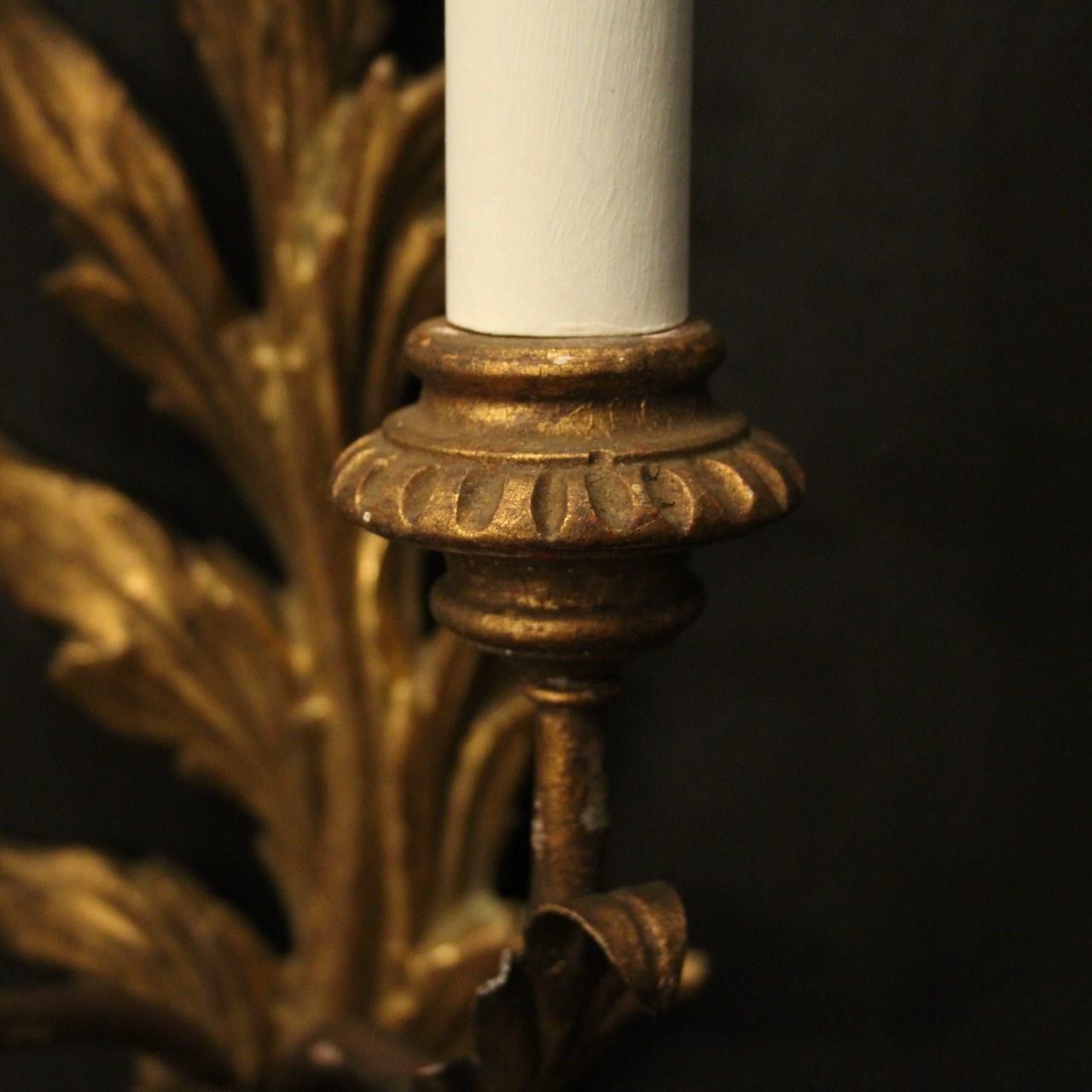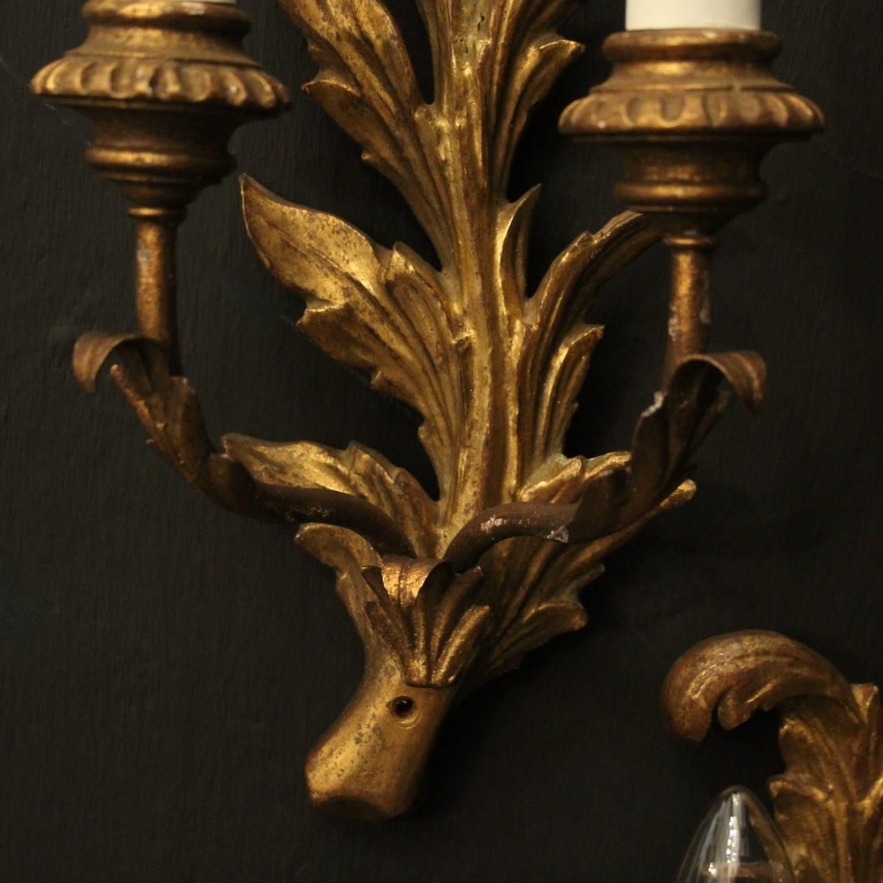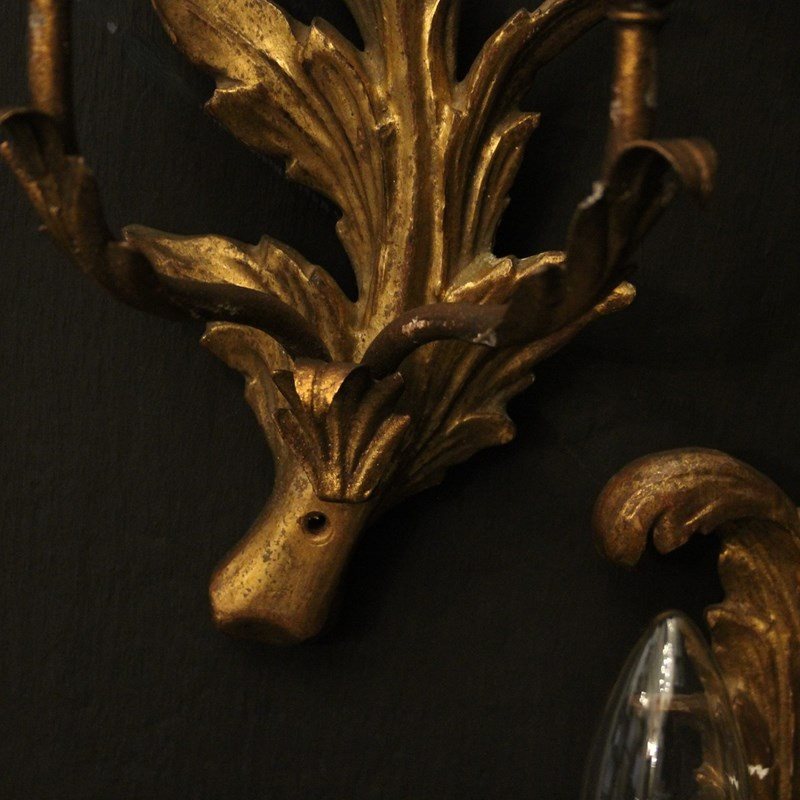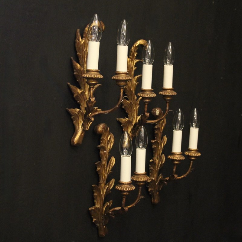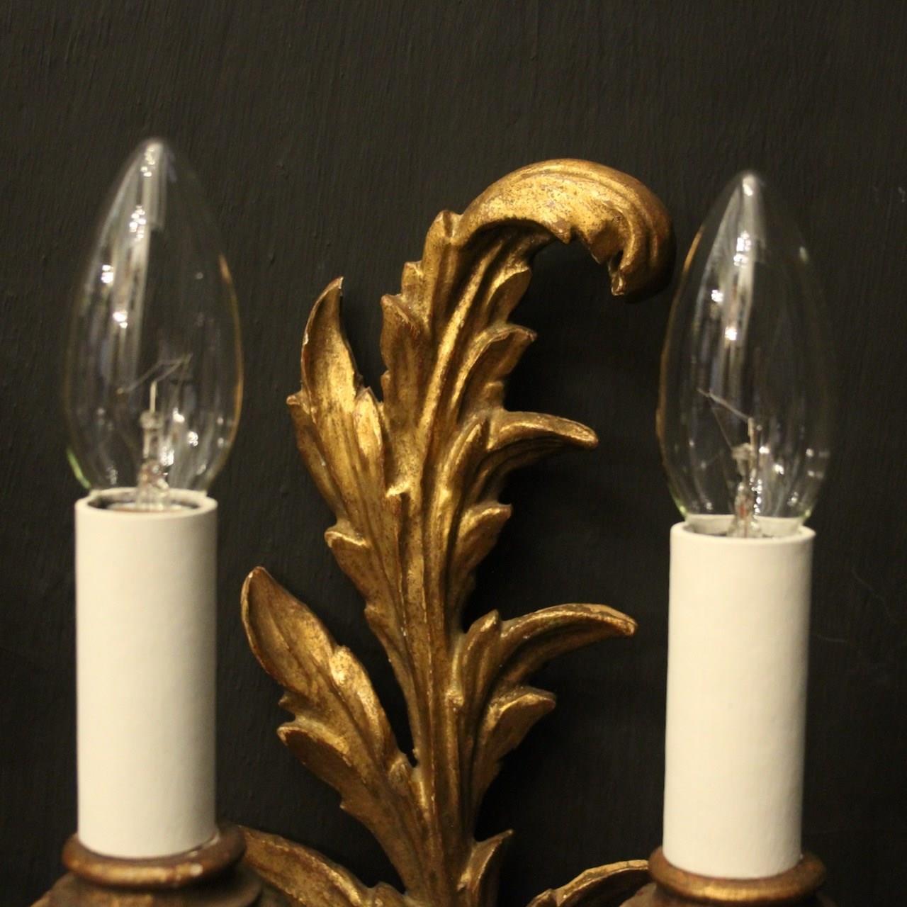 A decorative set of 4 French gilded giltwood twin arm antique wall lights, the toleware metal leaf scrolling arms with wooden bobeche drip pans, issuing from a carved opposing giltwood leaf backplate, lovely original patination. Fully rewired and PAT tested. All our wall lights come with aged brass screws for fixing and spare bulbs.
