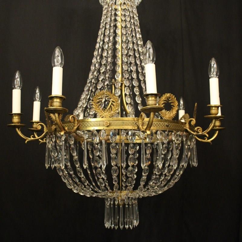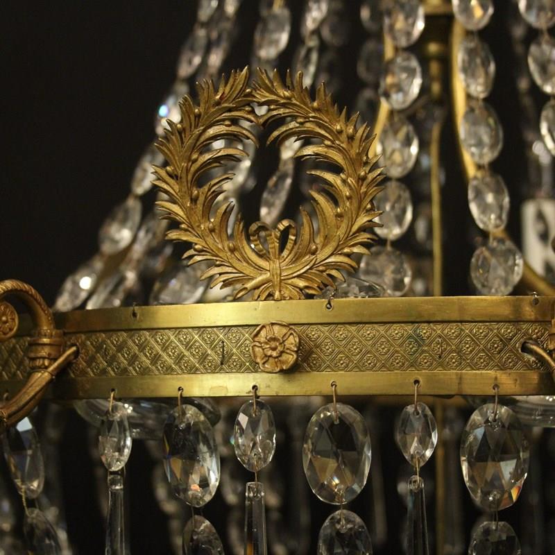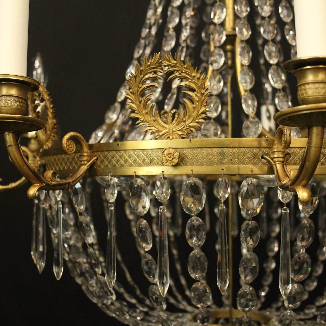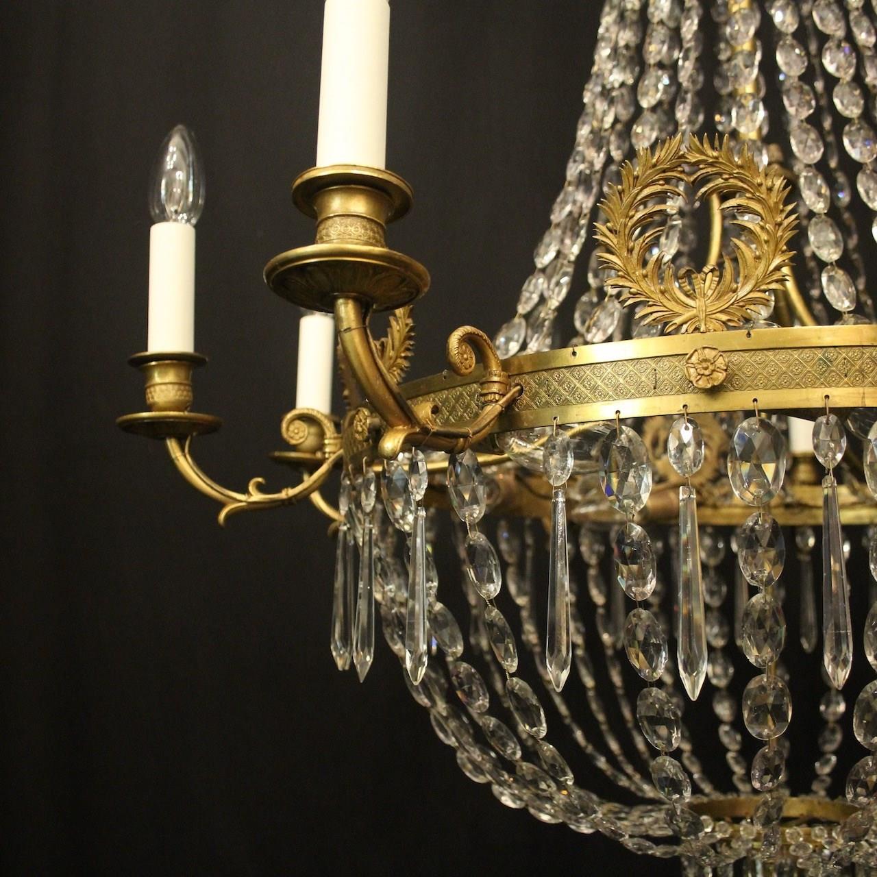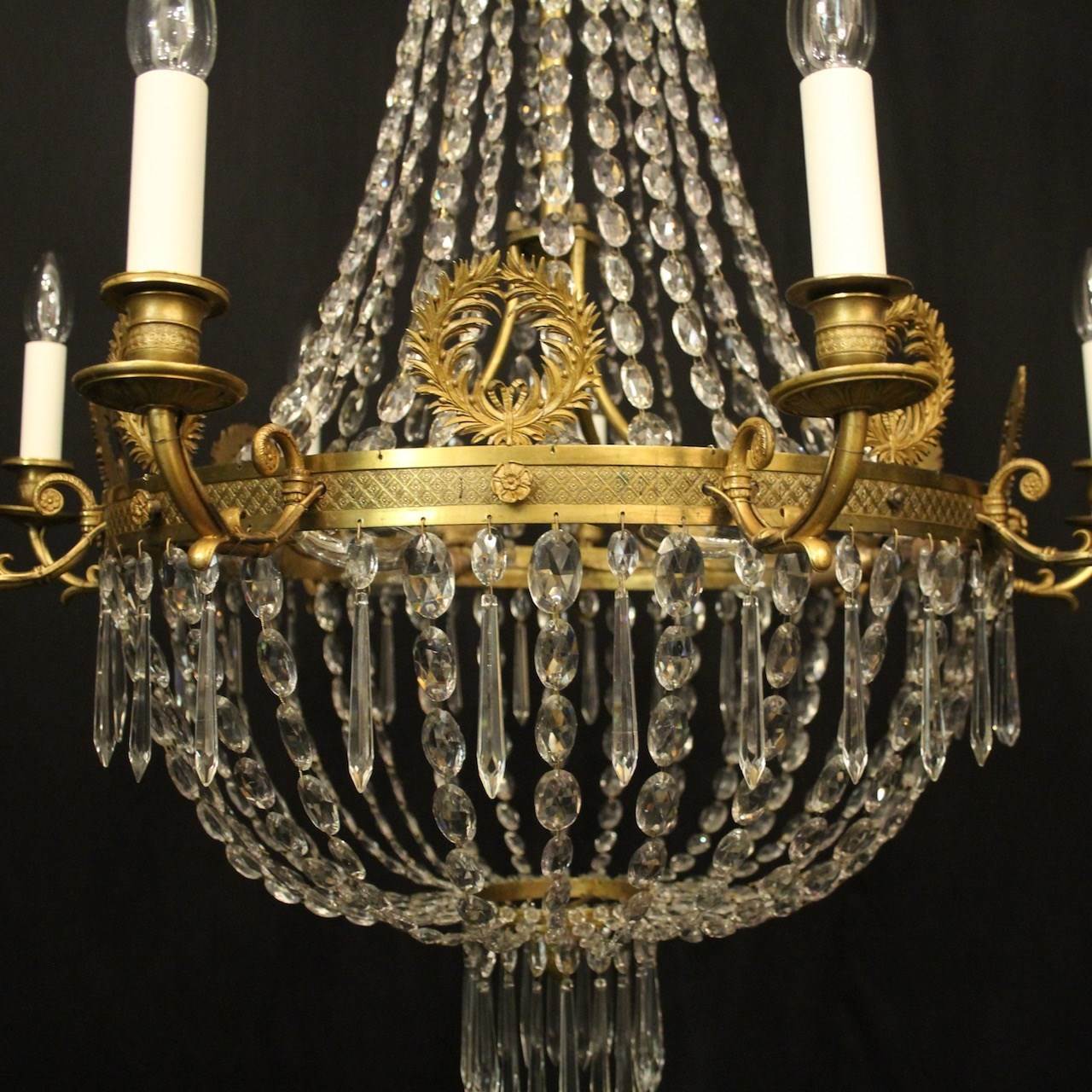 A French mid 19th Century gilded bronze and crystal 17 light tent & waterfall antique chandelier, the 8 light scrolling arms with circular bobeche drip pans and candle sconces, issuing from an imbricated leaf central band with ornate pierced laurel wreaths and pierced leaf canopy, having 6 internal light fittings around the central band and 3 more in the canopy, decorated overall with graduated oval crystal faceted pendants and having the original chain and ceiling rose, nice crisp patination and good elongated proportions. Original antique candle chandelier which we sympathetically converted to electricity. Fully rewired and PAT tested. All our chandeliers come with bulbs and ceiling fixings.