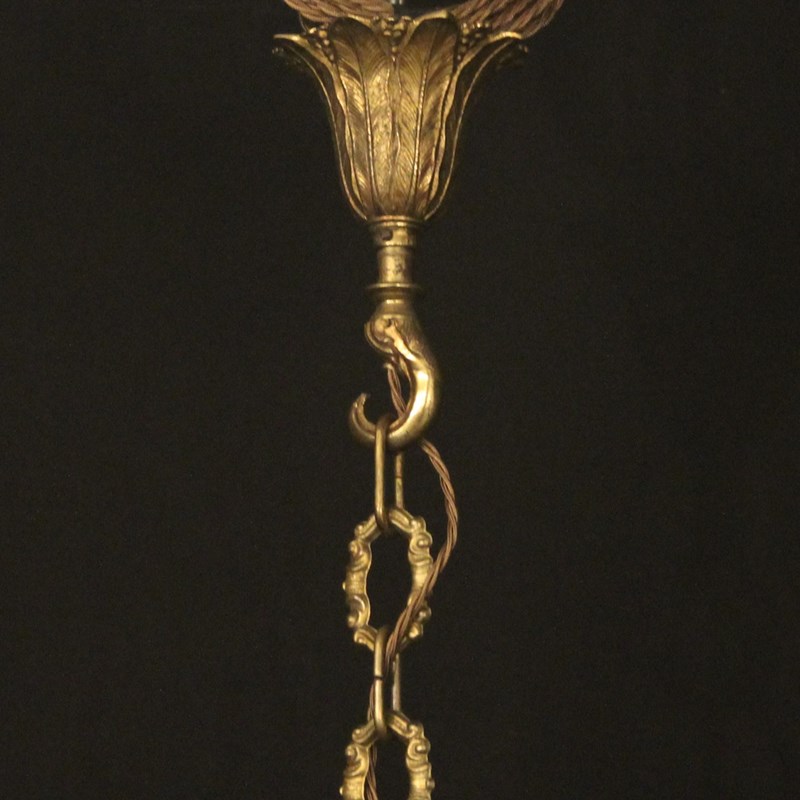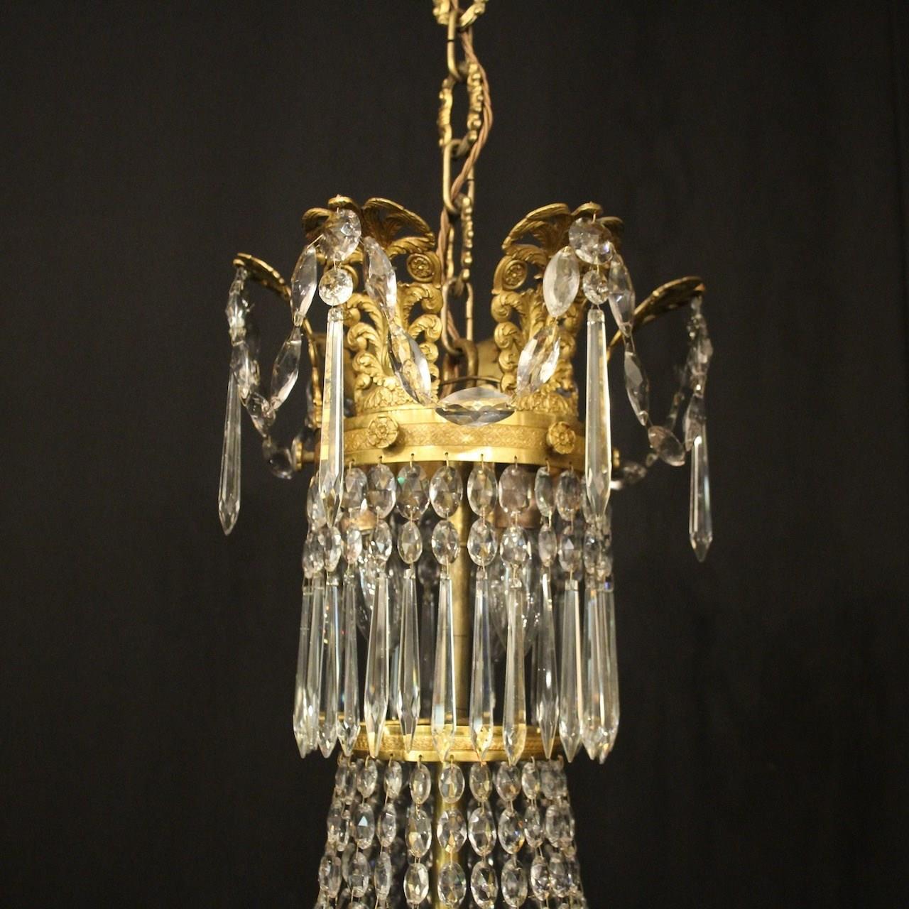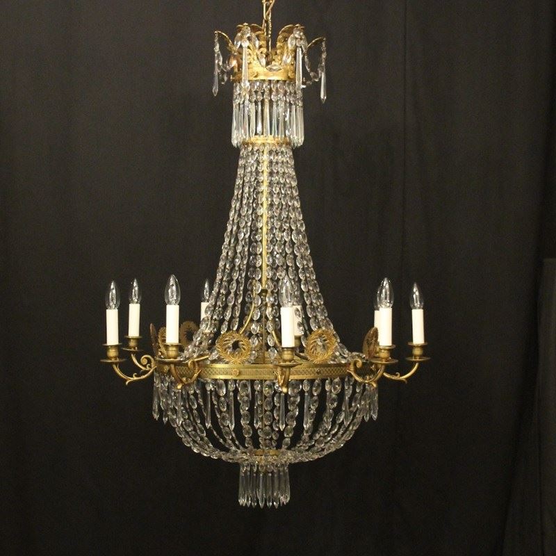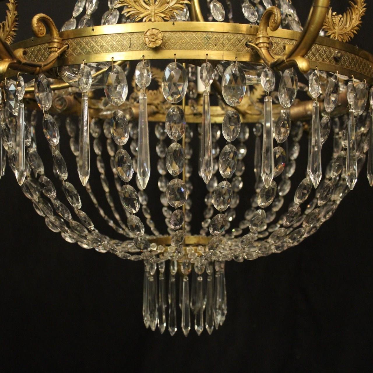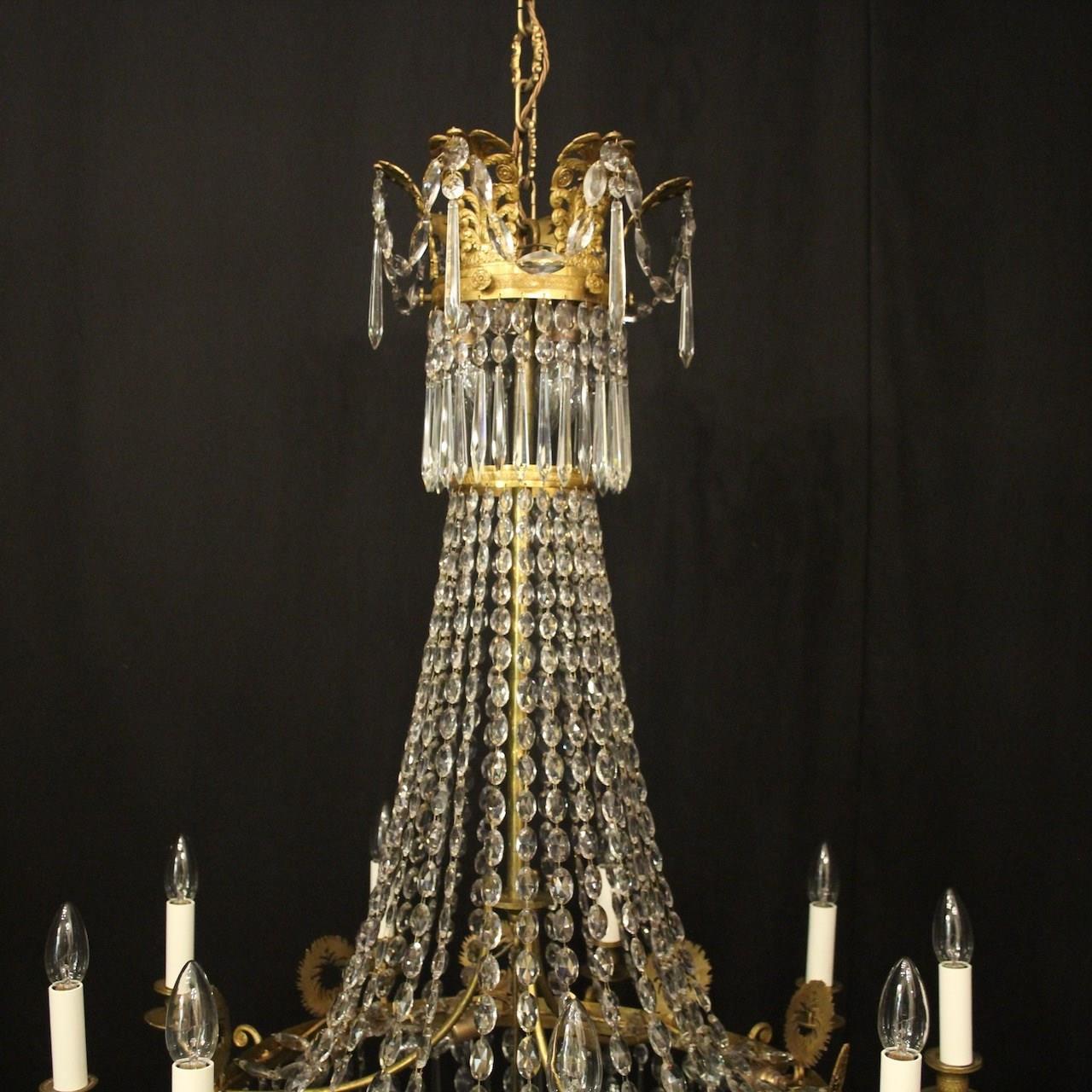 A French mid 19th Century gilded bronze and crystal 17 light tent & waterfall antique chandelier, the 8 light scrolling arms with circular bobeche drip pans and candle sconces, issuing from an imbricated leaf central band with ornate pierced laurel wreaths and pierced leaf canopy, having 6 internal light fittings around the central band and 3 more in the canopy, decorated overall with graduated oval crystal faceted pendants and having the original chain and ceiling rose, nice crisp patination and good elongated proportions. Original antique candle chandelier which we sympathetically converted to electricity. Fully rewired and PAT tested. All our chandeliers come with bulbs and ceiling fixings.