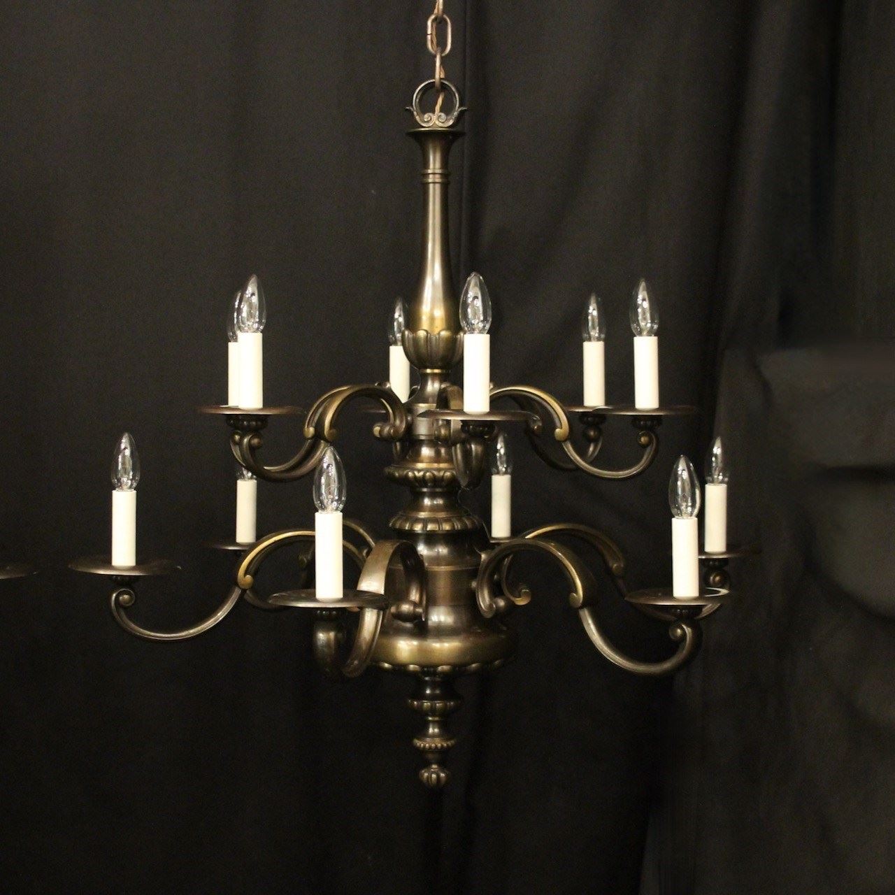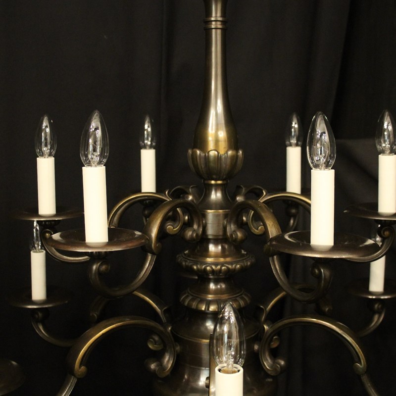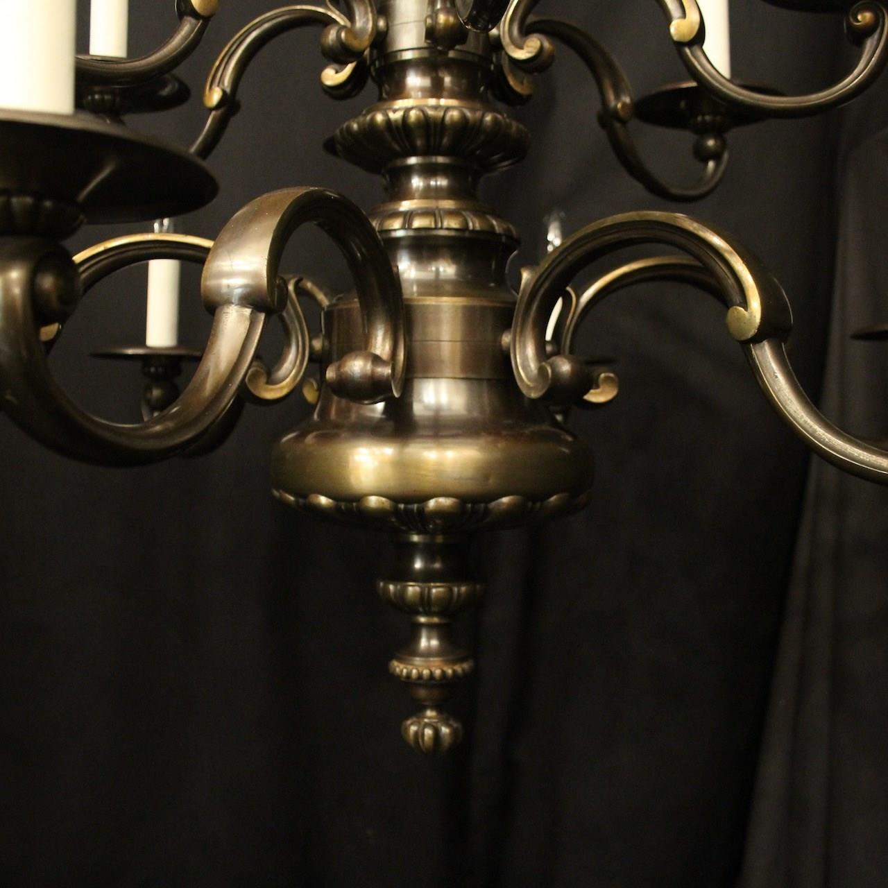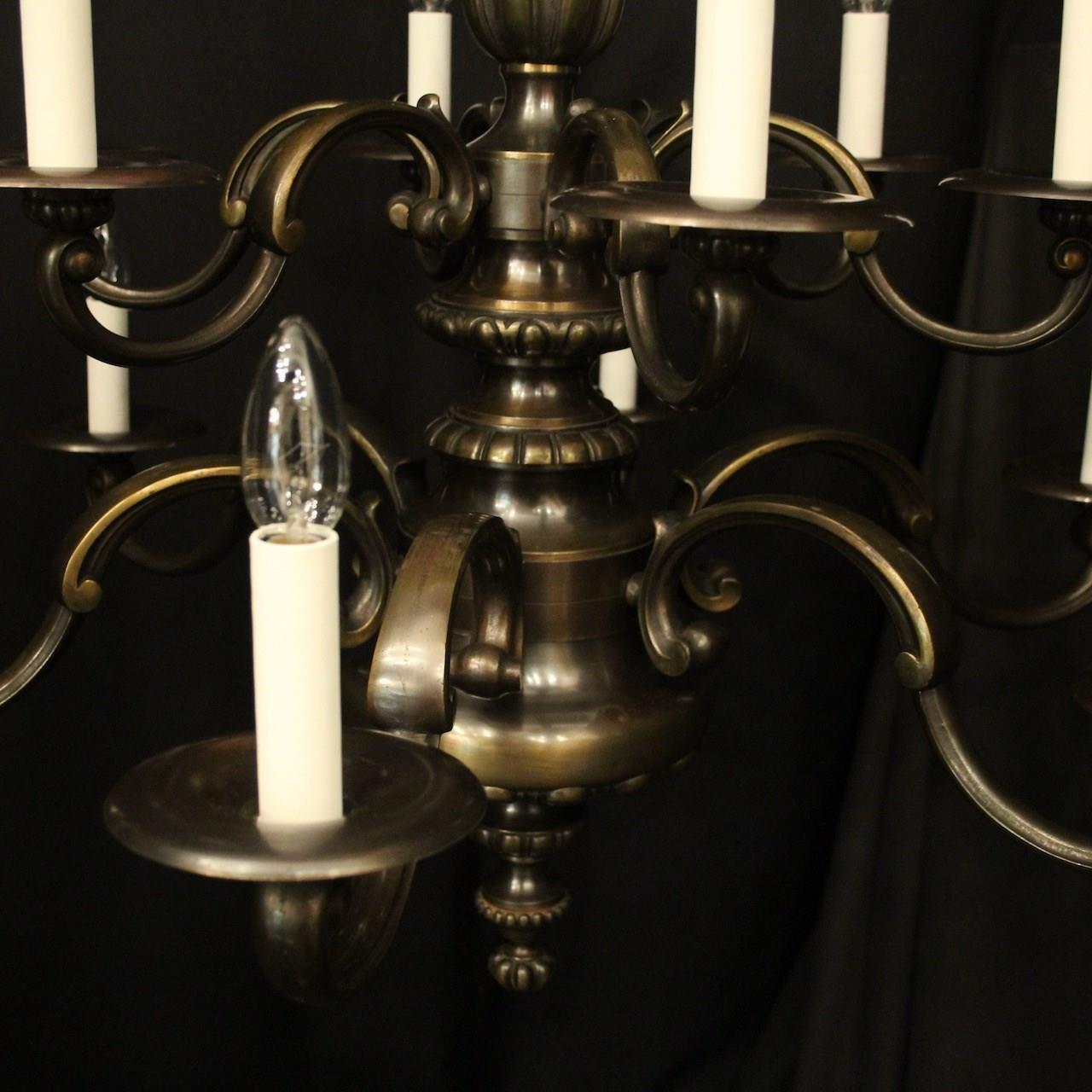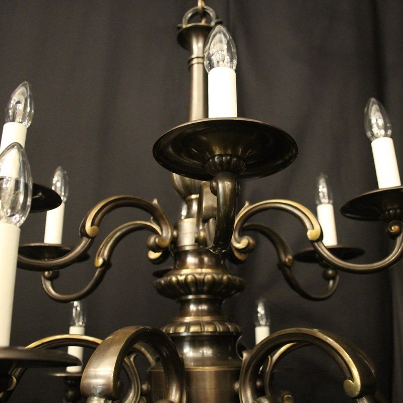 A large French pair of dark bronze 12 light double tiered antique chandeliers, the scrolling arms with large circular bobeche drip pans, issuing from a bulbous knopped central column with pierced ring finial and tapering reeded bulbous base, having the original chain and ceiling rose, lovely original faded gilded patination and great large scale. Fully rewired and PAT tested. All our chandeliers come with bulbs and ceiling fixings.