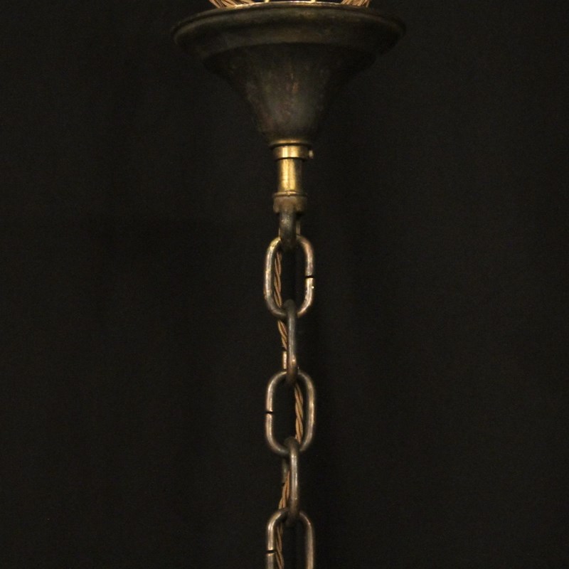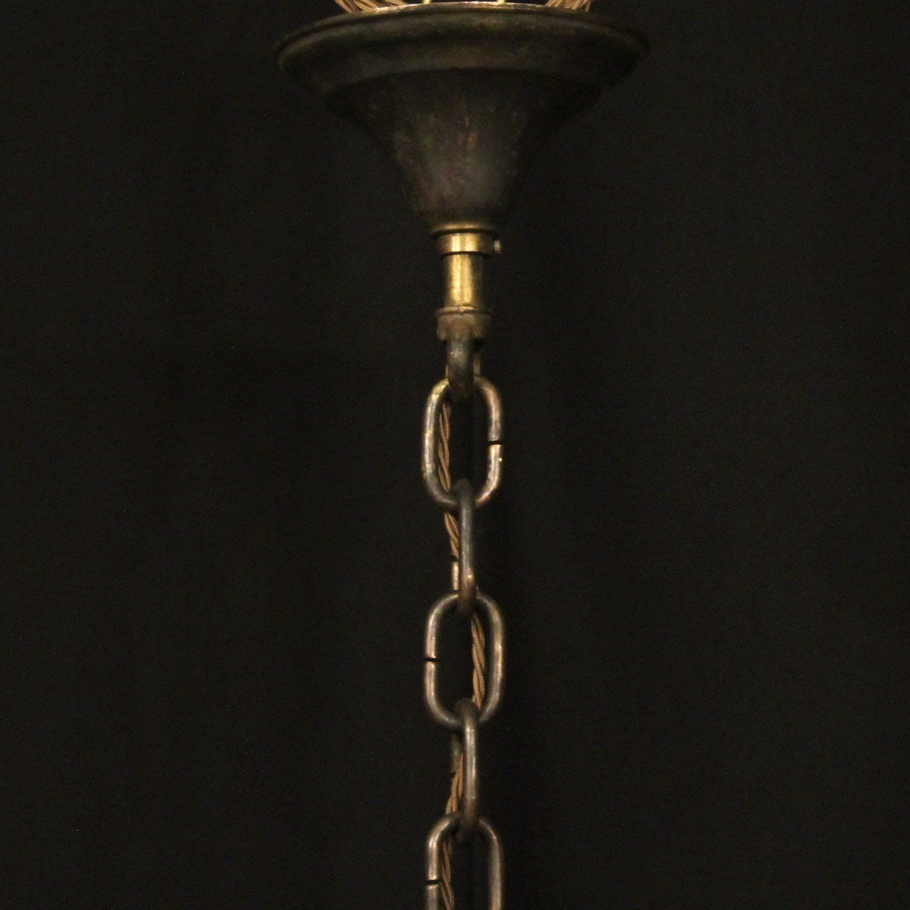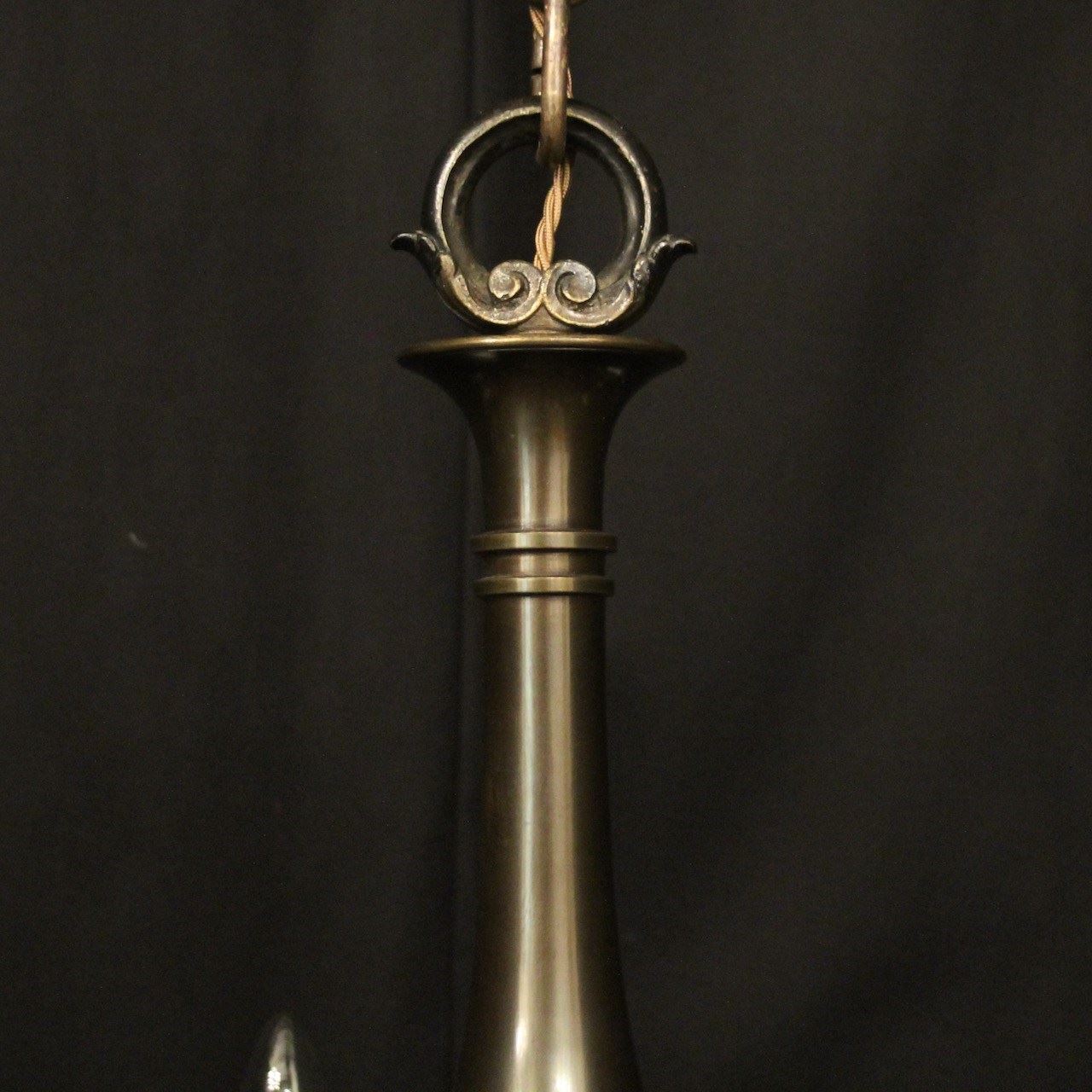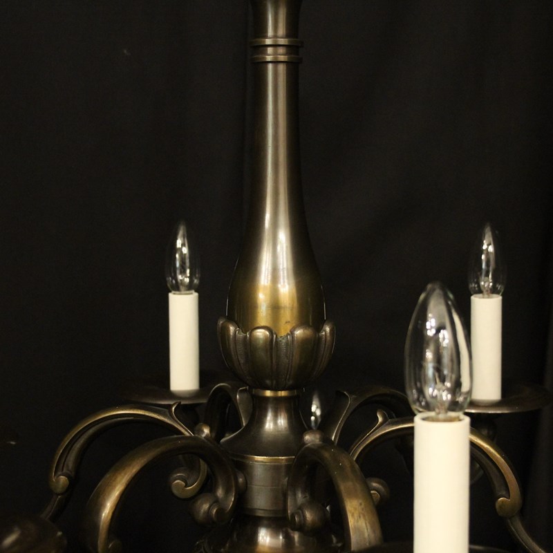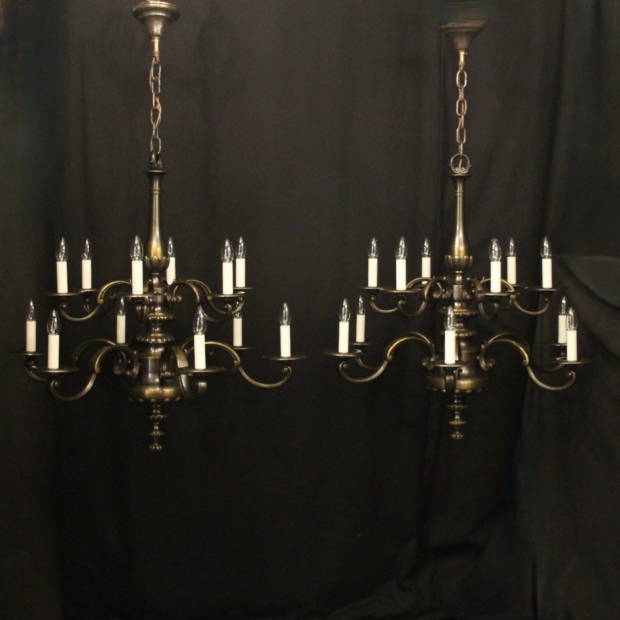 A large French pair of dark bronze 12 light double tiered antique chandeliers, the scrolling arms with large circular bobeche drip pans, issuing from a bulbous knopped central column with pierced ring finial and tapering reeded bulbous base, having the original chain and ceiling rose, lovely original faded gilded patination and great large scale. Fully rewired and PAT tested. All our chandeliers come with bulbs and ceiling fixings.