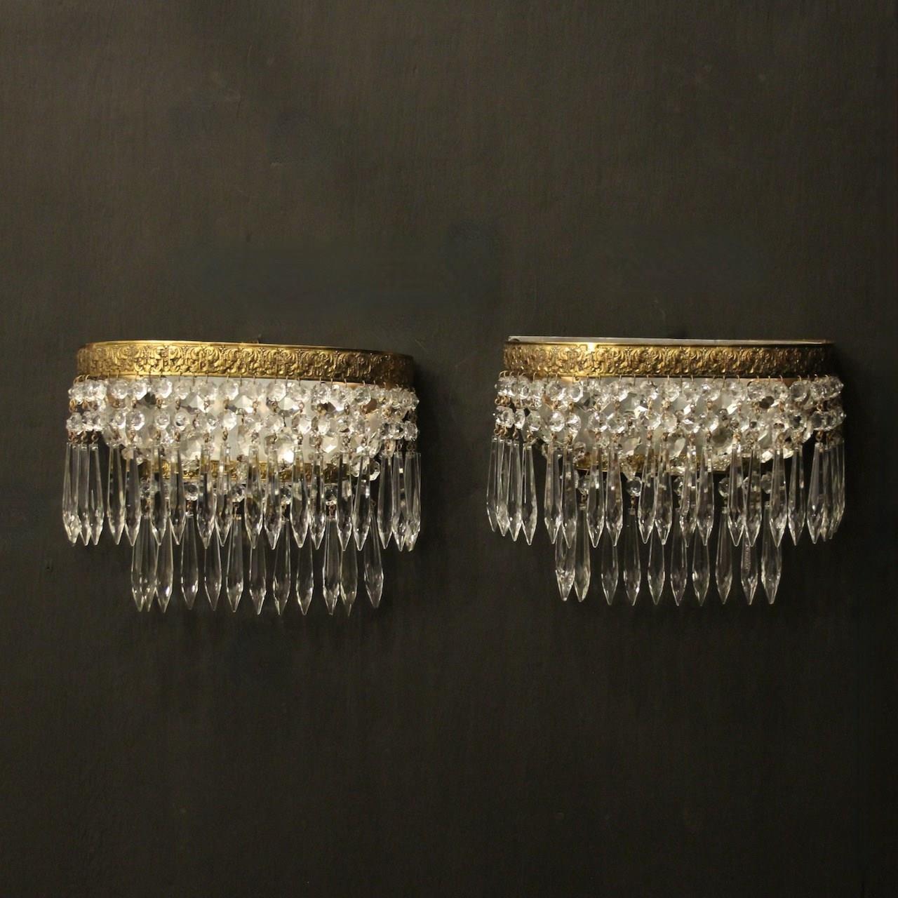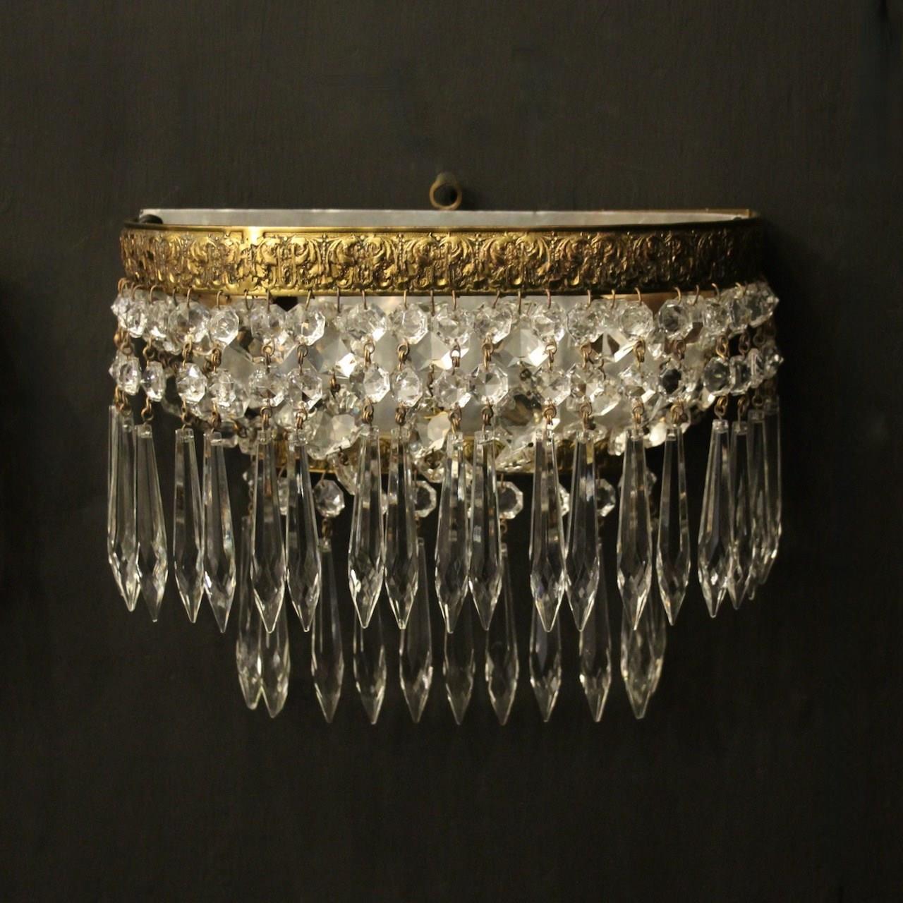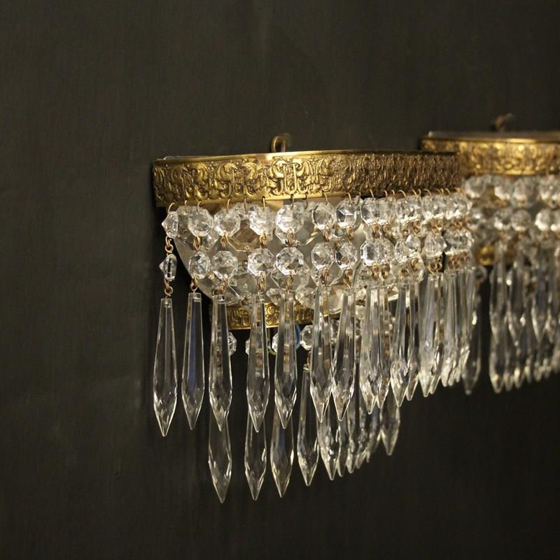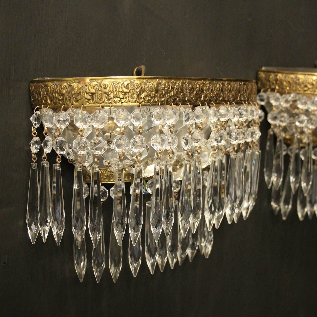 A pretty French pair of gilded brass and crystal twin bulb antique wall lights, the two internal light fittings, issuing from a foliated gilded brass band and reflective backplate, decorated with icicle crystal faceted pendants, nice original patination. Fully rewired and PAT tested. All our wall lights come with aged brass screws for fixing and spare bulbs.