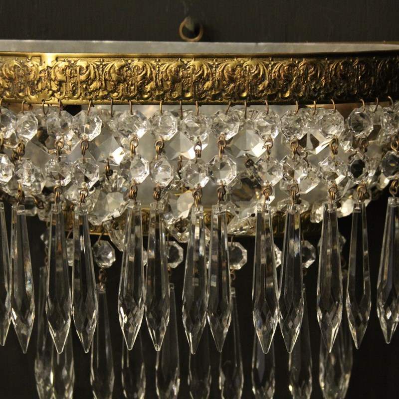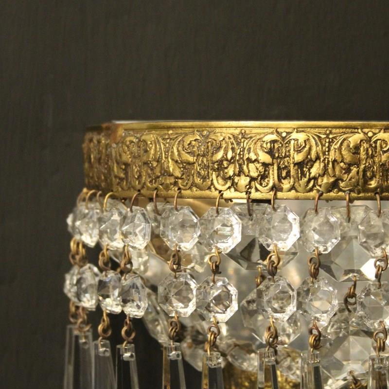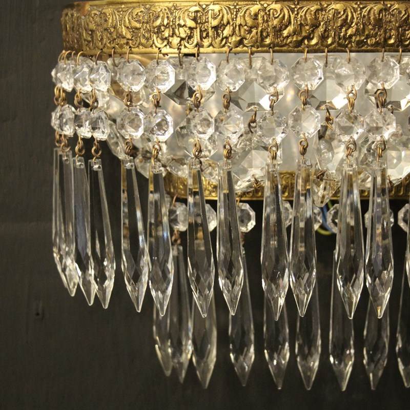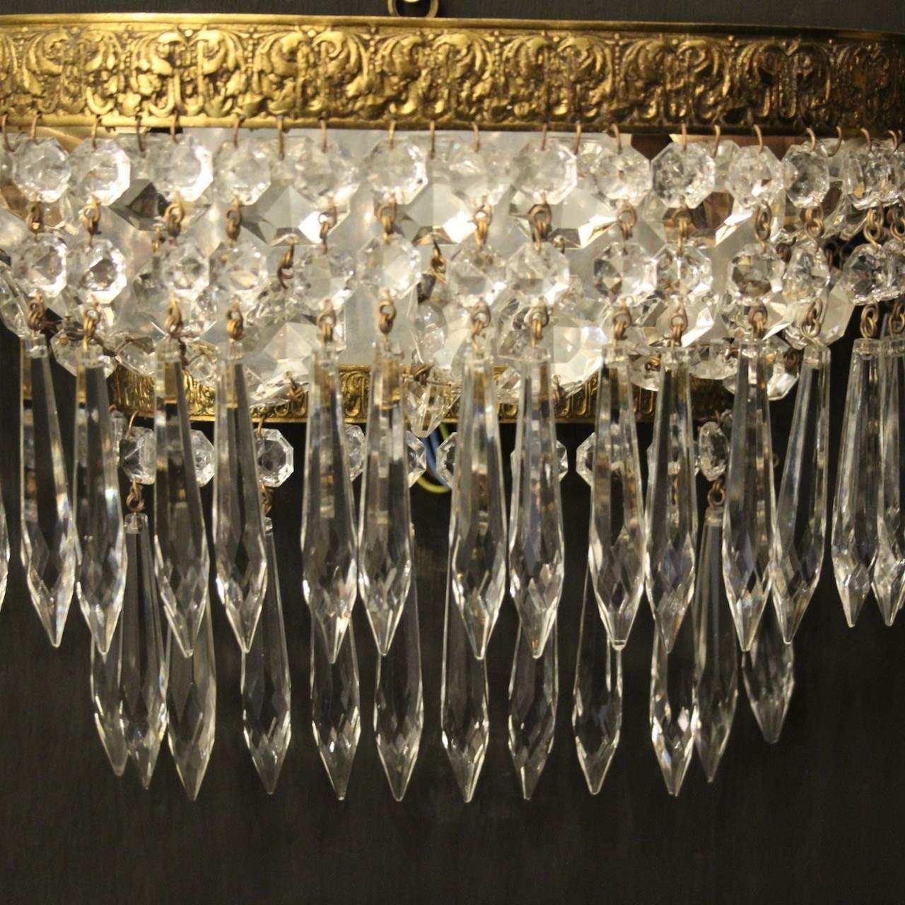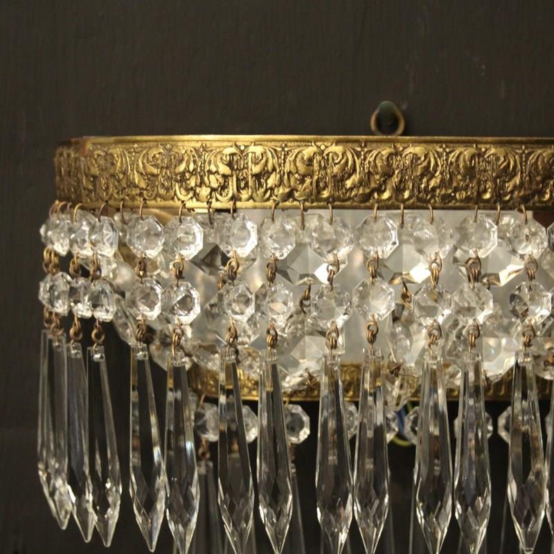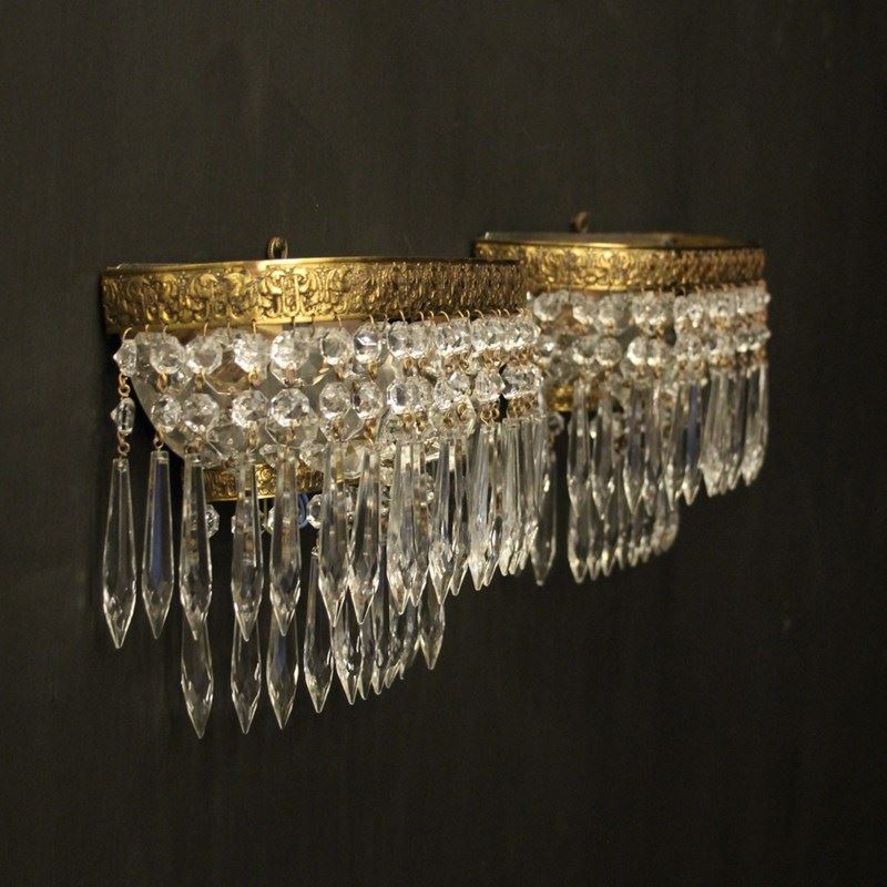 A pretty French pair of gilded brass and crystal twin bulb antique wall lights, the two internal light fittings, issuing from a foliated gilded brass band and reflective backplate, decorated with icicle crystal faceted pendants, nice original patination. Fully rewired and PAT tested. All our wall lights come with aged brass screws for fixing and spare bulbs.