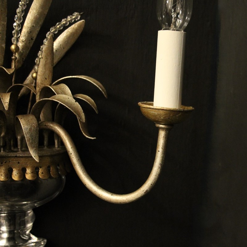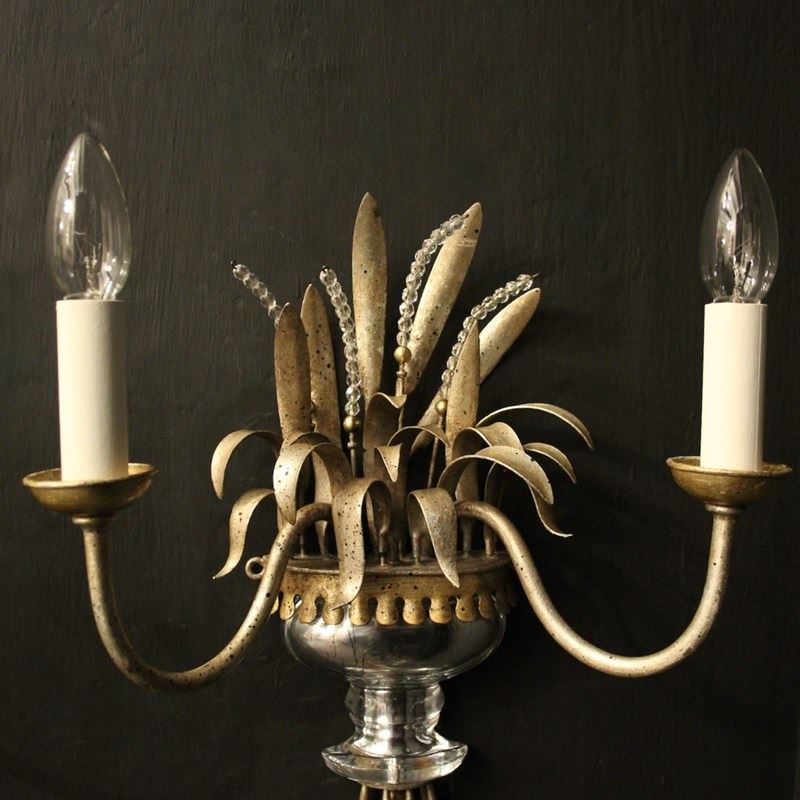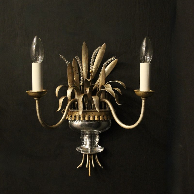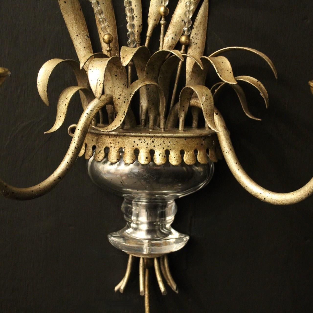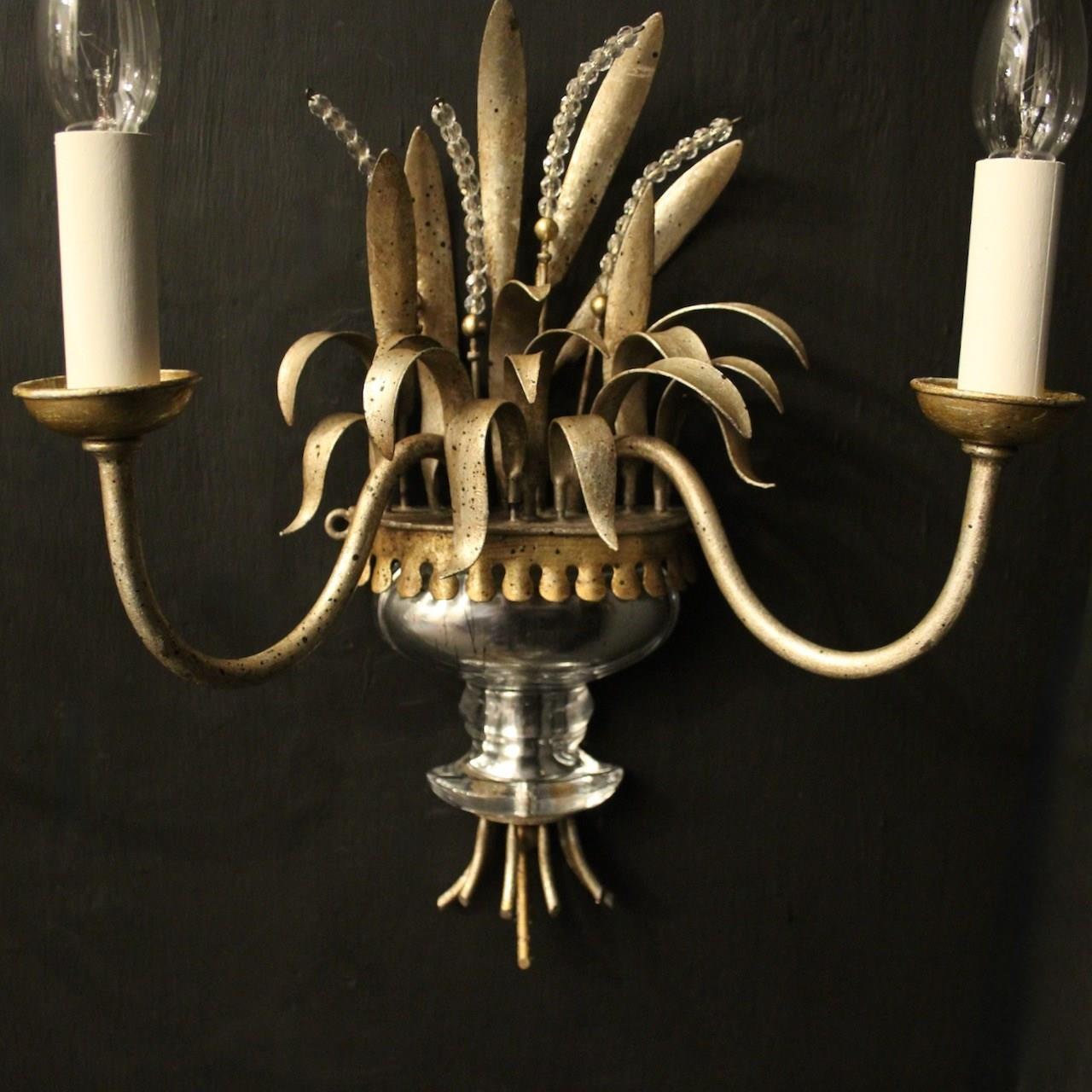A French pair of twin light wall sconces attributed to Maison Baguès, circa 1960s. the toleware scrolling arms with circular cup bobeche drip pans, issuing from a wheatsheaf backplate with beaded crystals and mercury gilded crystal urn base. Lovely original soft silver gilded patination and a rare find. Fully rewired and PAT tested. All our wall lights come with aged brass screws or brackets for fixing and spare bulbs.