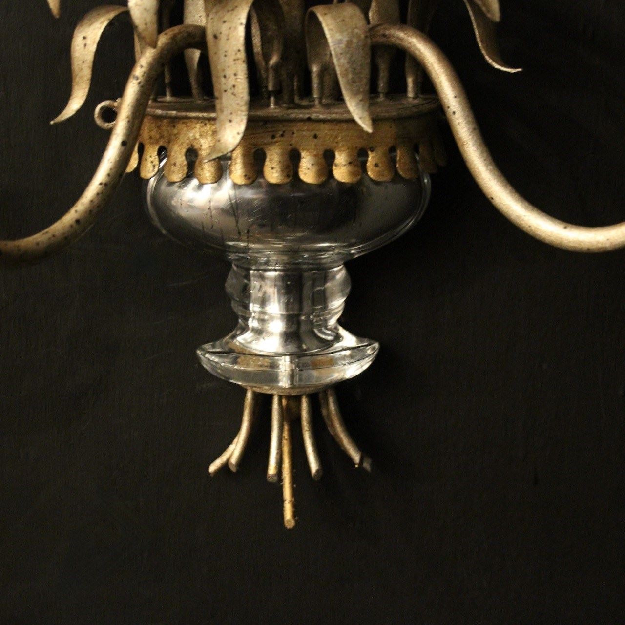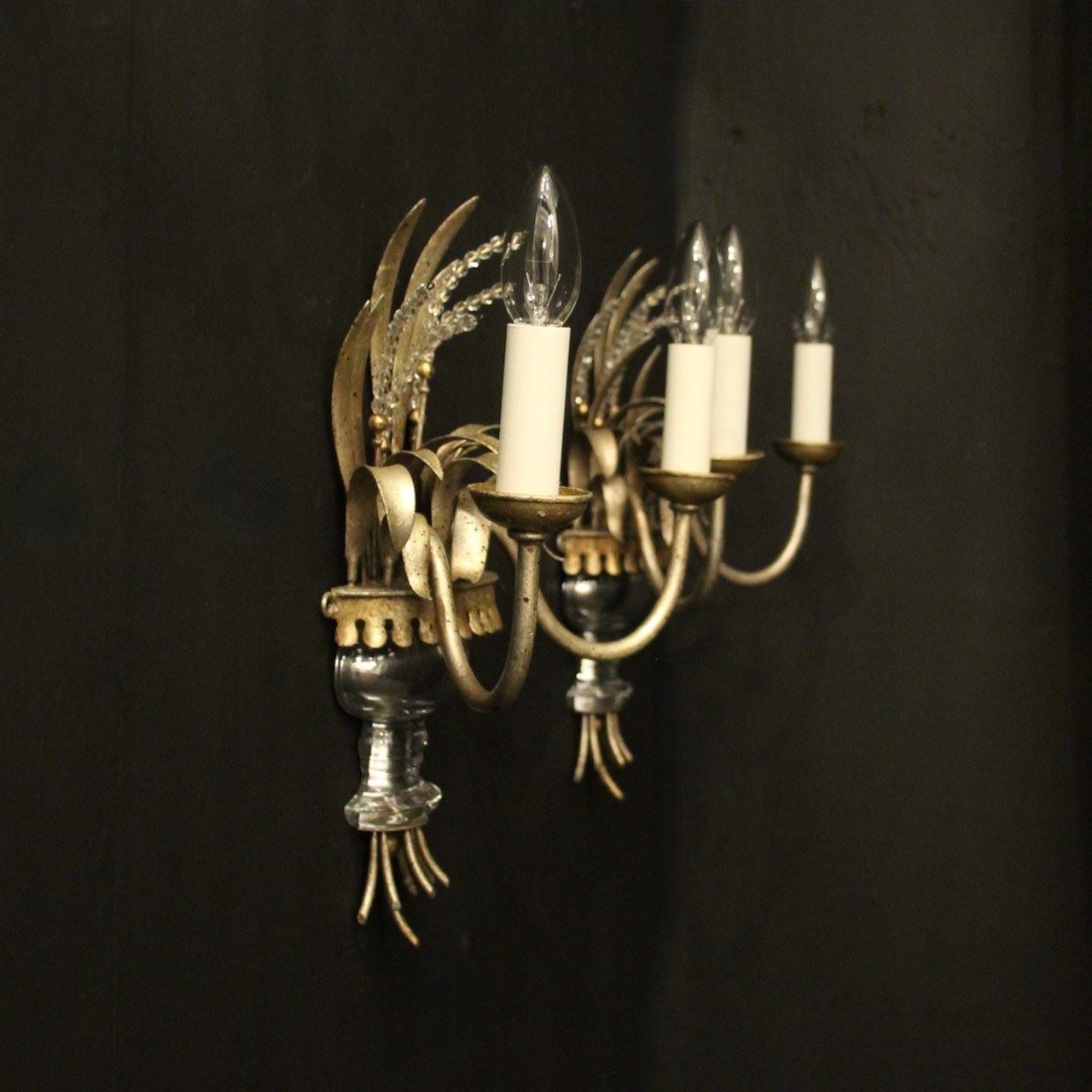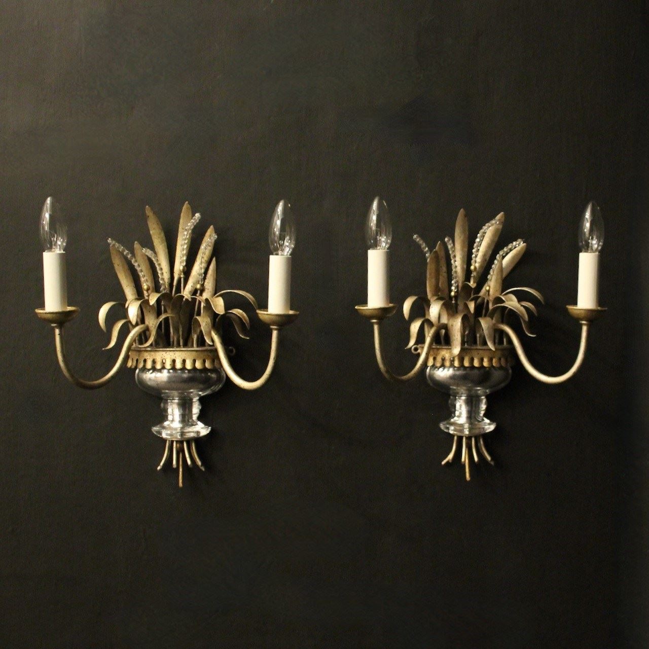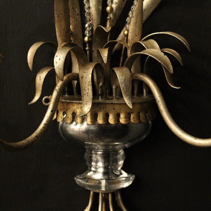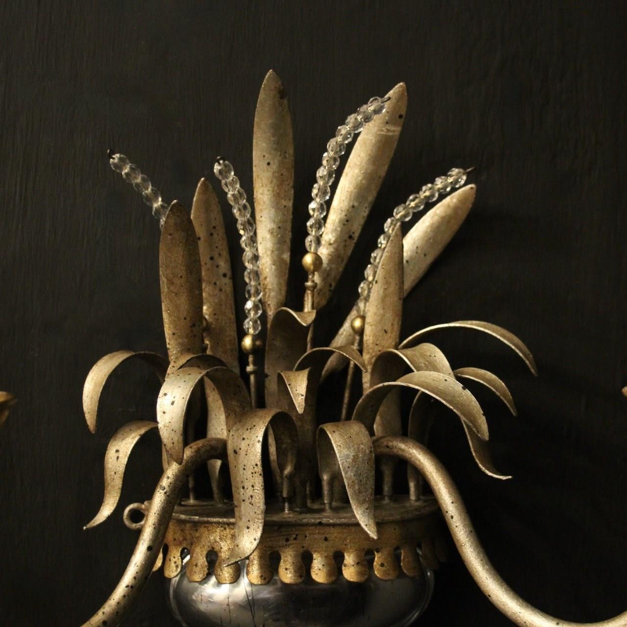 A French pair of twin light wall sconces attributed to Maison Baguès, circa 1960s. the toleware scrolling arms with circular cup bobeche drip pans, issuing from a wheatsheaf backplate with beaded crystals and mercury gilded crystal urn base. Lovely original soft silver gilded patination and a rare find. Fully rewired and PAT tested. All our wall lights come with aged brass screws or brackets for fixing and spare bulbs.