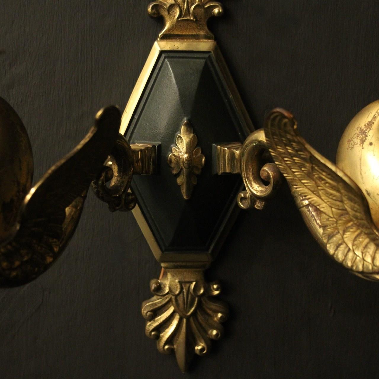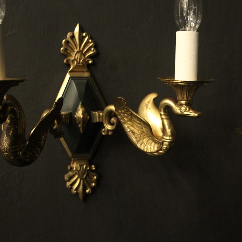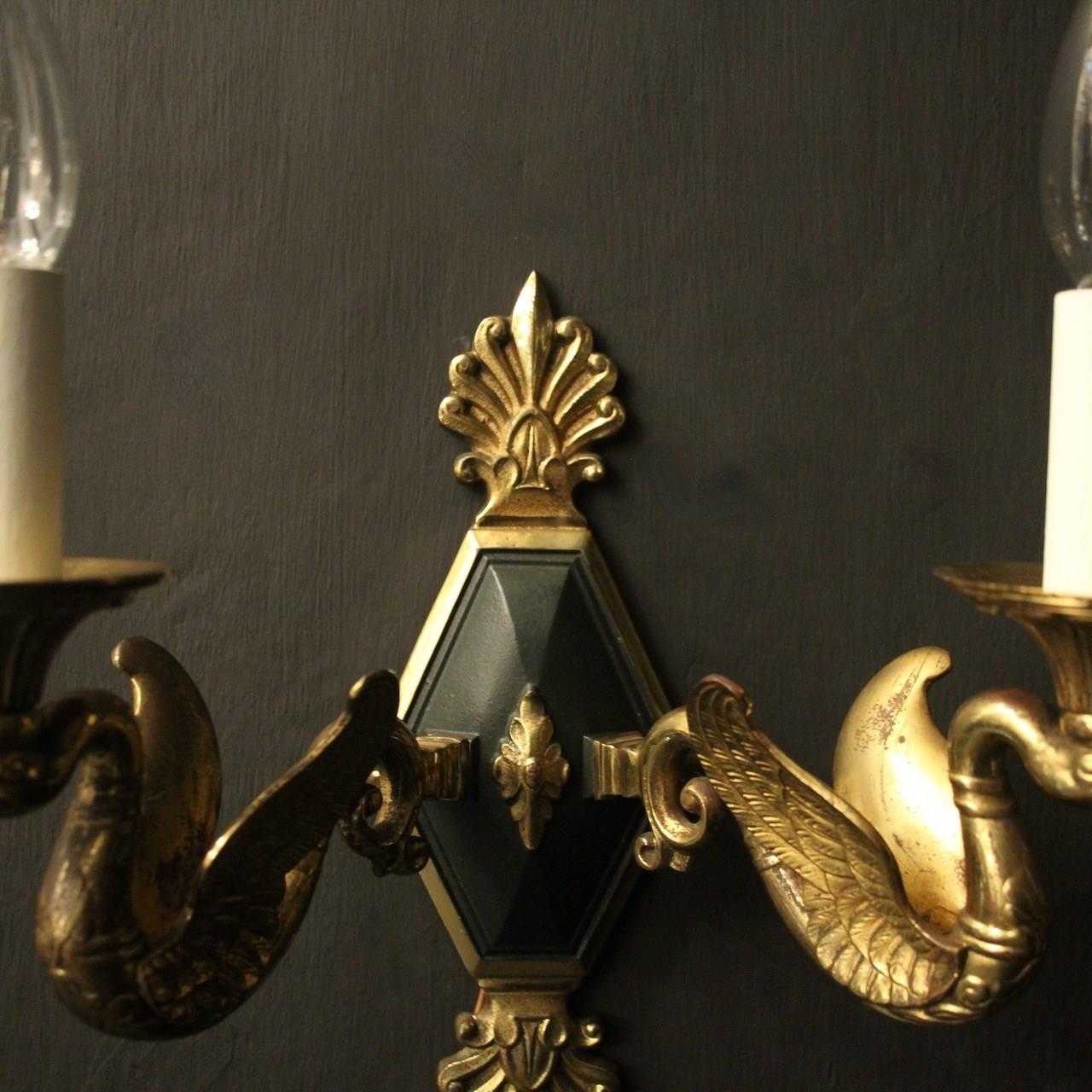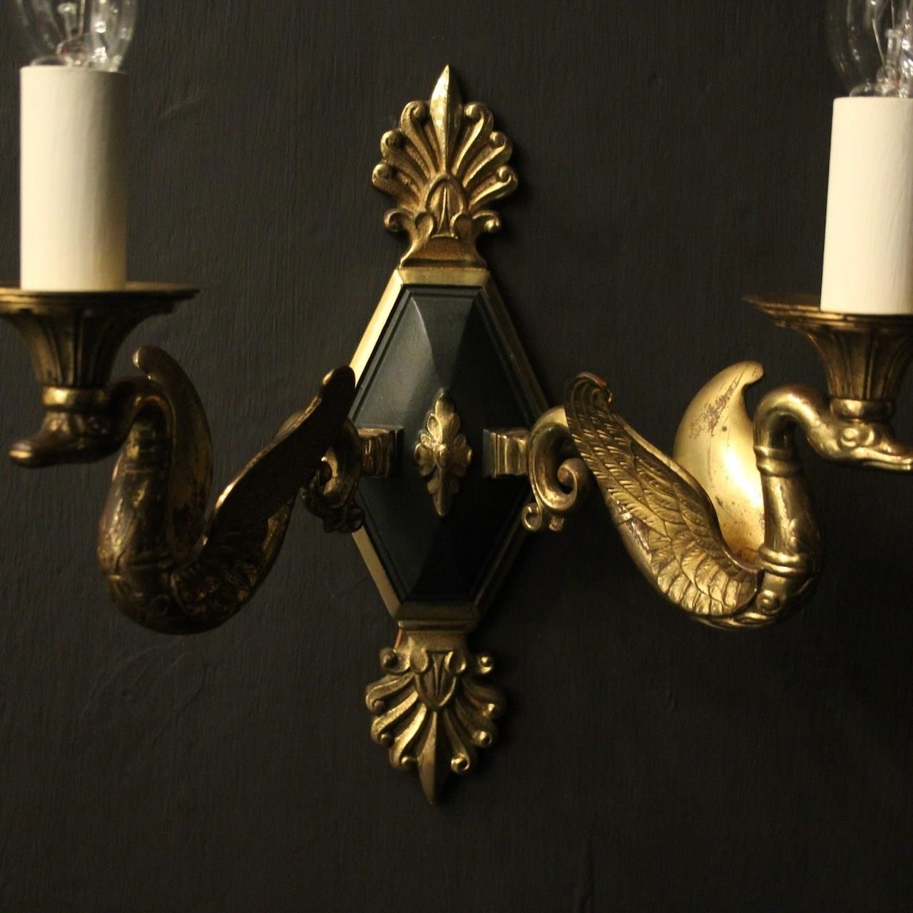 A French pair of Empire gilded bronze twin arm antique wall lights, the ornate winged swan headed scrolling arms with trumpet scalloped bobeche drip pans, issuing from a central decorative lozenge black enamelled backplate with Anthemion finial and terminal, nice original patination and well cast. Fully rewired and PAT tested. All our wall lights come with aged brass screws for fixing and spare bulbs.