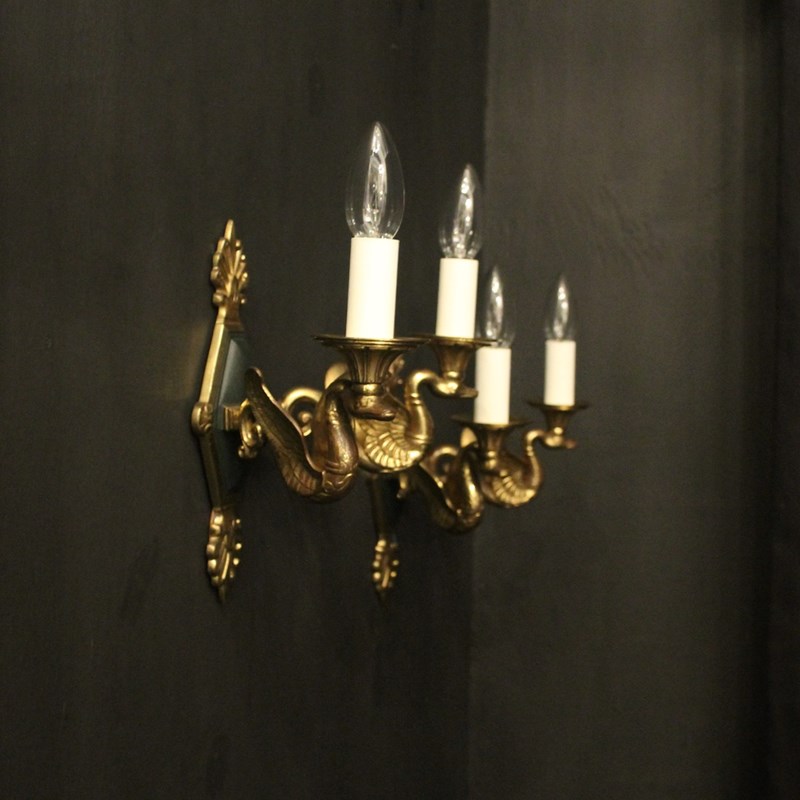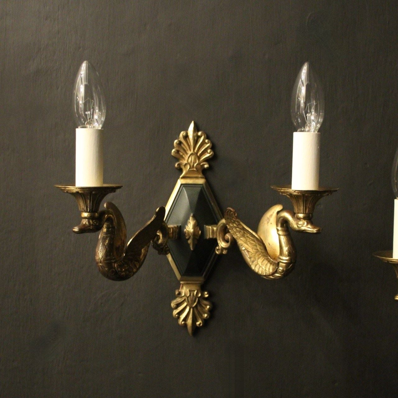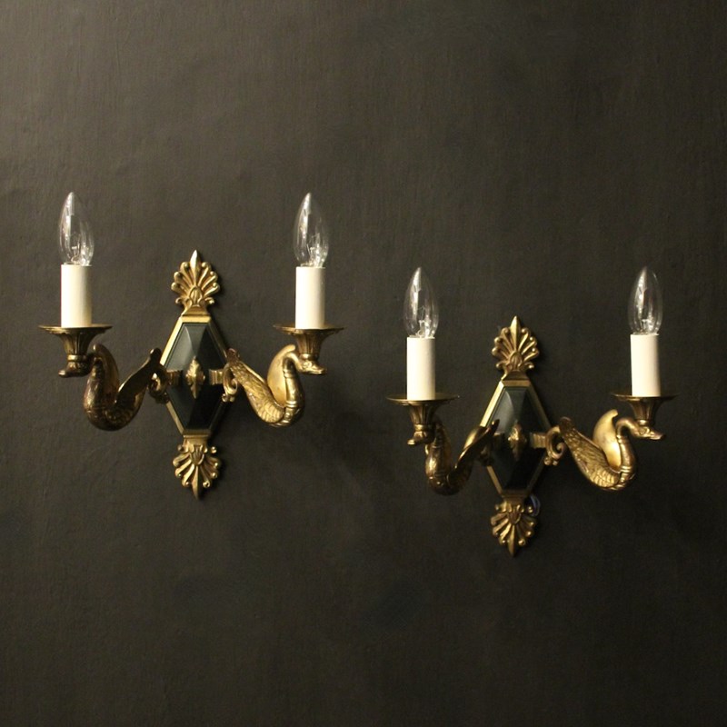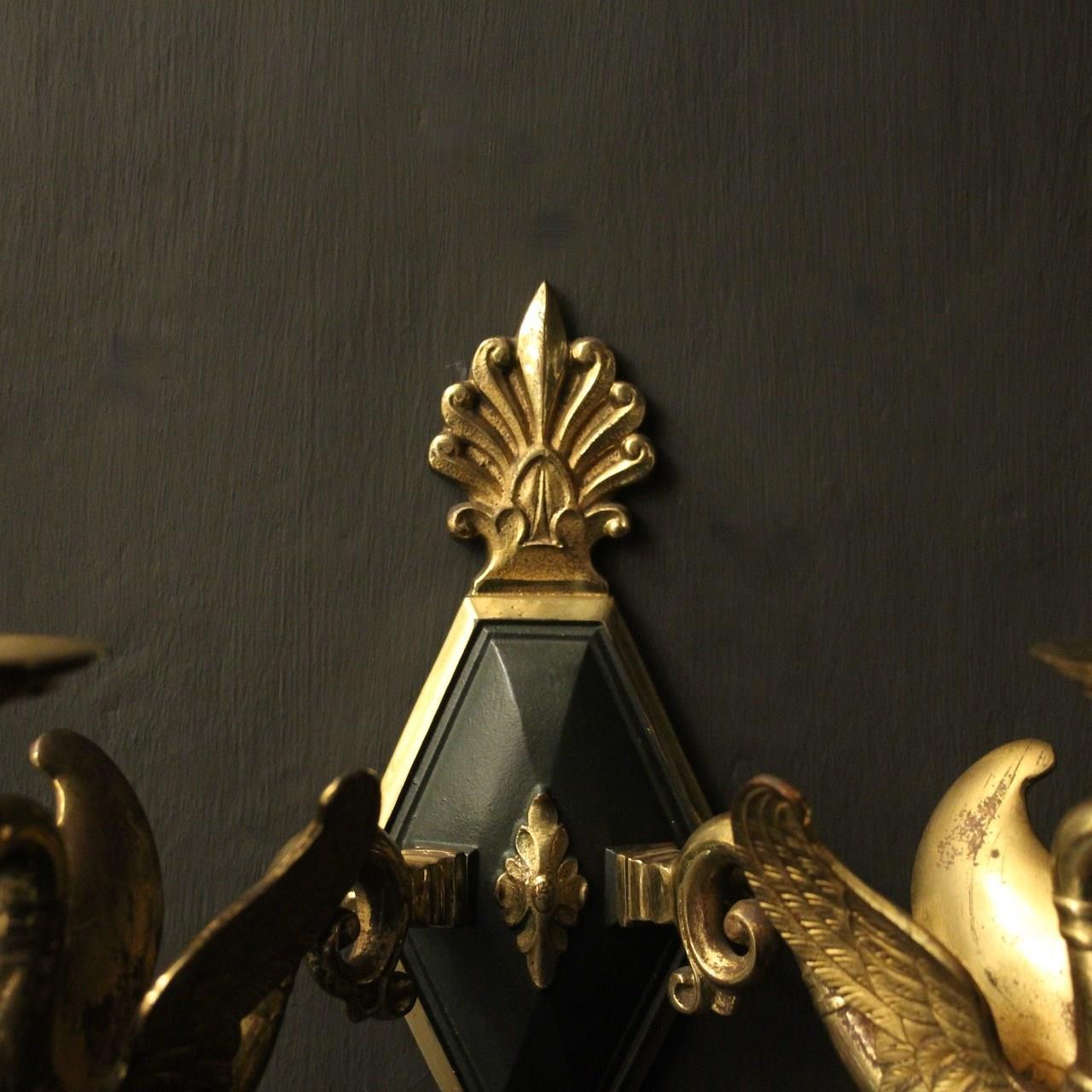 A French pair of Empire gilded bronze twin arm antique wall lights, the ornate winged swan headed scrolling arms with trumpet scalloped bobeche drip pans, issuing from a central decorative lozenge black enamelled backplate with Anthemion finial and terminal, nice original patination and well cast. Fully rewired and PAT tested. All our wall lights come with aged brass screws for fixing and spare bulbs.
