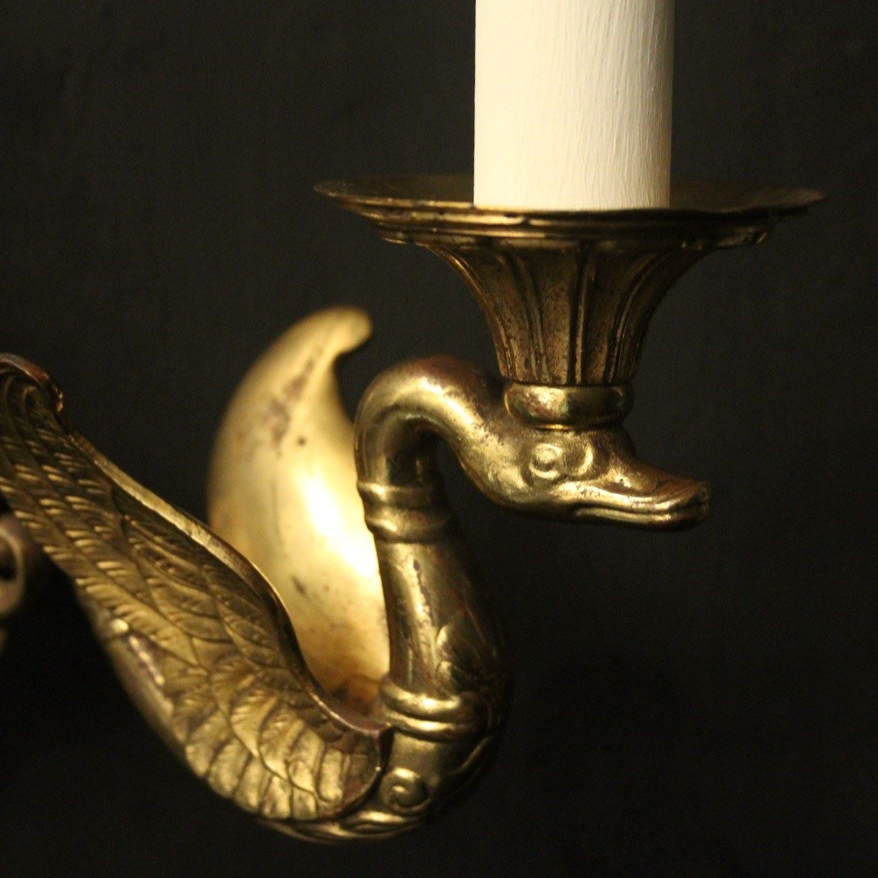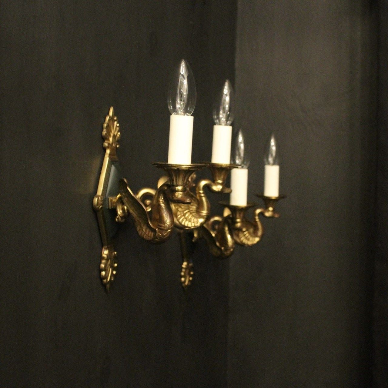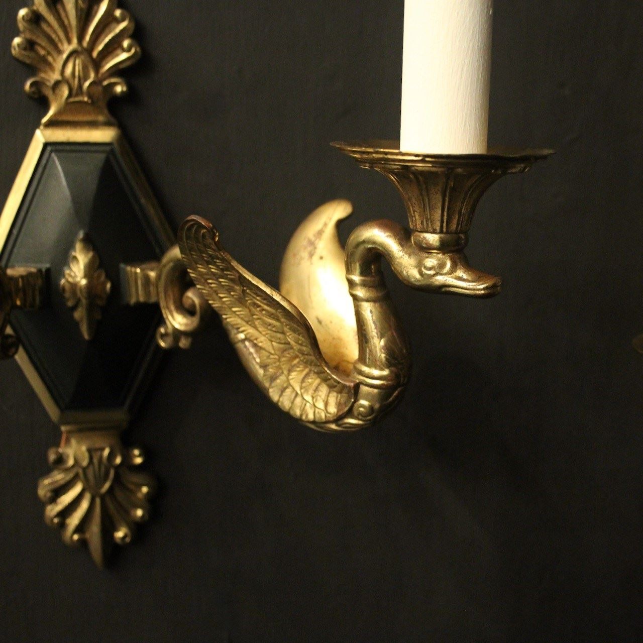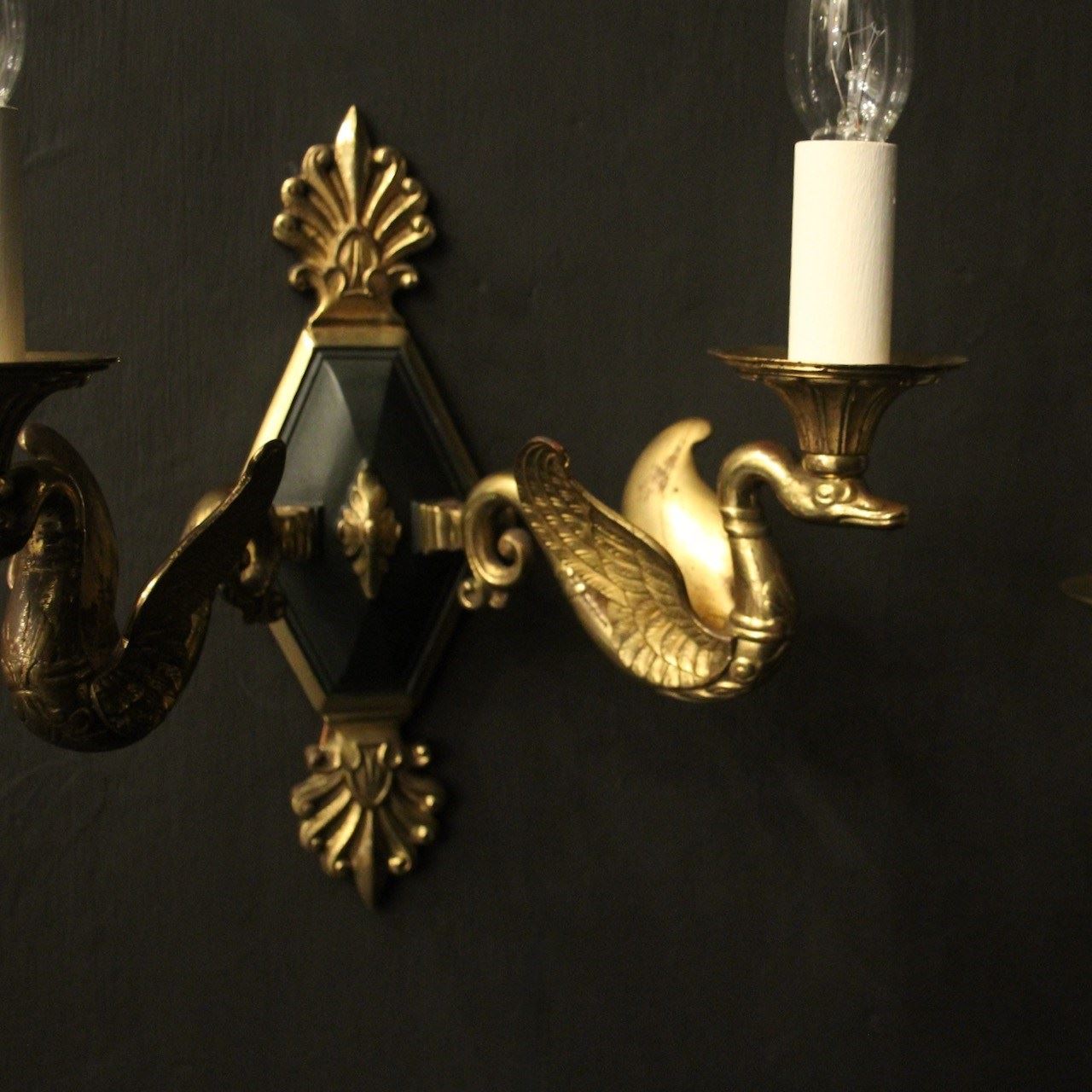 A French pair of Empire gilded bronze twin arm antique wall lights, the ornate winged swan headed scrolling arms with trumpet scalloped bobeche drip pans, issuing from a central decorative lozenge black enamelled backplate with Anthemion finial and terminal, nice original patination and well cast. Fully rewired and PAT tested. All our wall lights come with aged brass screws for fixing and spare bulbs.