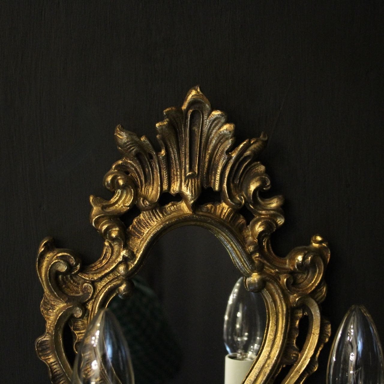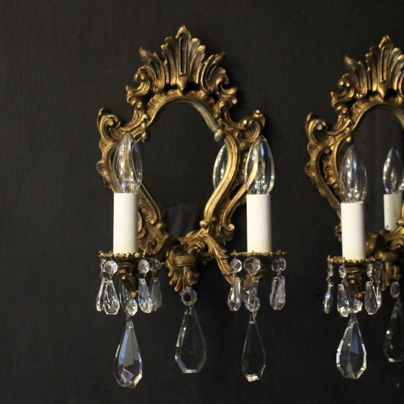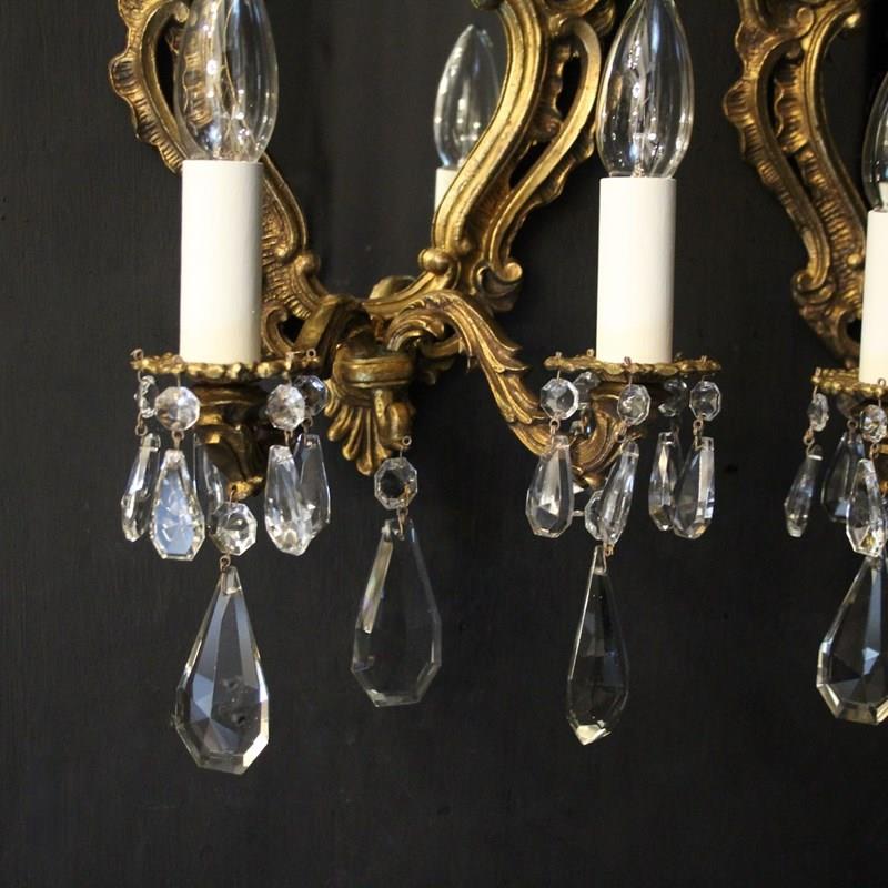 A French pair of gilded bronze twin arm antique girandoles, the ornate leaf scrolling arms with foliated bobeche drip pans and bulbous candle sconces, issuing from a cartouche leaf mirrored backplate and decorated with faceted crystal pendants, nice crisp gilded patination. Fully rewired and PAT tested. All our wall lights come with aged brass screws or brackets for fixing and spare bulbs.