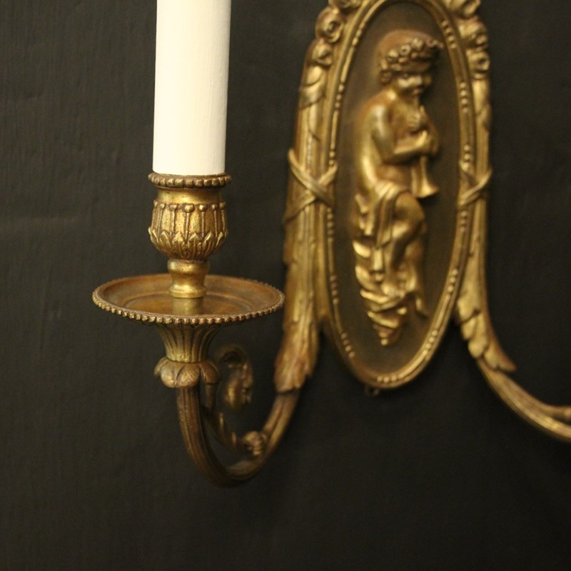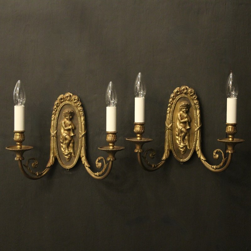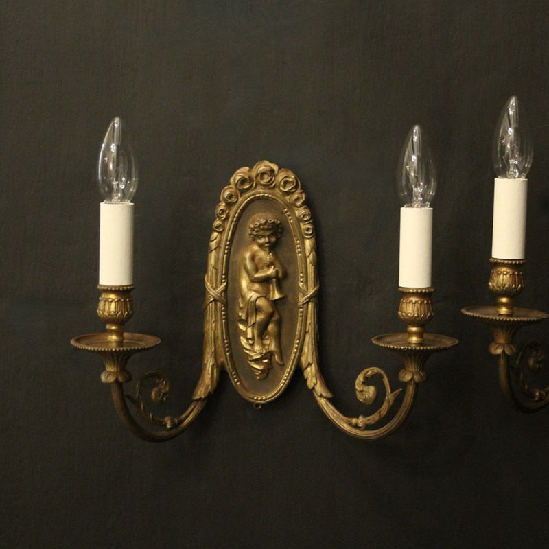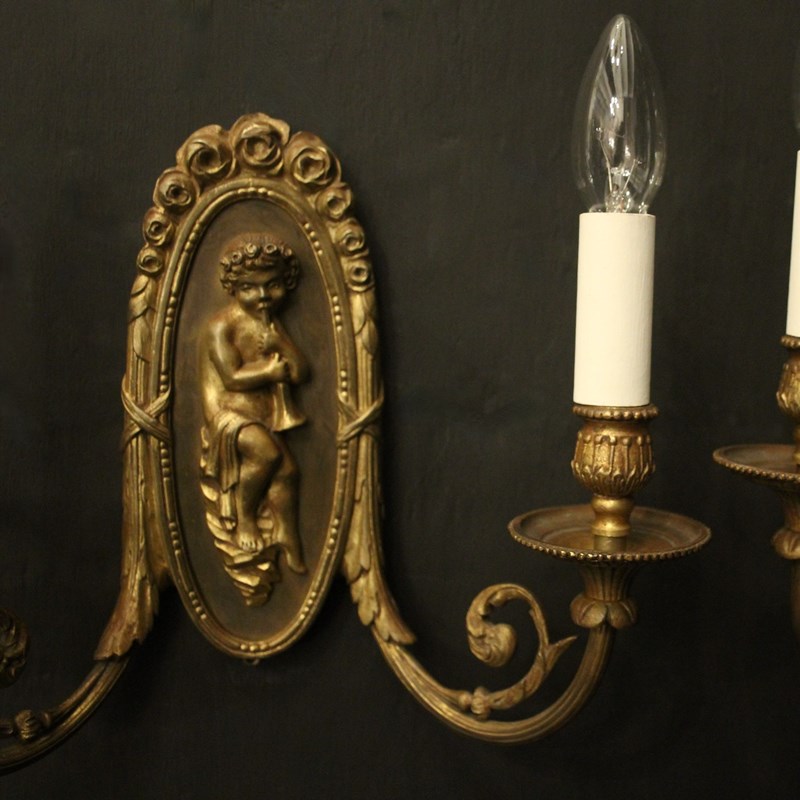 A French pair of gilded brass twin arm antique wall lights, the reeded scrolling arms with trumpet millgrain bobeche drip pans and bulbous candle sconces, issuing from an oval backplate with decorative rose final and central cherubs. Fully rewired and PAT tested. All our wall lights come with aged brass screws or brackets for fixing and spare bulbs.