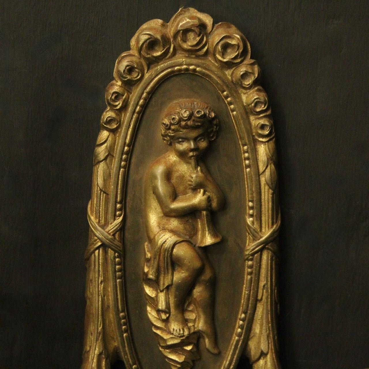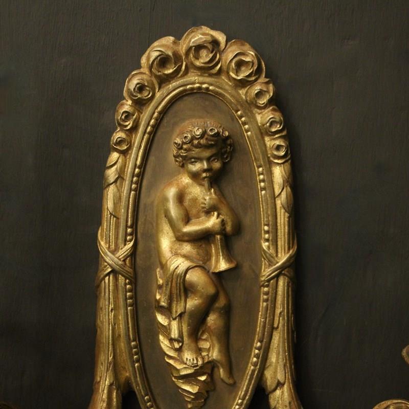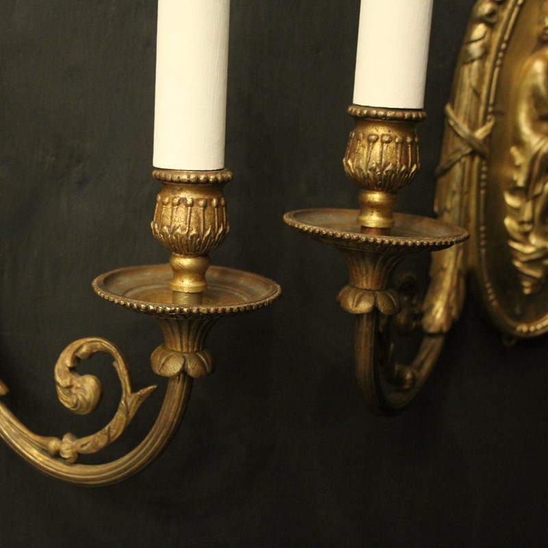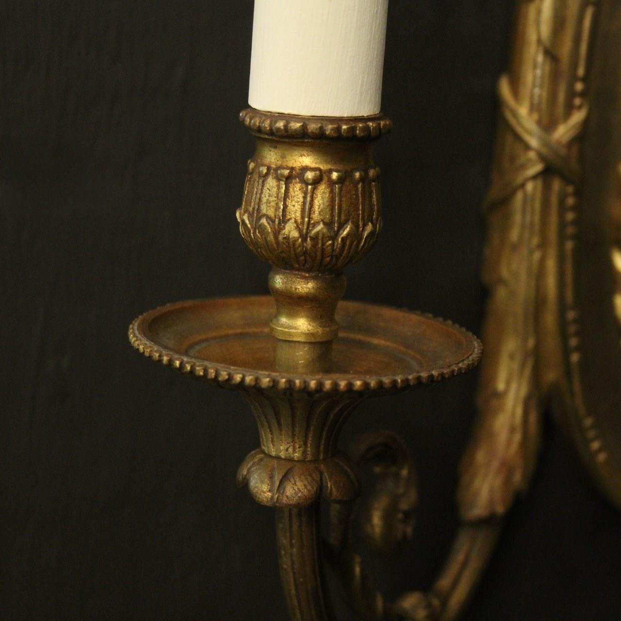 A French pair of gilded brass twin arm antique wall lights, the reeded scrolling arms with trumpet millgrain bobeche drip pans and bulbous candle sconces, issuing from an oval backplate with decorative rose final and central cherubs. Fully rewired and PAT tested. All our wall lights come with aged brass screws or brackets for fixing and spare bulbs.