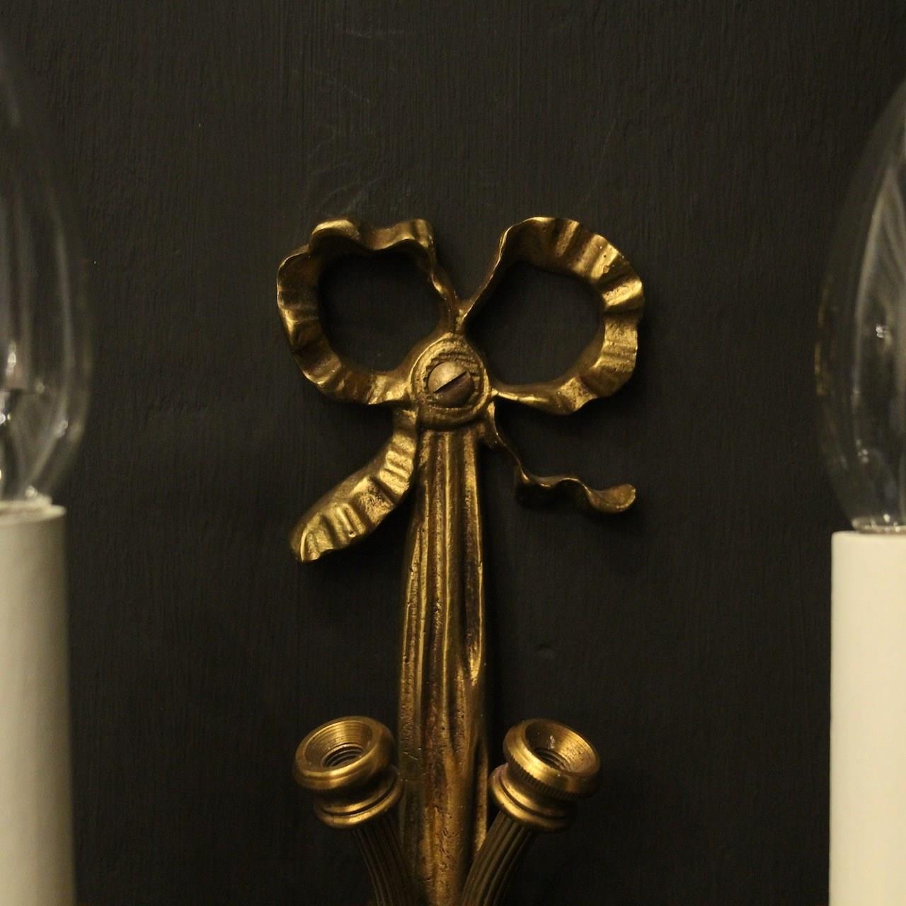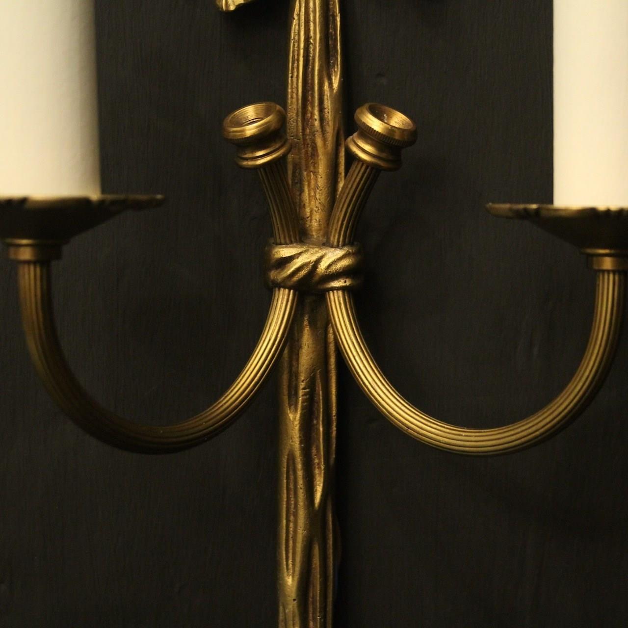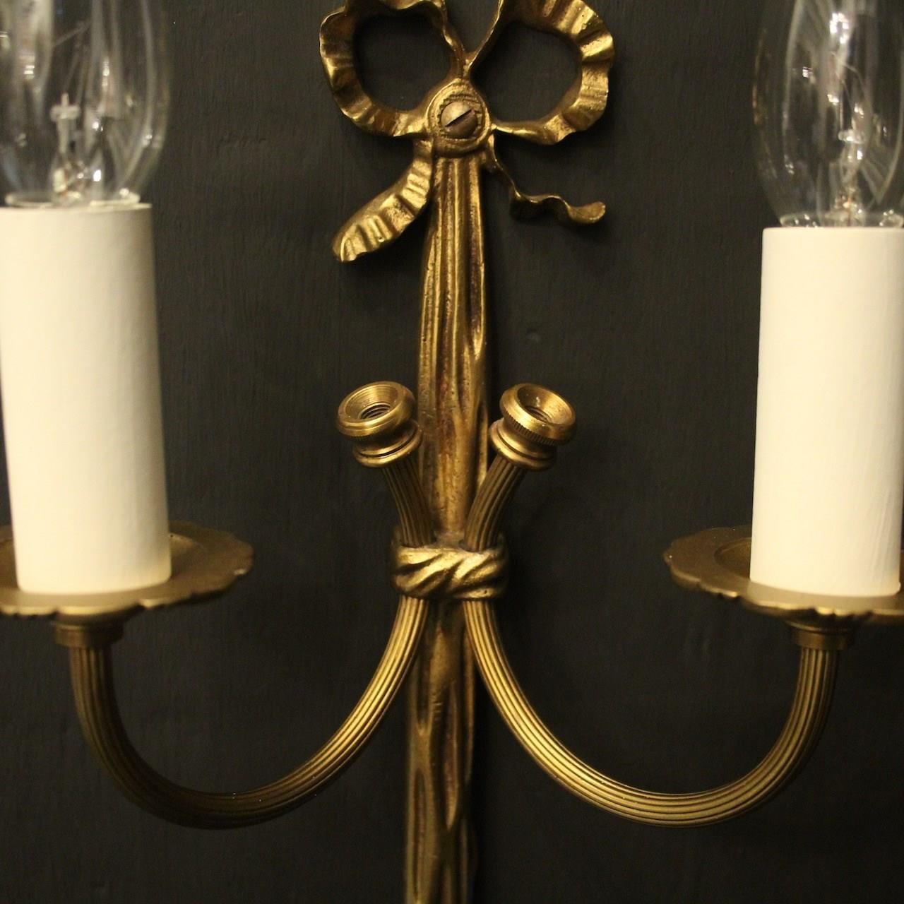 A small French pair of gilded brass twin arm wall lights, the reeded scrolling arms with circular leaf bobeche drip pans, issuing from a decoratively cast elongated rope backplate and pierced ribbon finial, good small scale. Fully rewired and PAT tested. All our wall lights come with aged brass screws for fixing and spare bulbs.